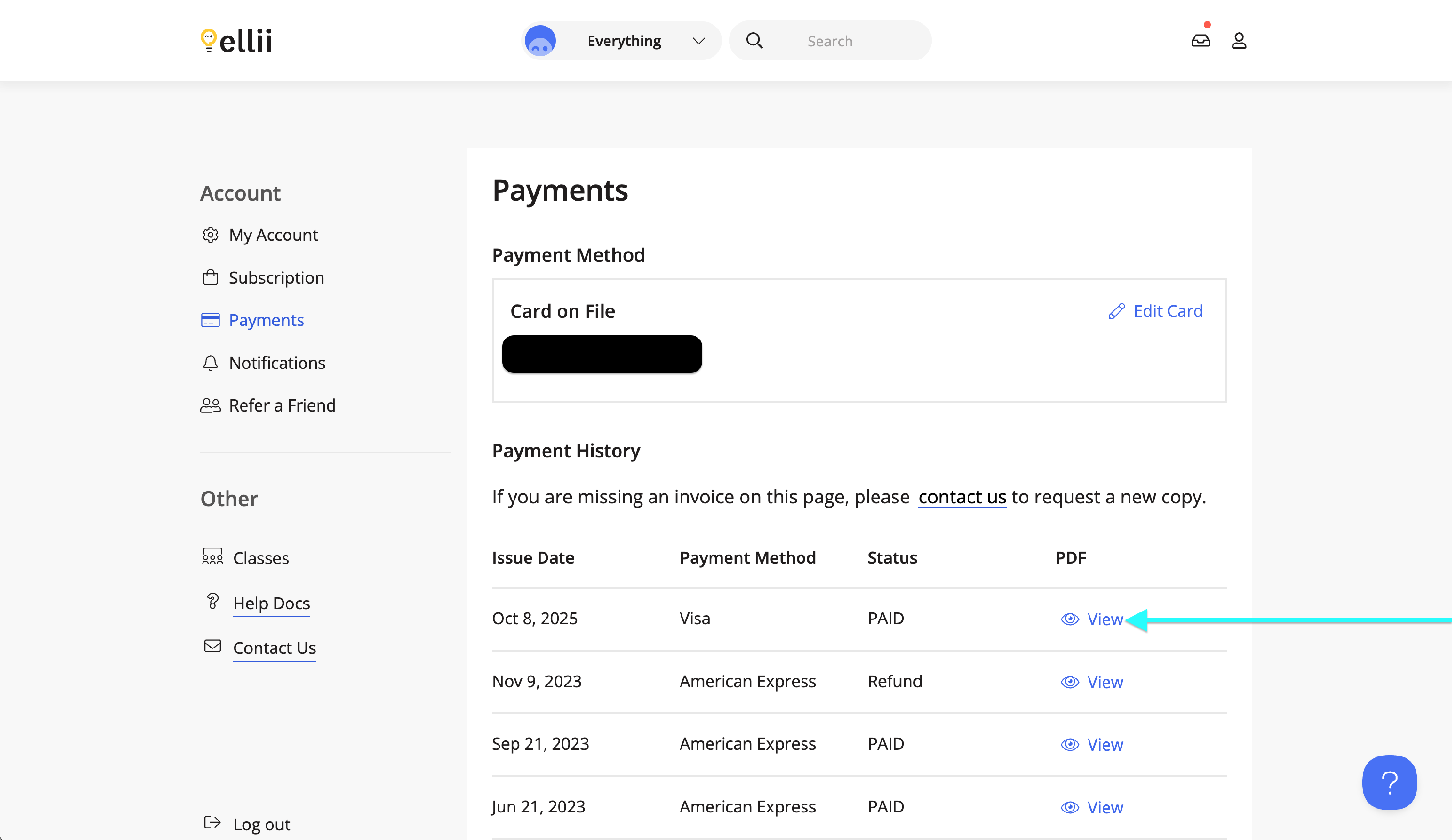 View all available invoice receipts by clicking the View button next to each transaction. Each PDF will be a separate transaction receipt.