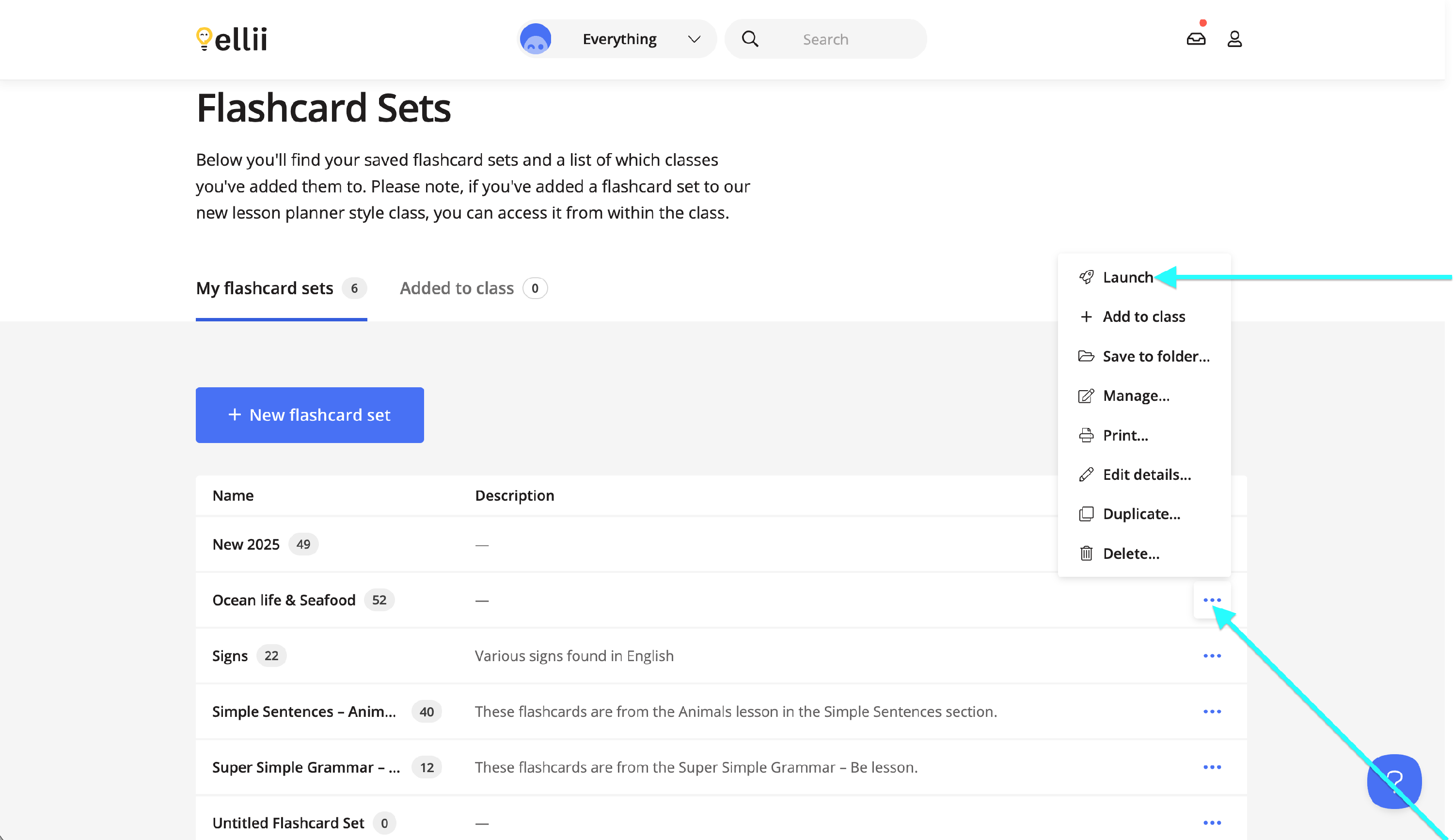 B) If you saved the flashcards to an existing flashcard set, you will be taken to the Flashcard Sets page. From here, you can click on the More Options (...) menu by the set you want to use and select Launch to start the Flashcard Player.