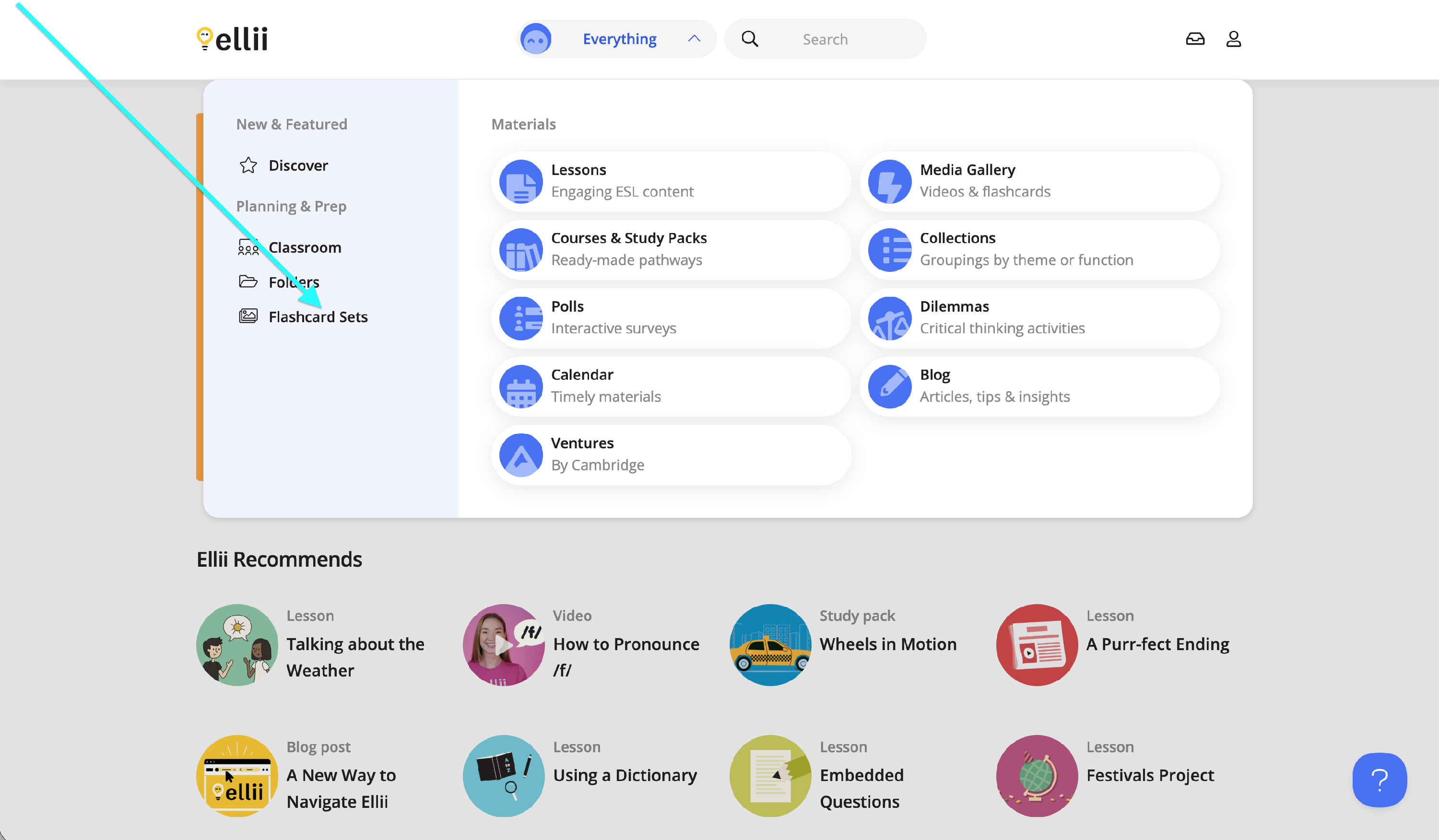 You can also access your flashcard sets by clicking on the Everything menu then choosing Flashcard Sets.