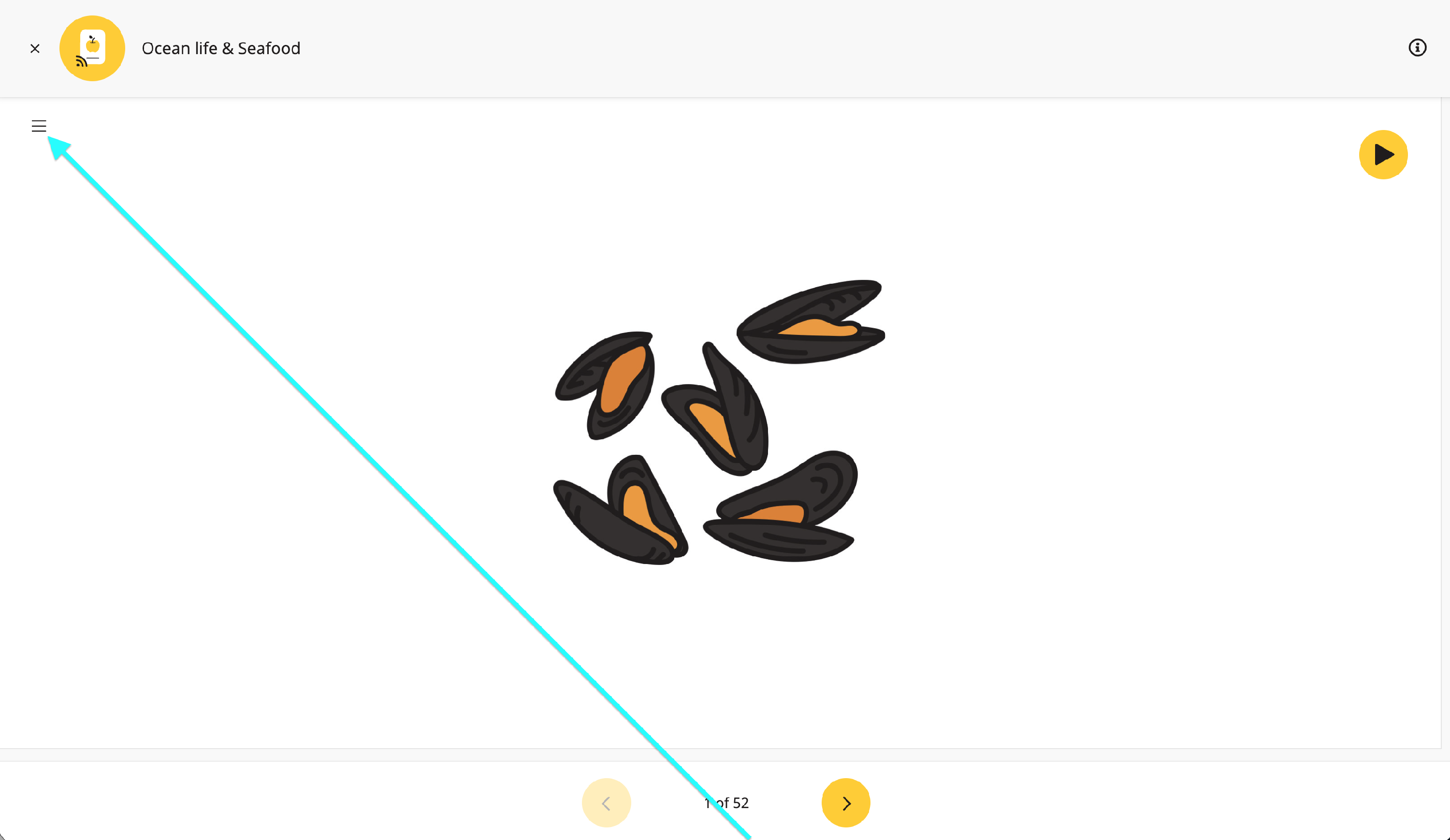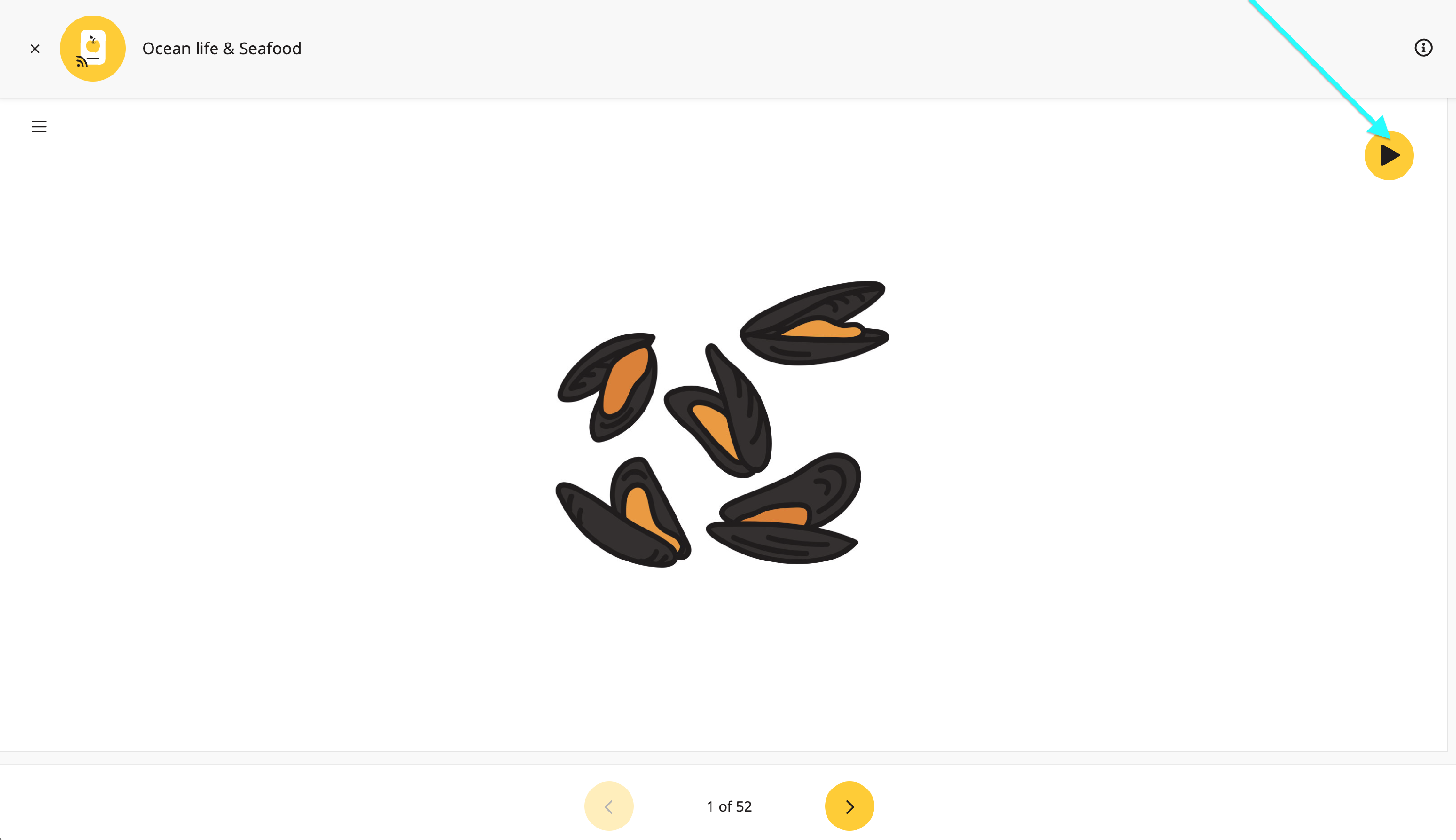 You can also click on the Play button on the top right of the flashcard to play an audio recording of the word.