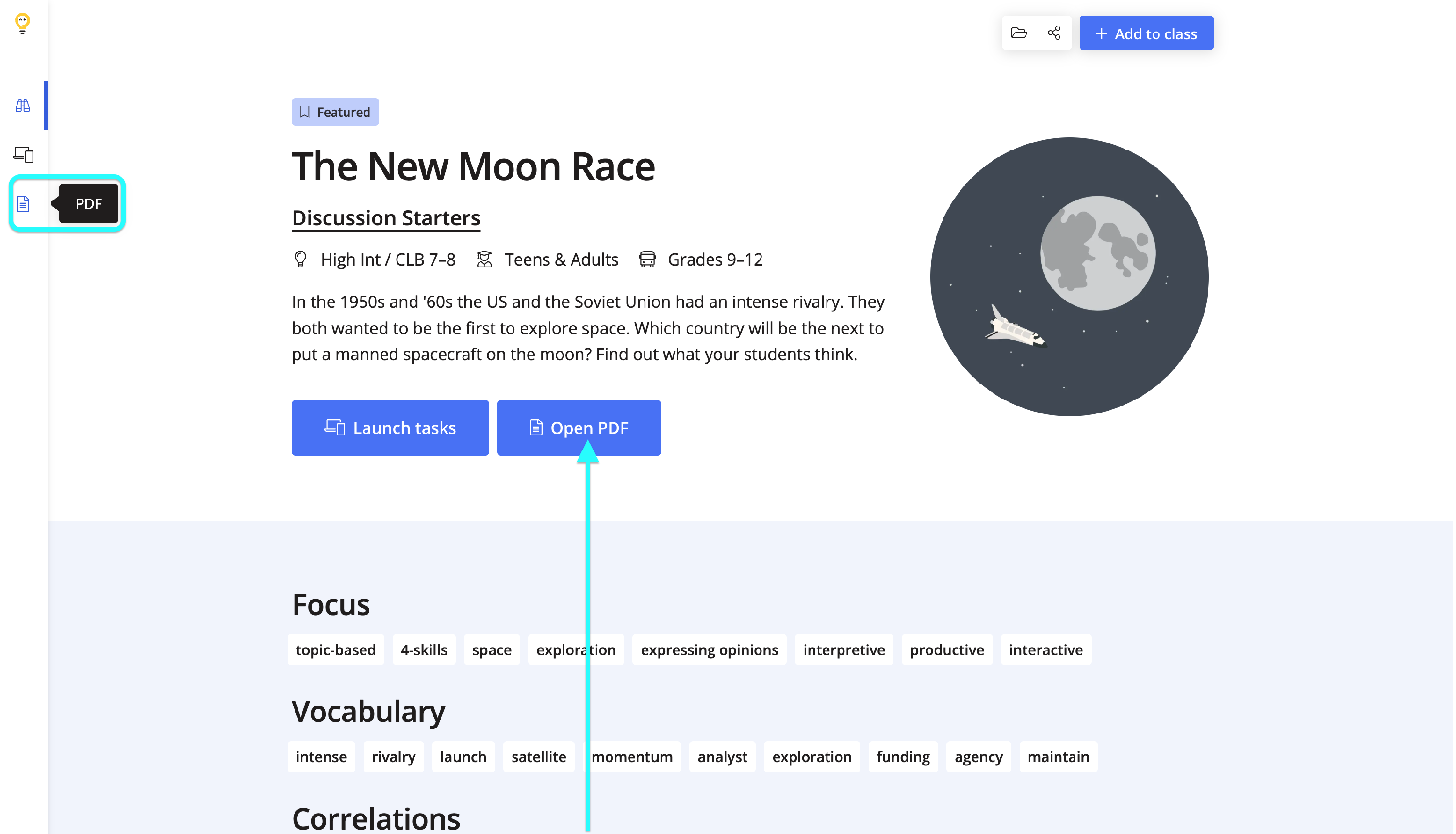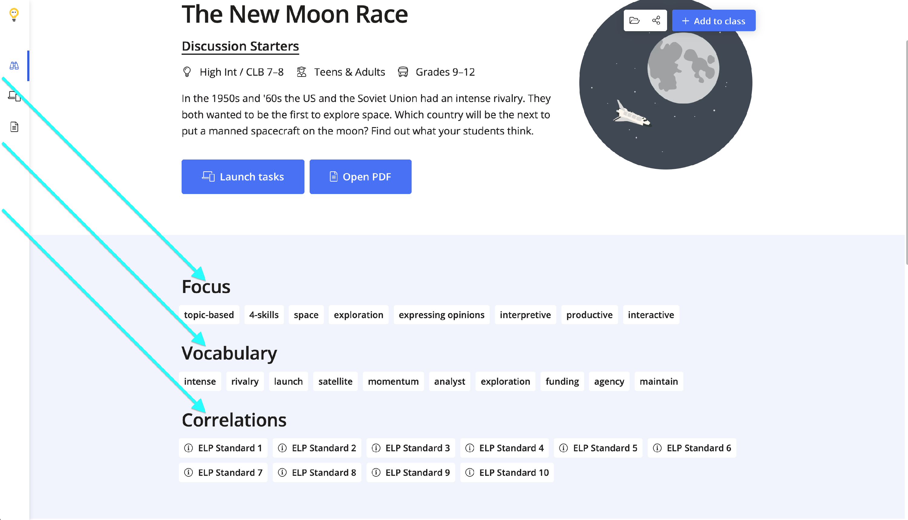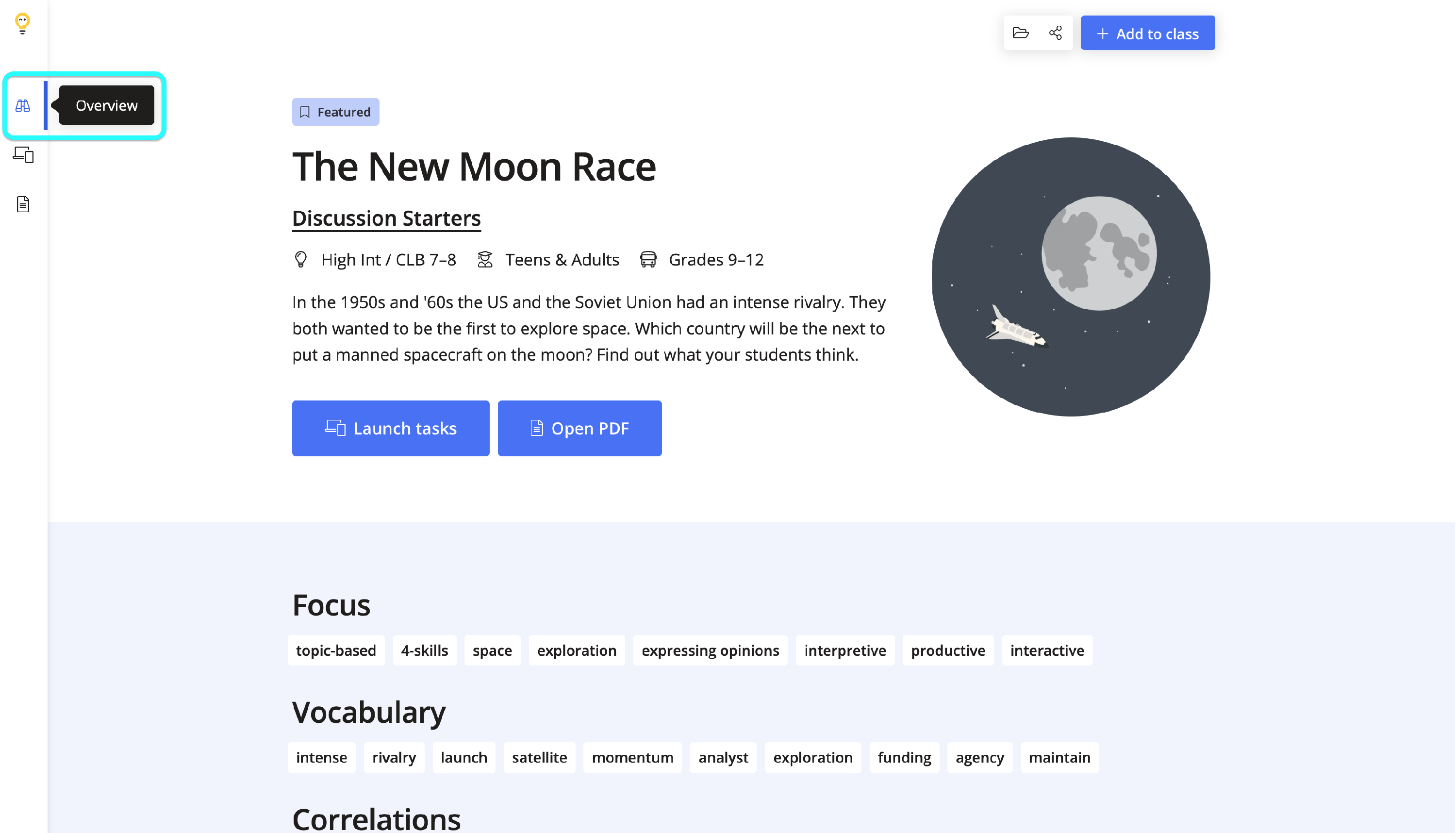 The Overview page will also contain the Focus, Vocabulary and Correlations for the lesson.
