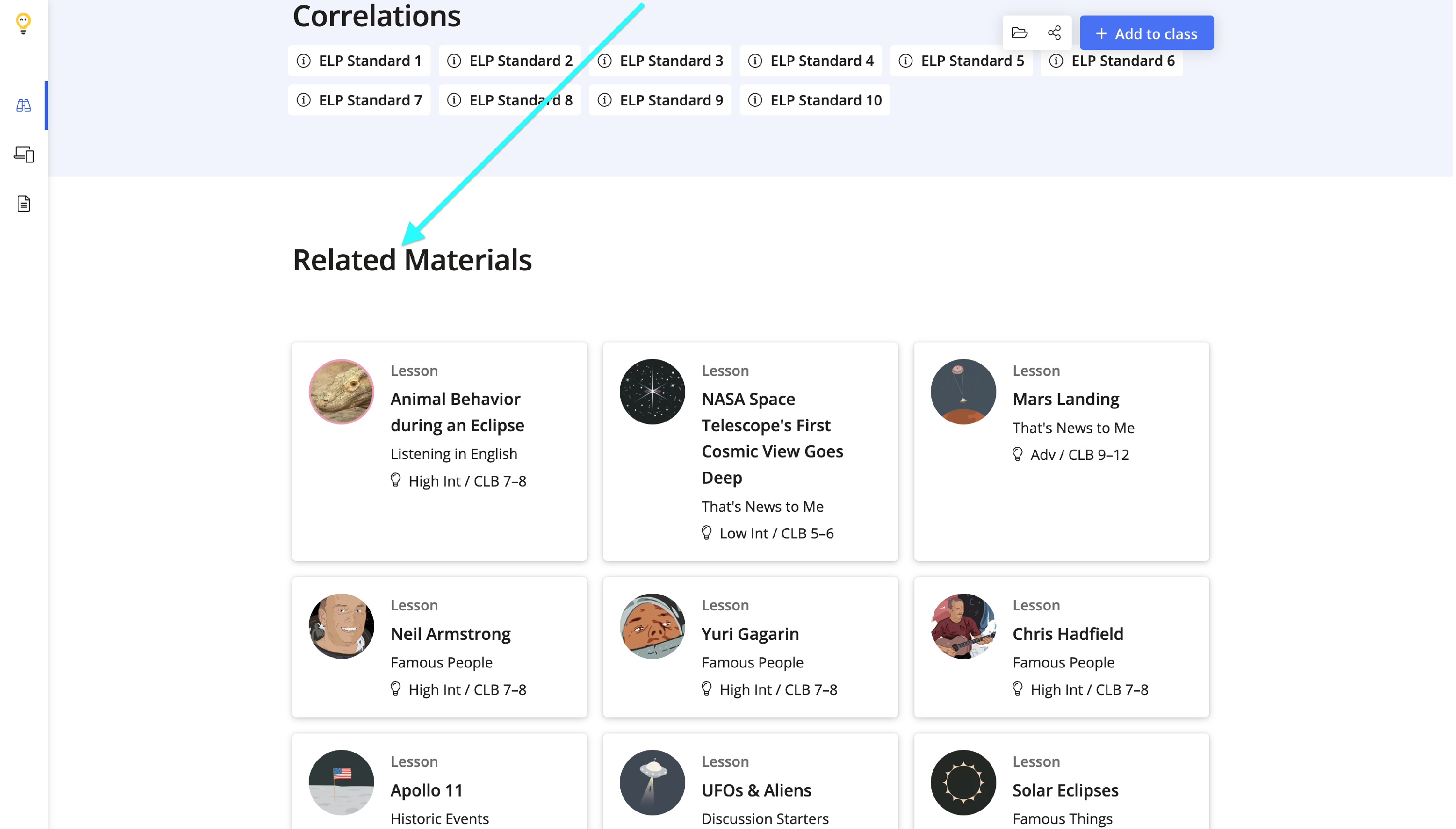 Related materials will be shown at the bottom of the lesson page for teachers to explore.