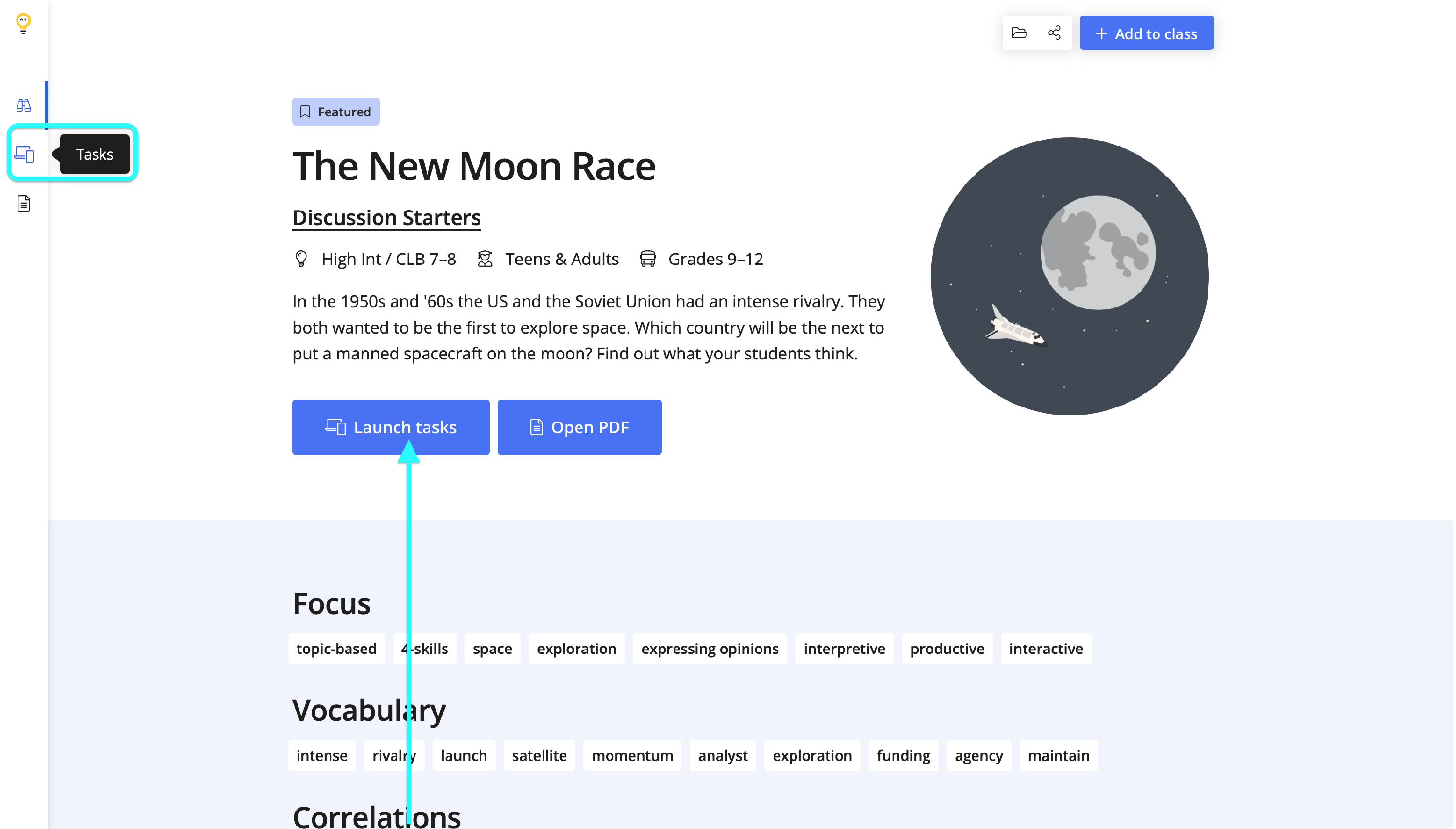 To preview the tasks for the lesson or screenshare with students, teachers will click on the Tasks icon or the Launch Tasks button.