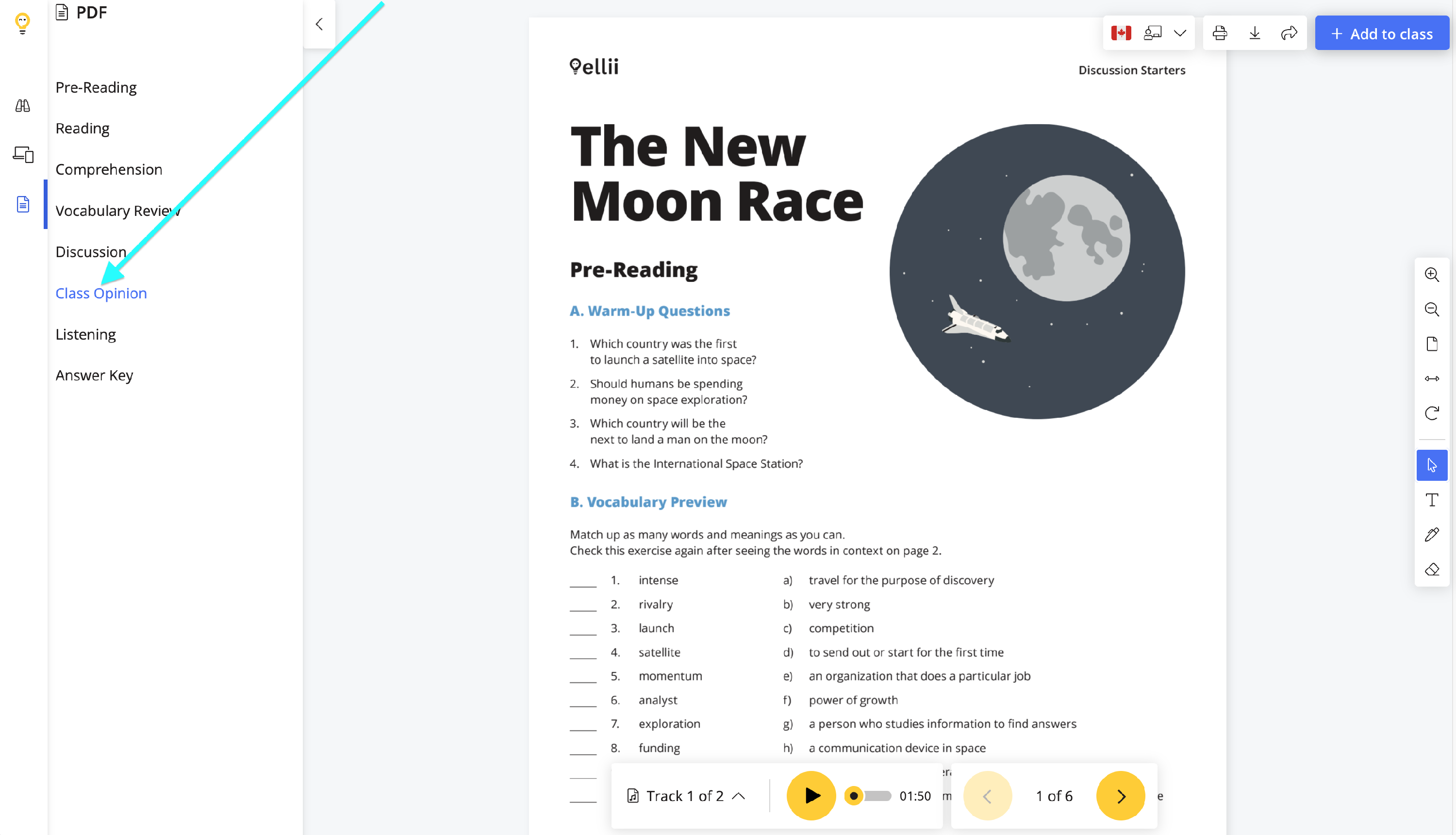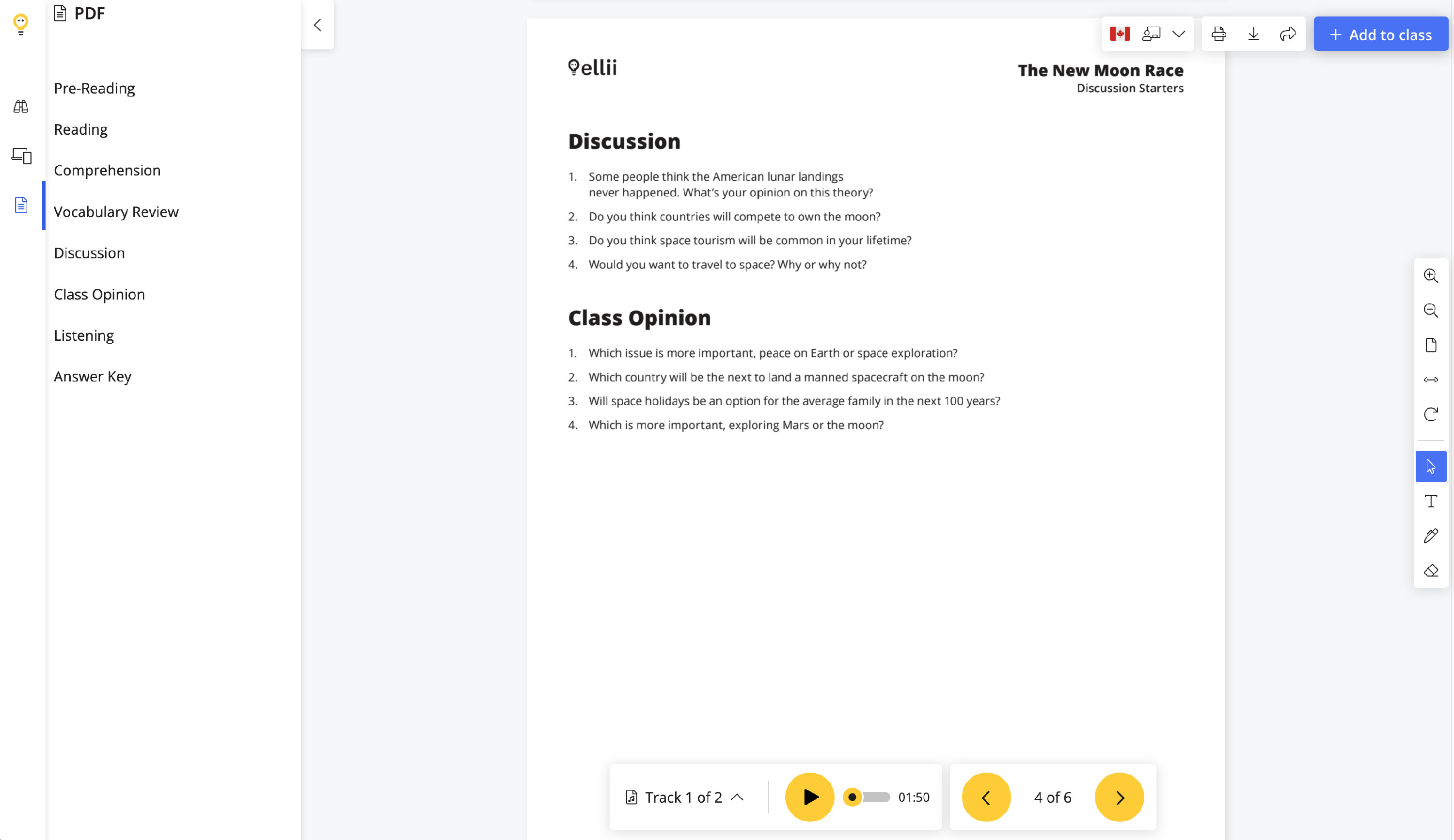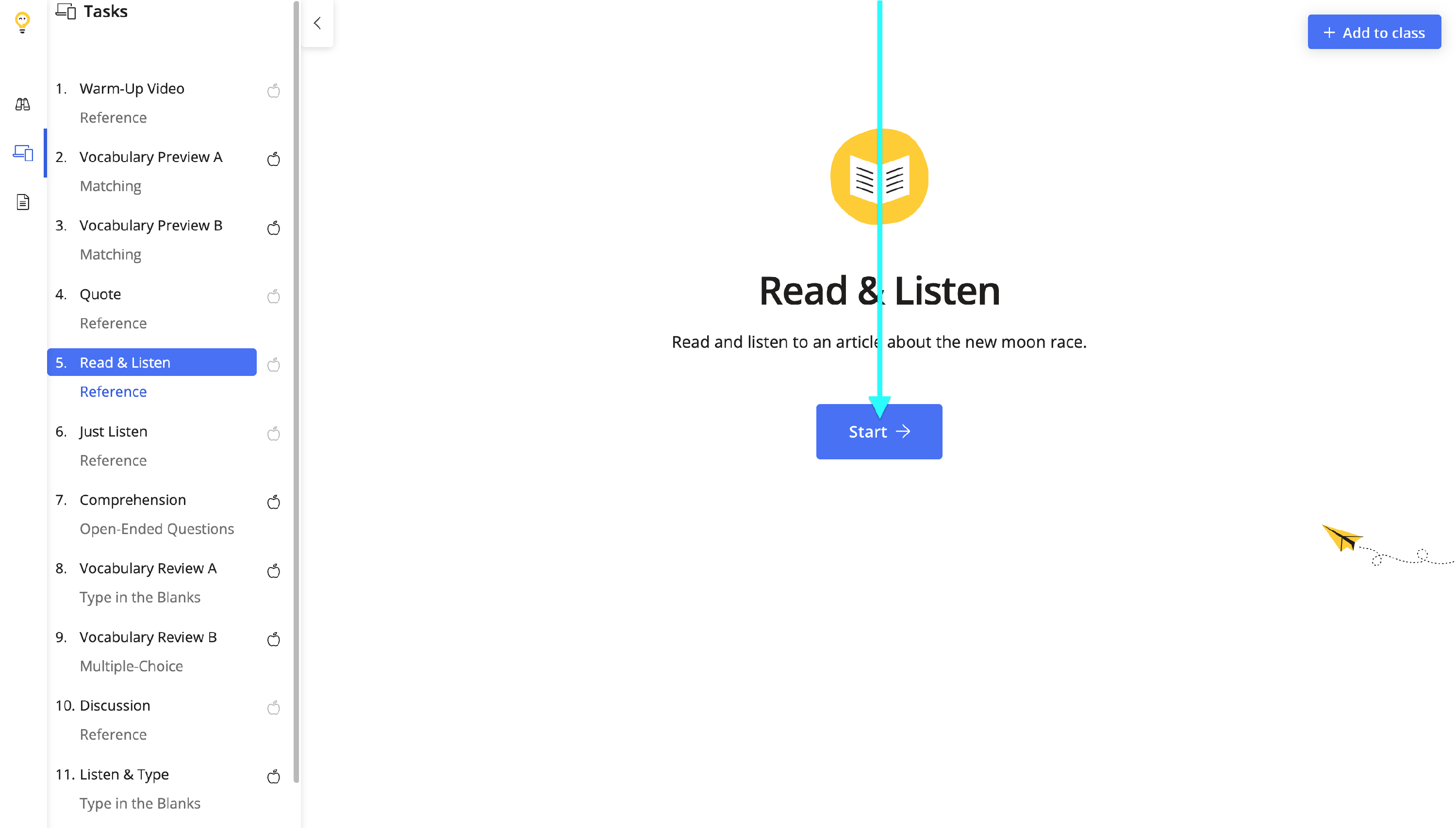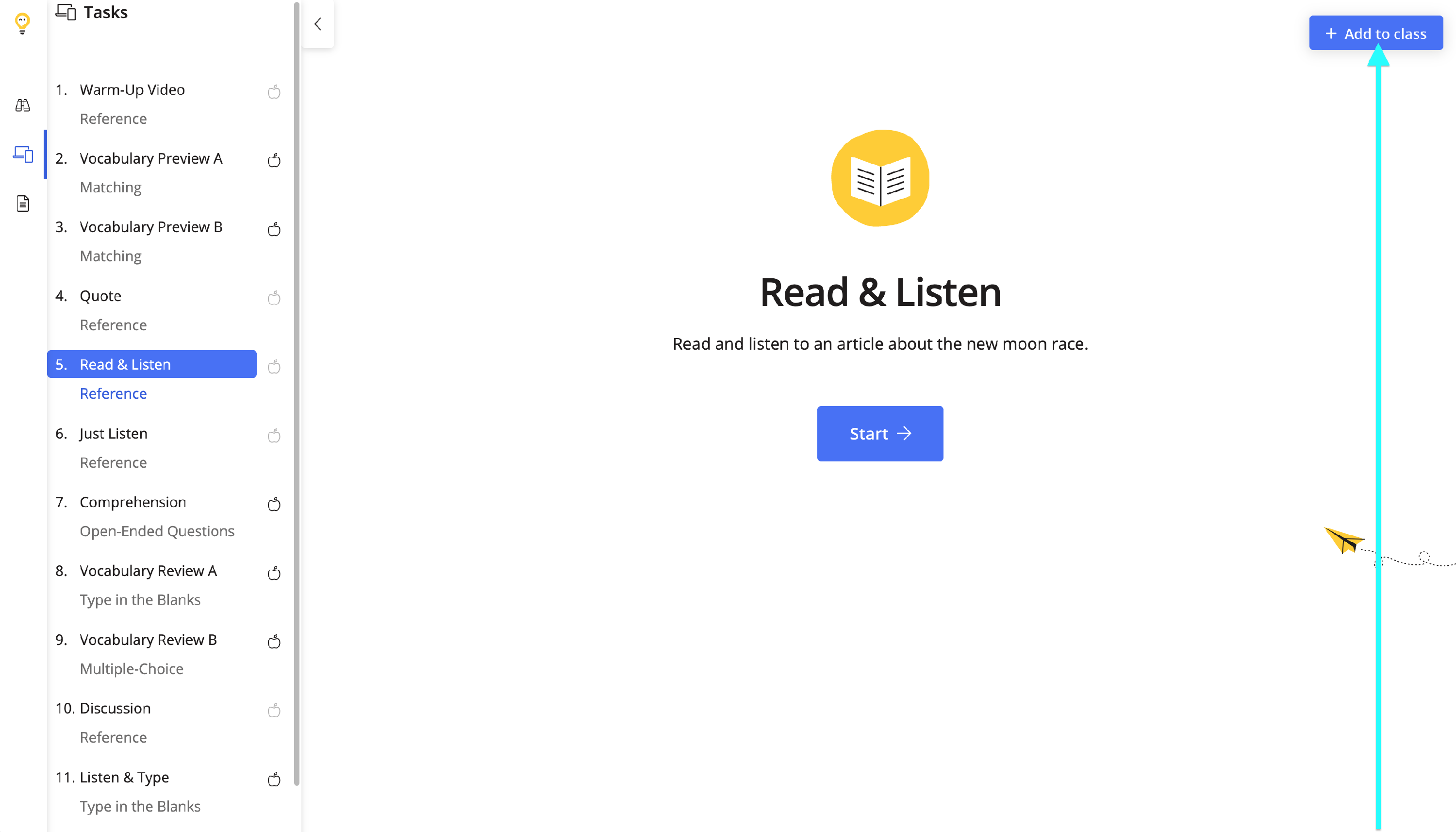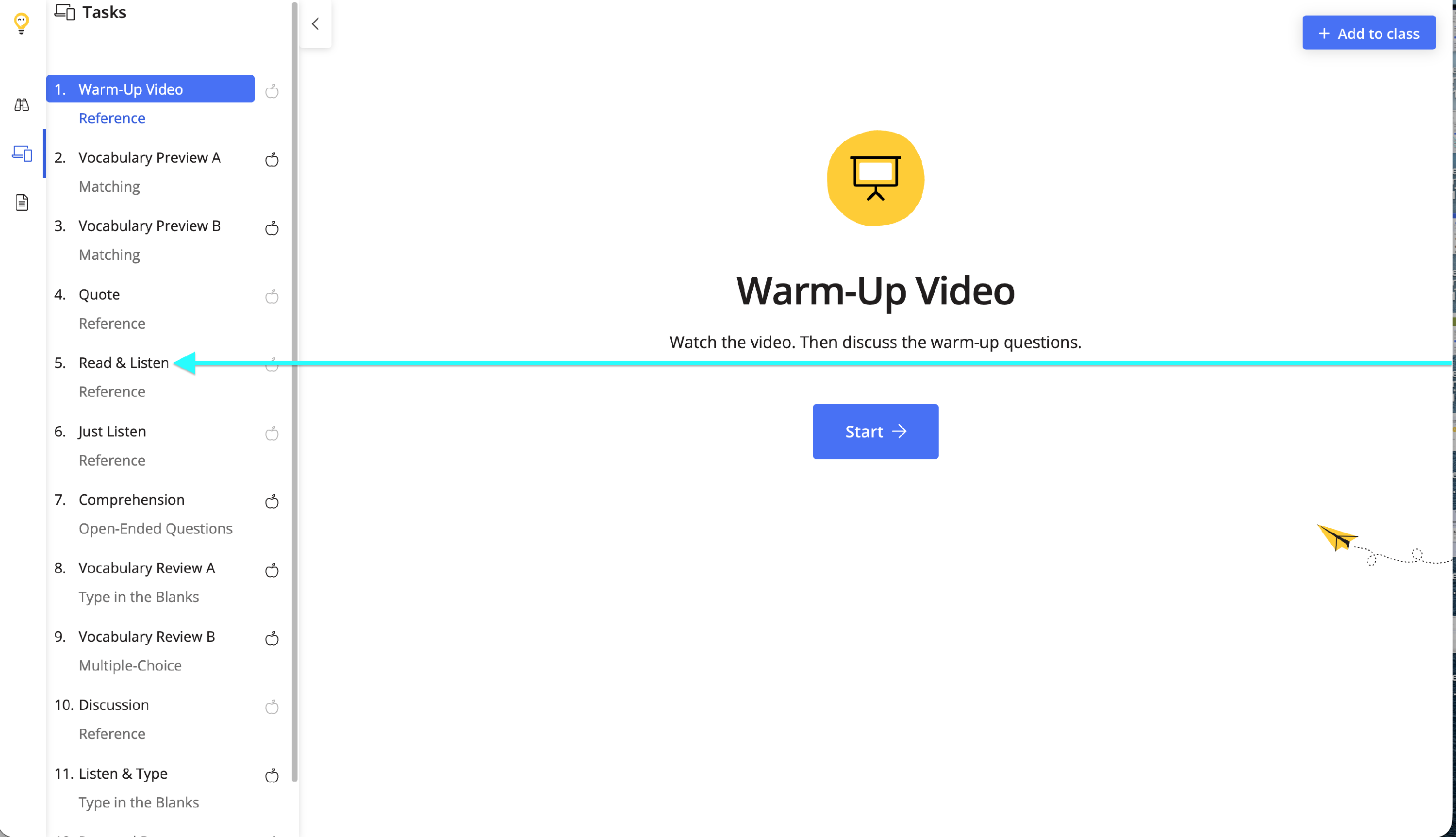Clicking on Add to class will send the lesson as digital homework to students.