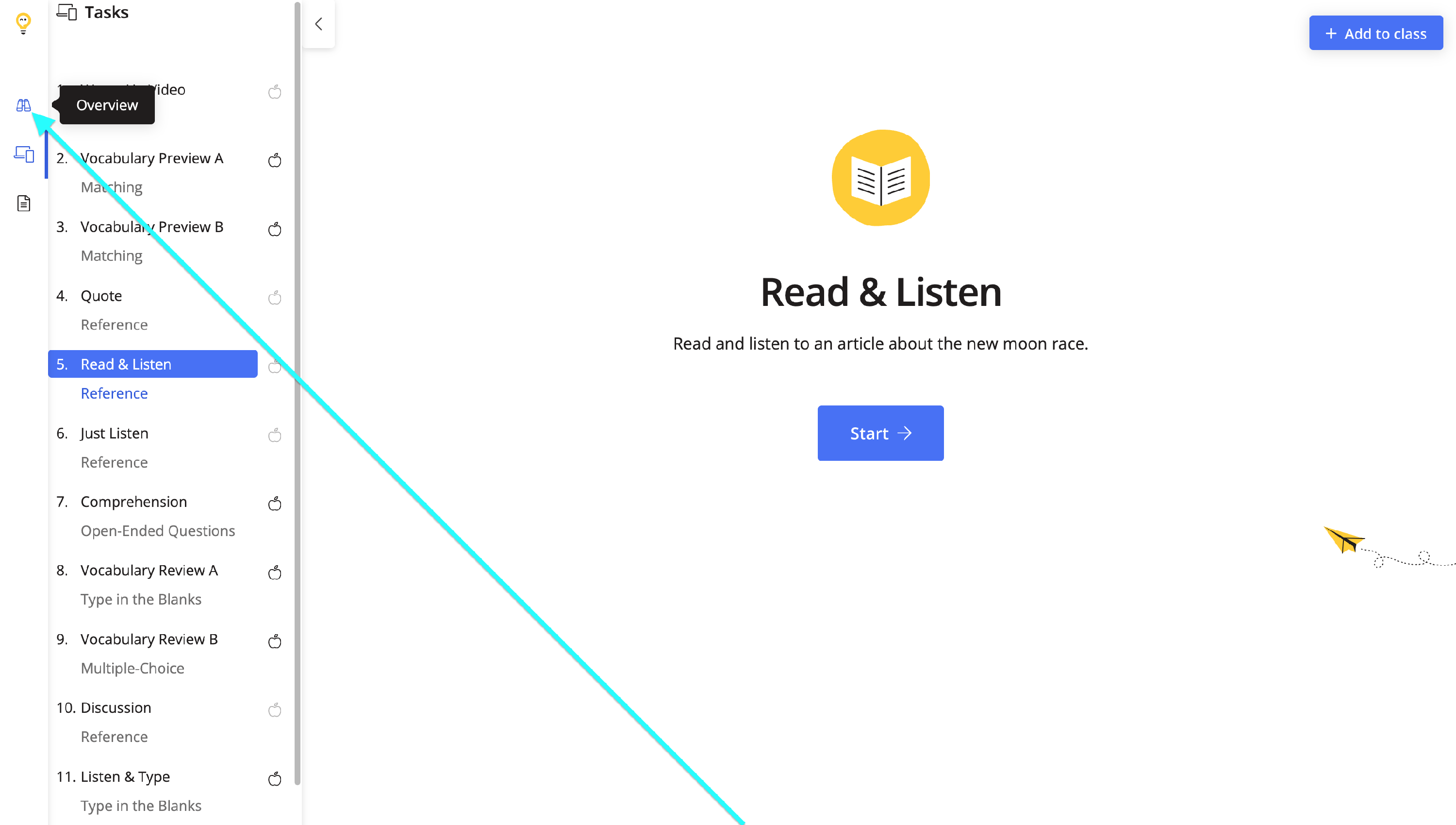 Clicking the Overview icon will bring teachers back to the lesson page.