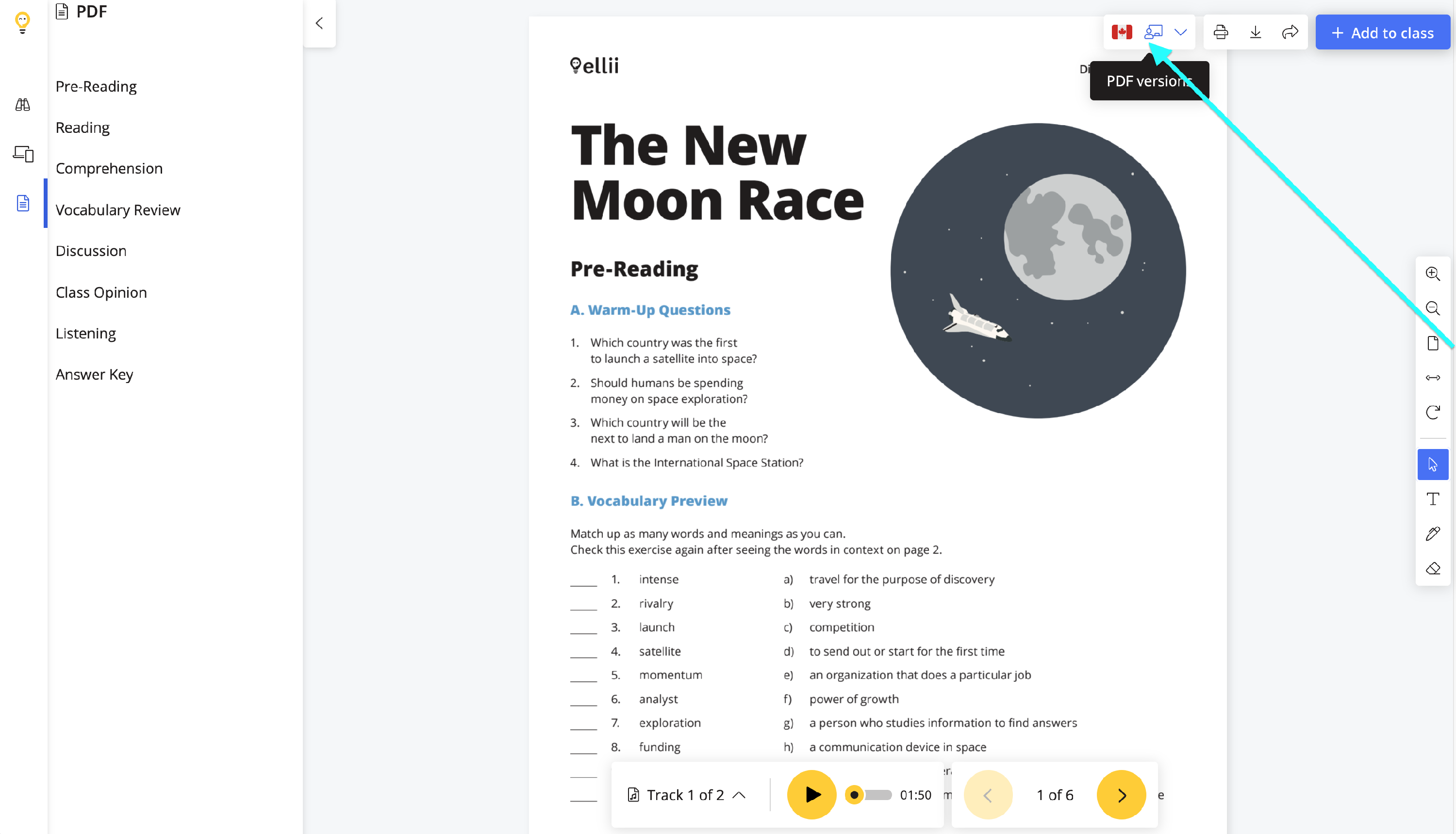 Note: The PDF Versions drop-down menu allows teachers to select the version of English (US, Canadian, or British) as well as the teacher or student version (the student version does not contain the Answer Key).