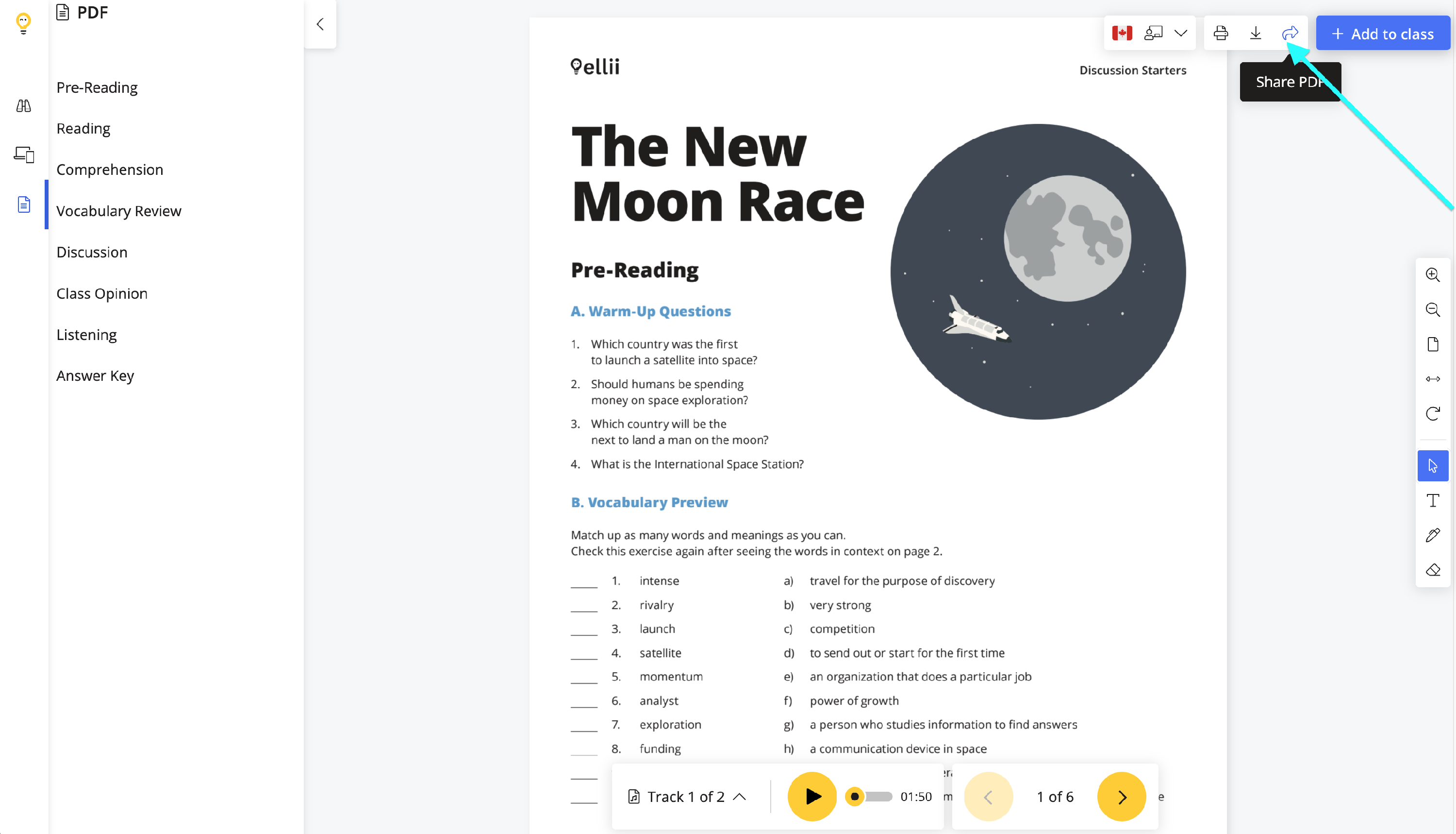 To share the PDF link with students, teachers will click on the Share PDF icon.