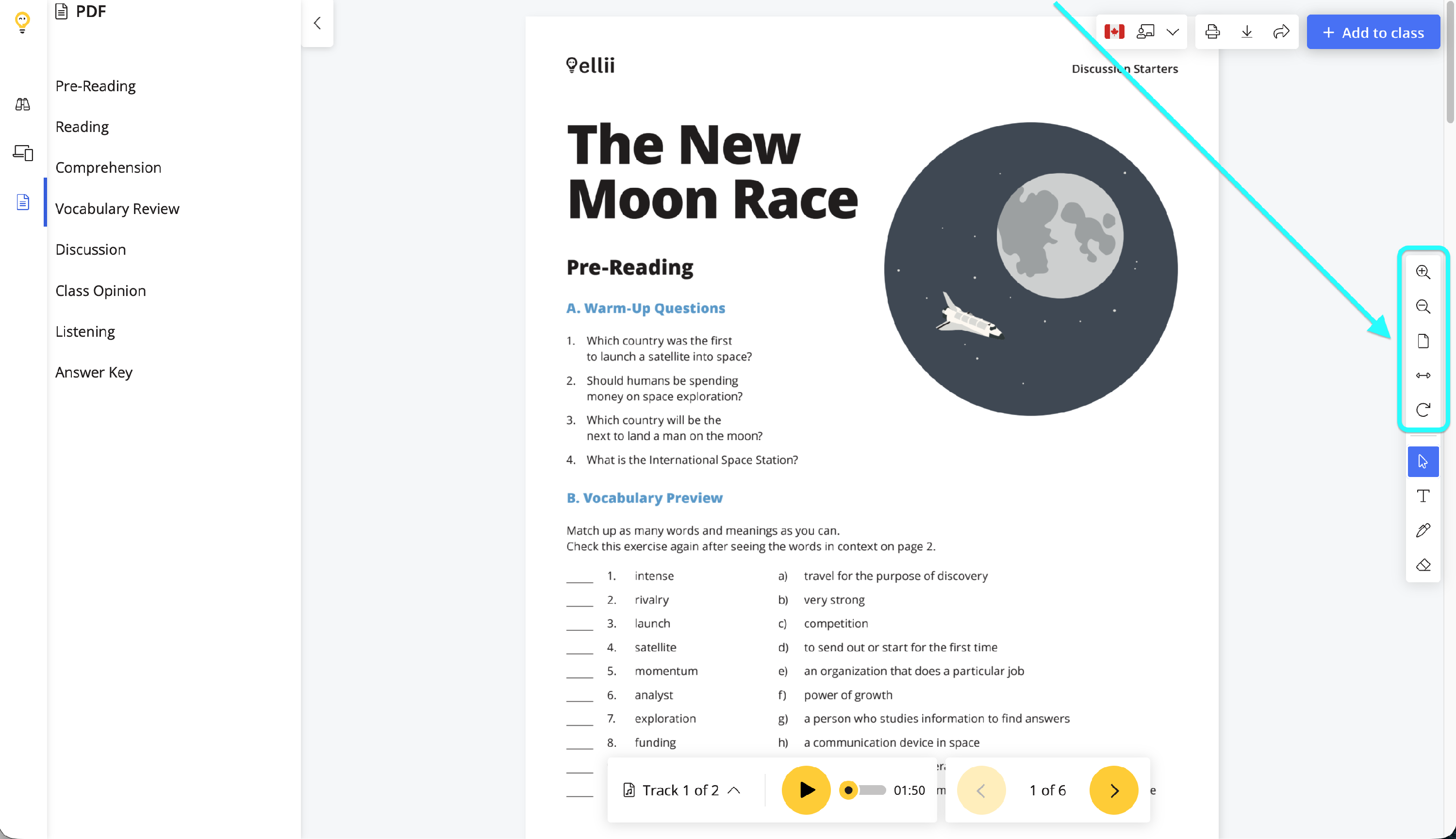 Teachers can Zoom In/Out, Fit Page, Fit Width, or Rotate Page by selecting the appropriate icon on the PDF toolbar.