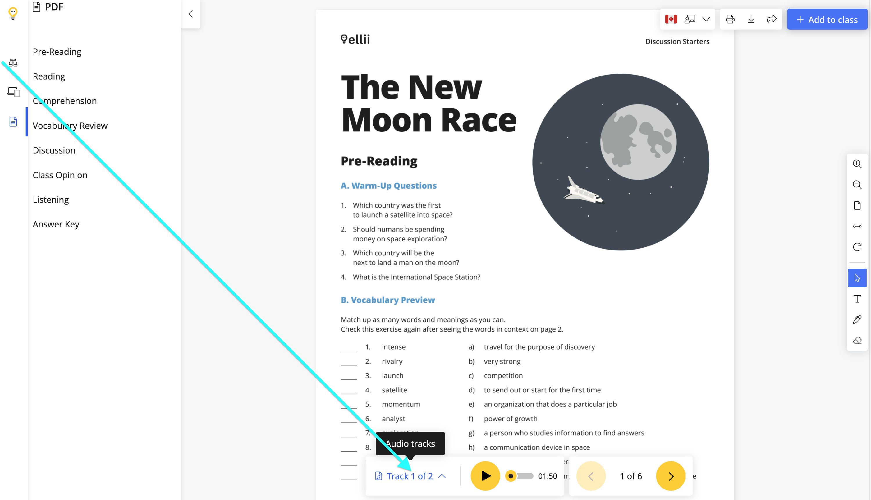 To select an audio track, teachers will click on the Audio tracks button.