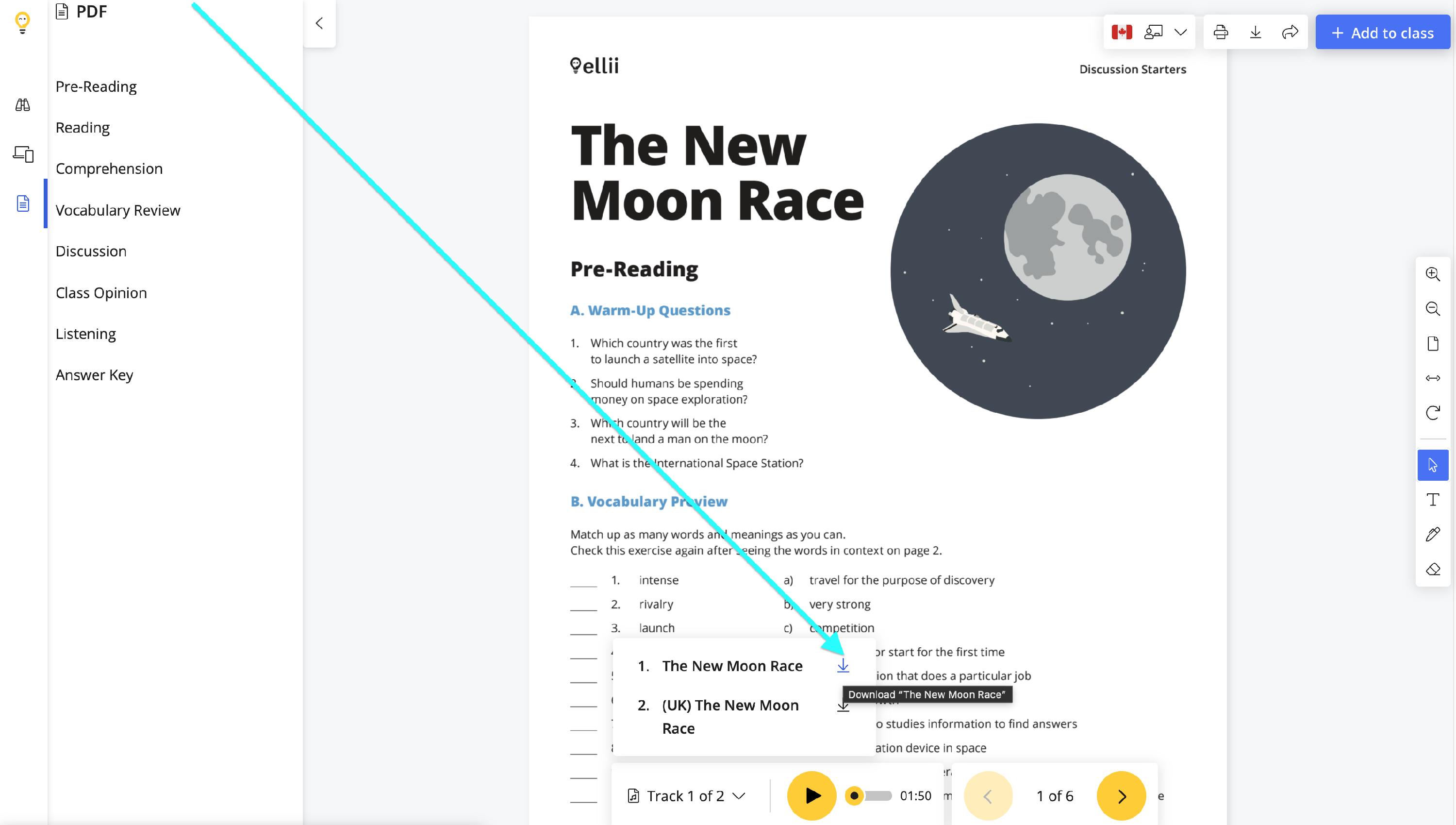 Teachers can download the audio files by clicking on the Download icon.