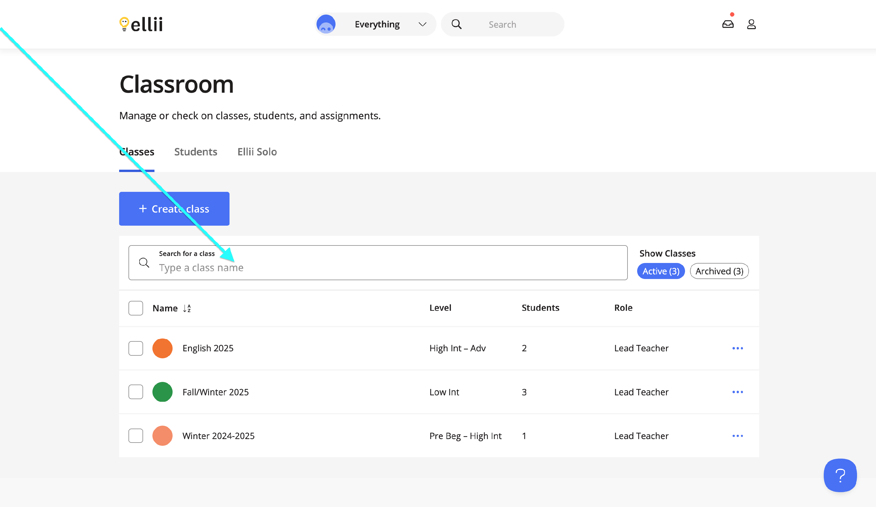 On the Classes page, you will see a list all of your classes. You can search for a class using the search tool or filter the classes by Active or Archived.