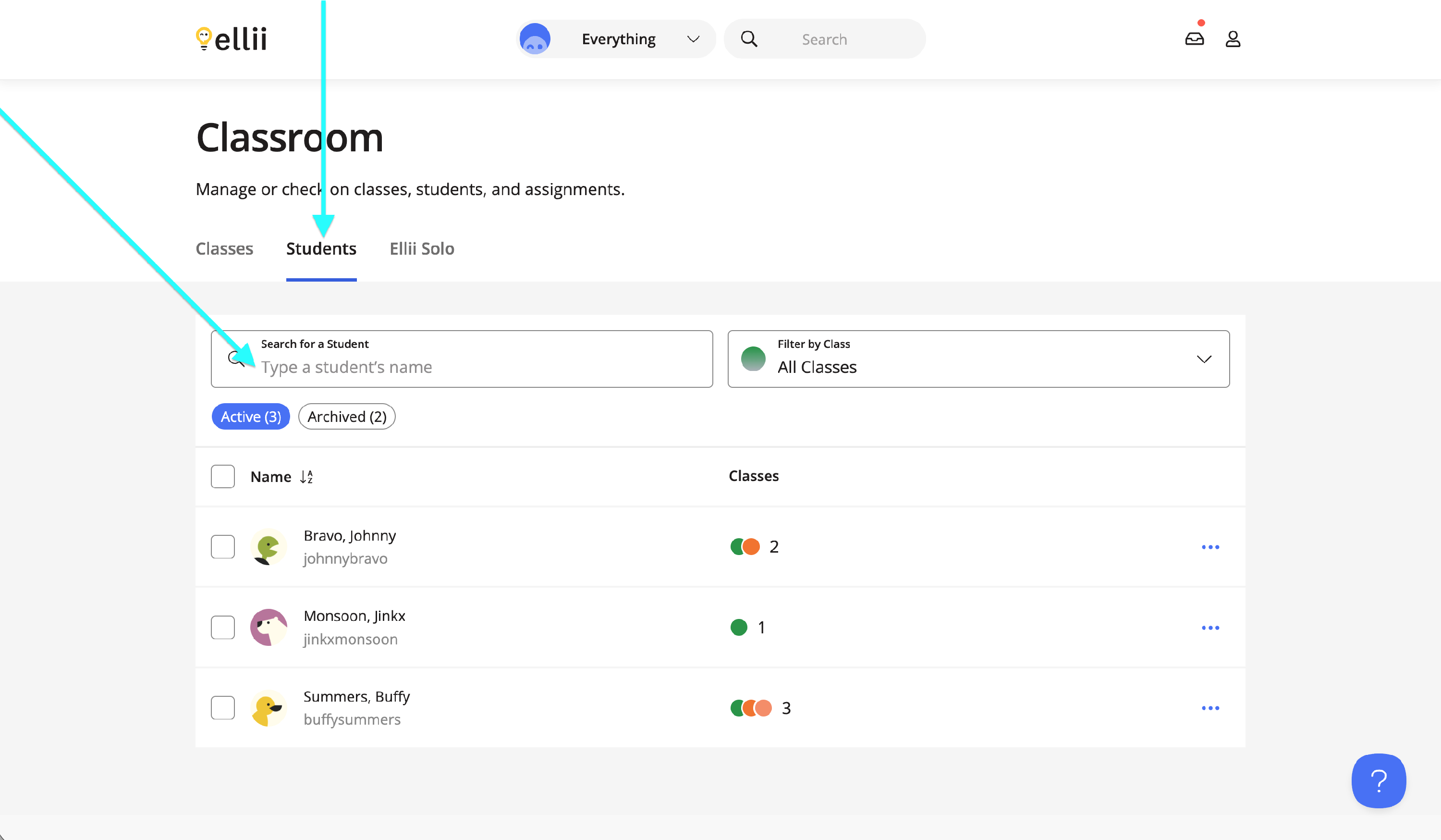 The Students page contain all your students from all your classes. You can search for a specific student, filter by class or show student status by Active or Archived.