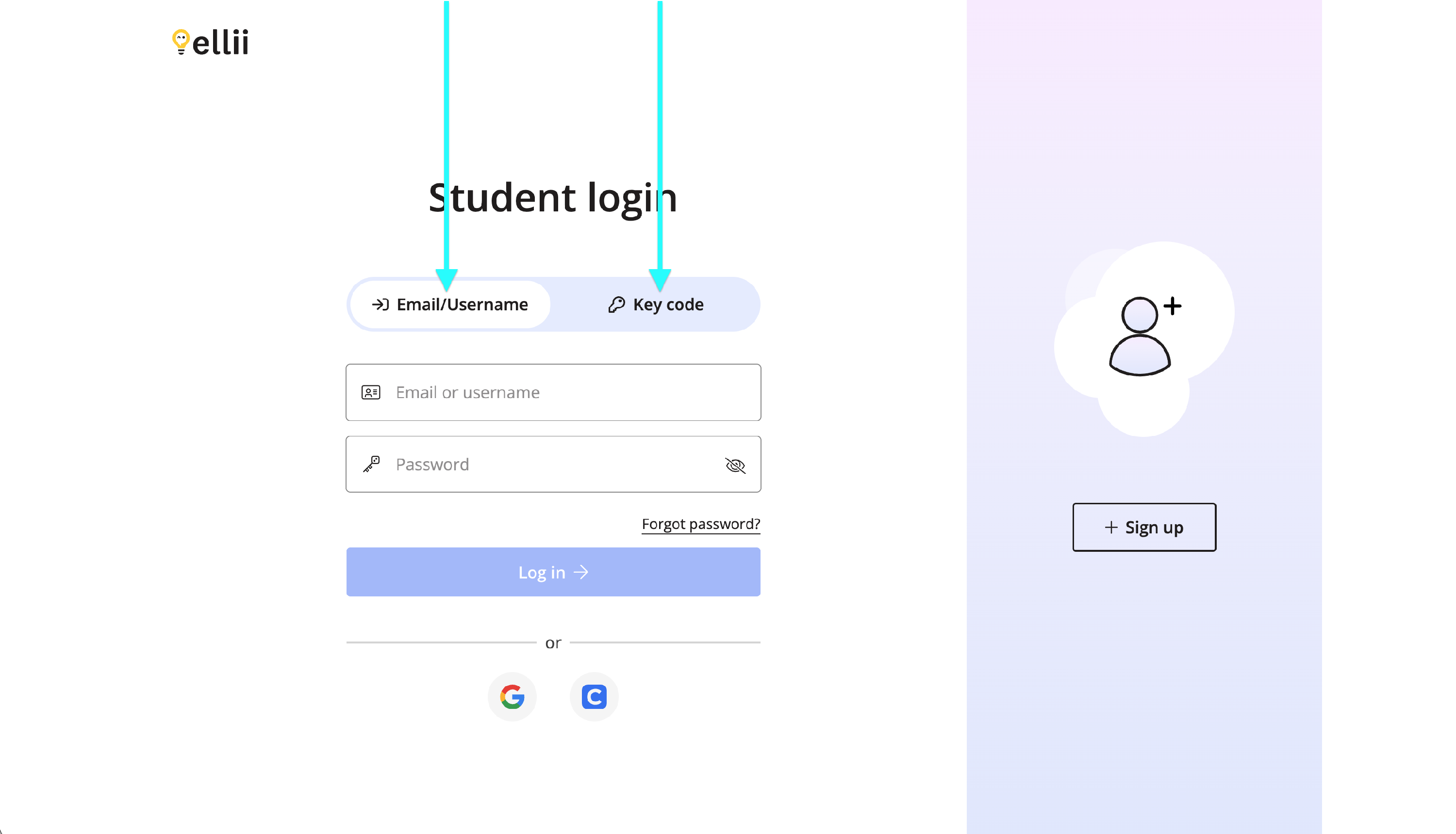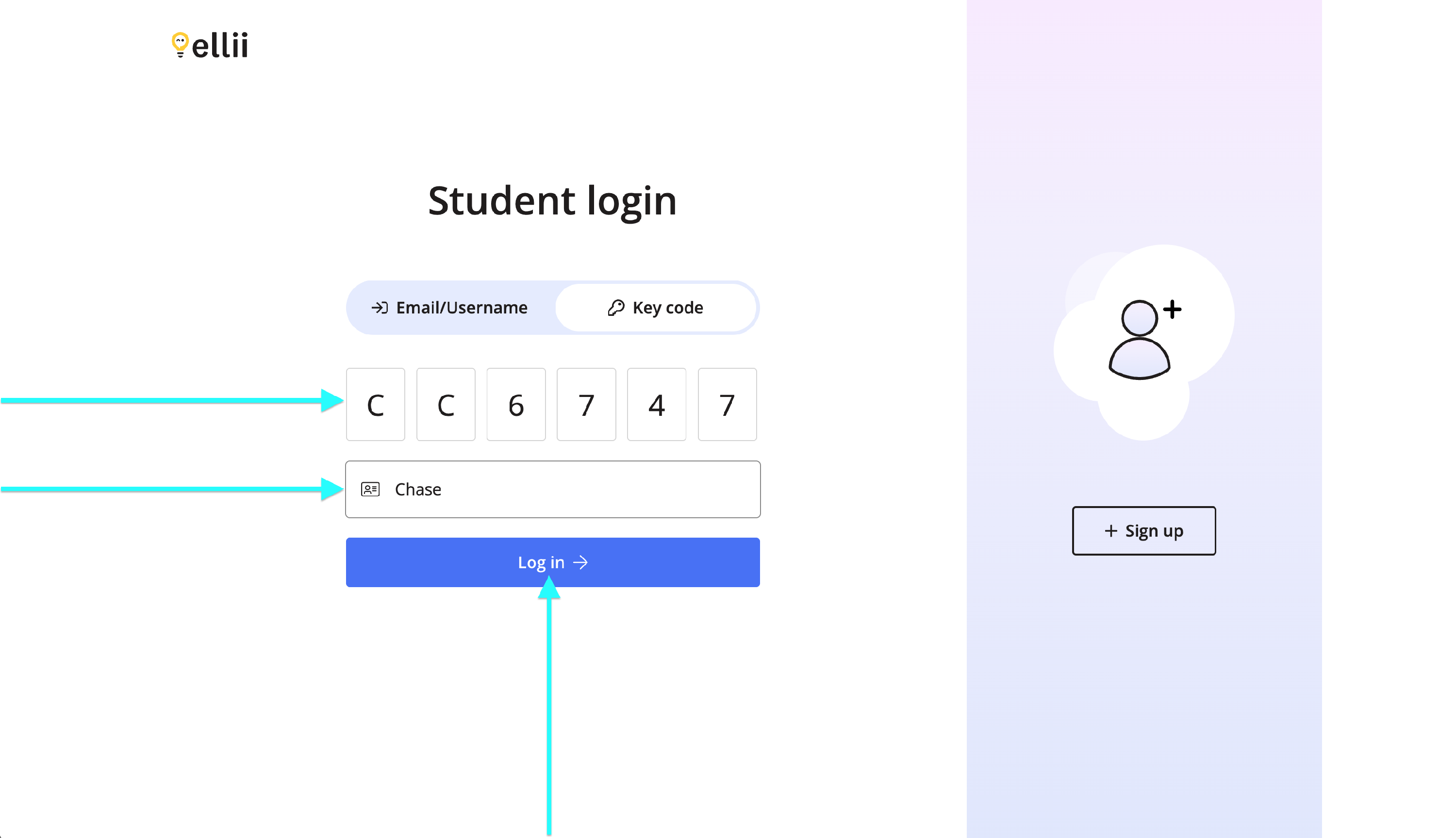 Click on the Key code tab if your student account was created with a key code by your teacher.