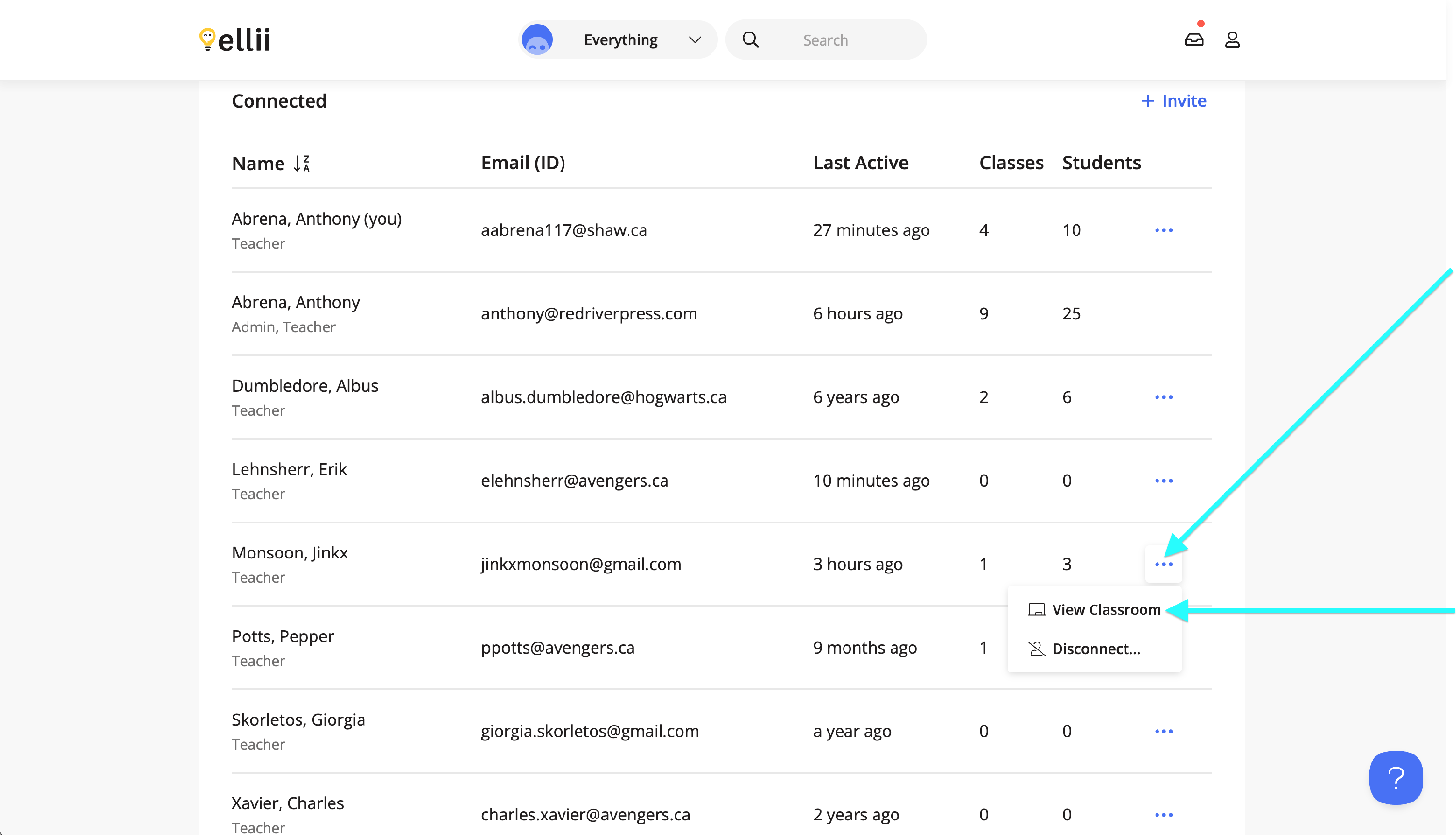 On your Team page, click the More Options (...) menu by the teacher's name you'd like to view and select View Classroom from the drop-down menu.