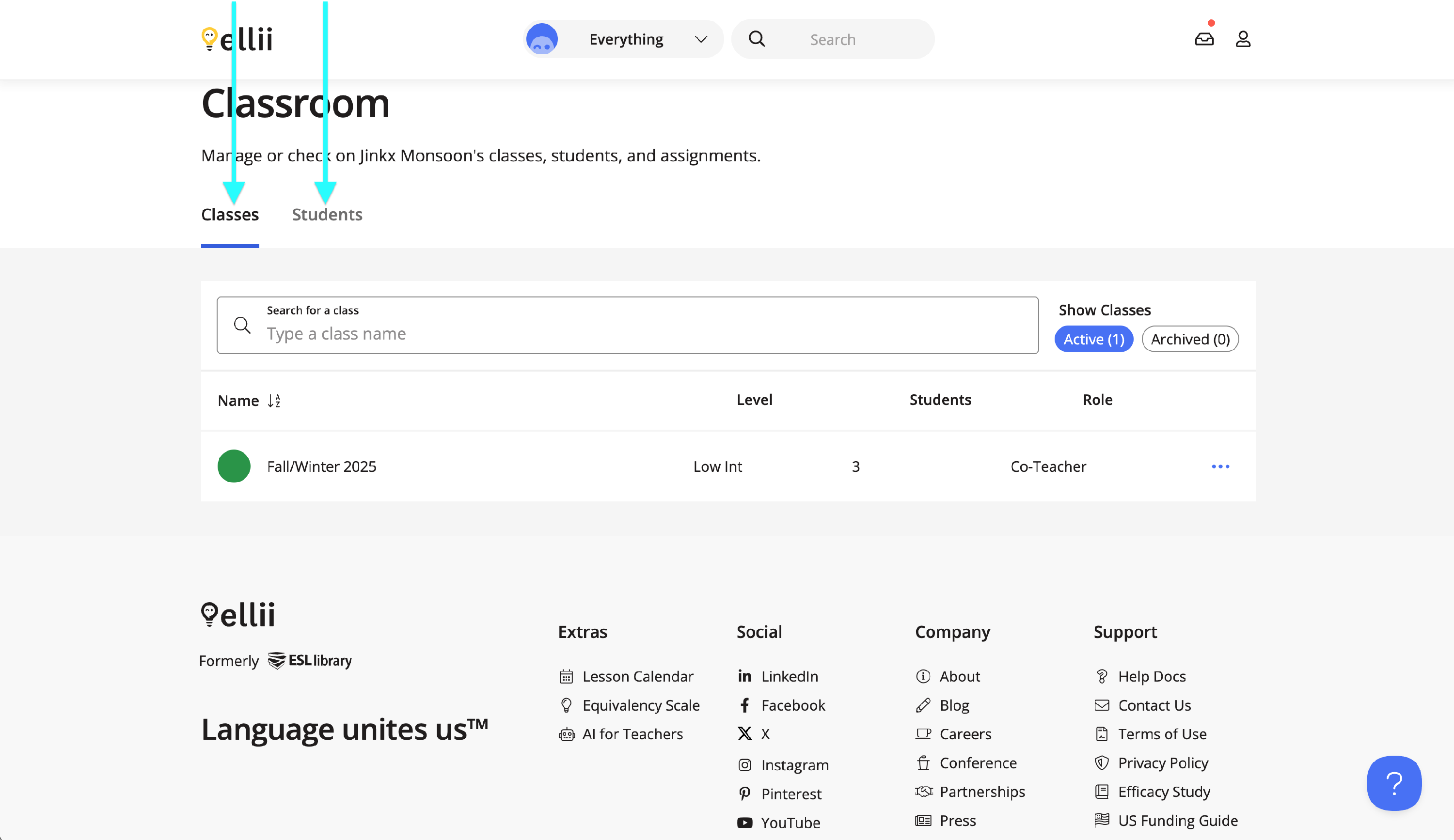 The teacher's profile details will appear. You can scroll down the page to view the teacher's classes and students.