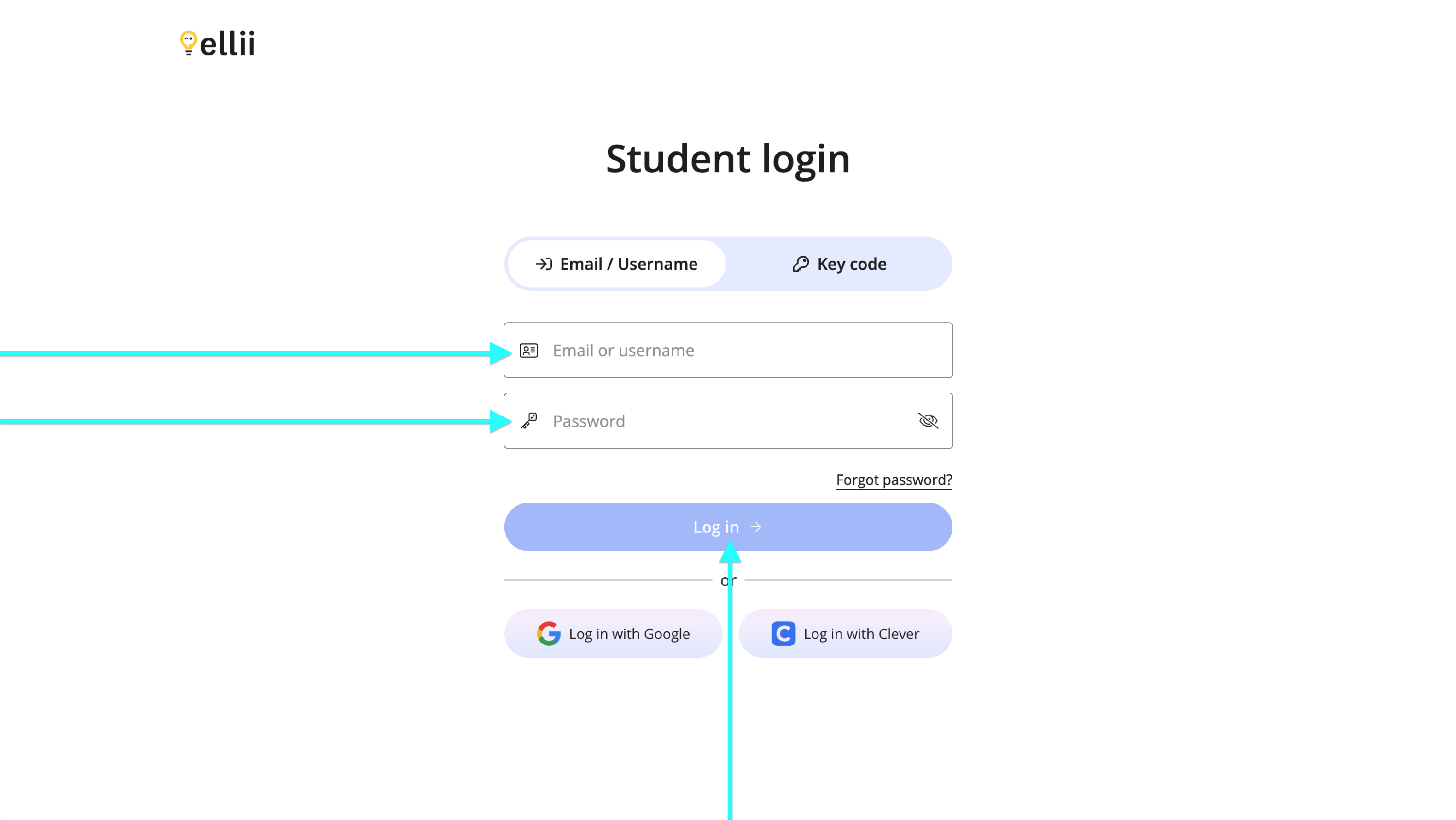 They will then type in their email address/username and password then click Log in. If they used a Google or Clever account previously, they can use the Log in with Google or Log in with Clever option.
