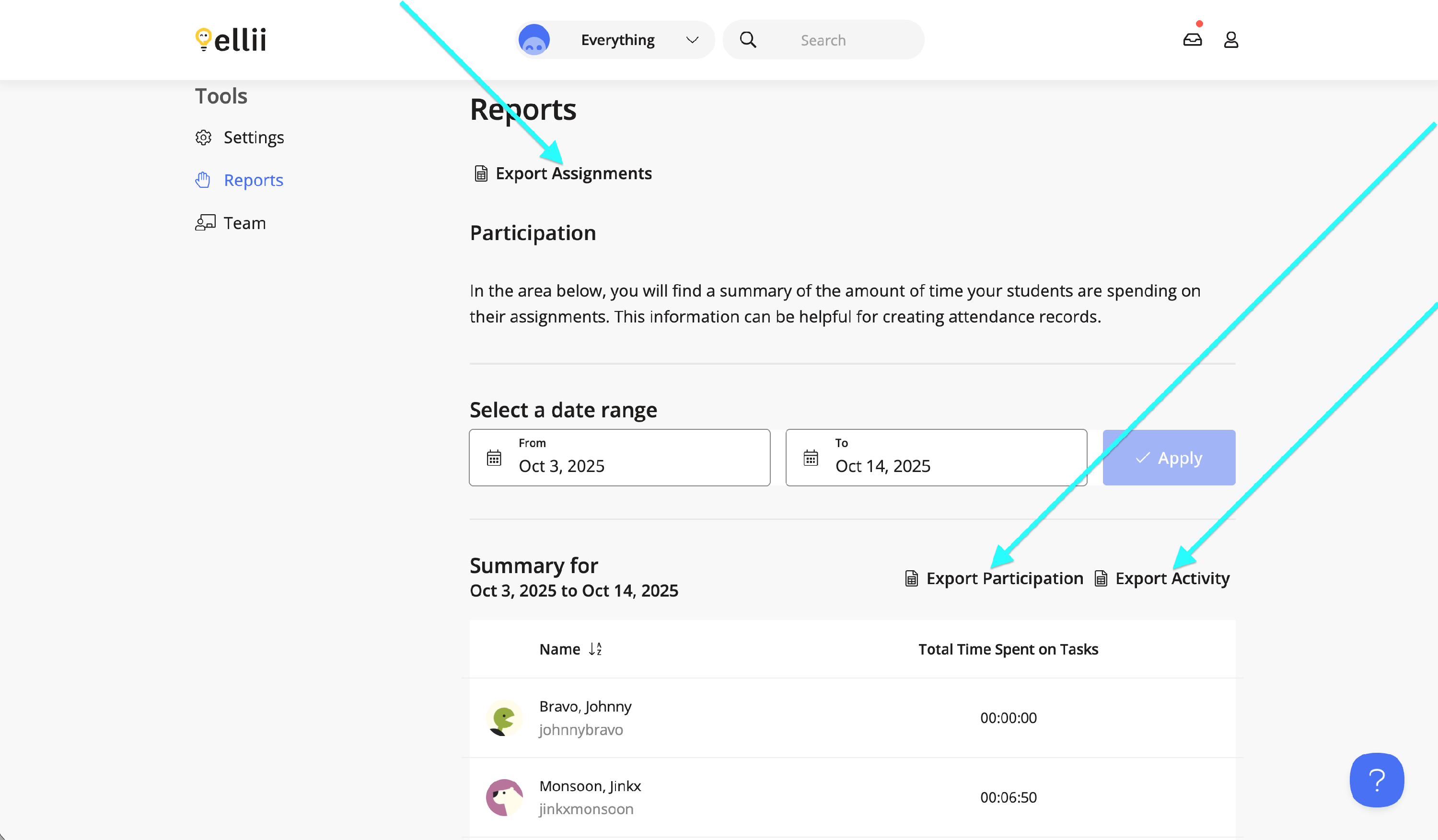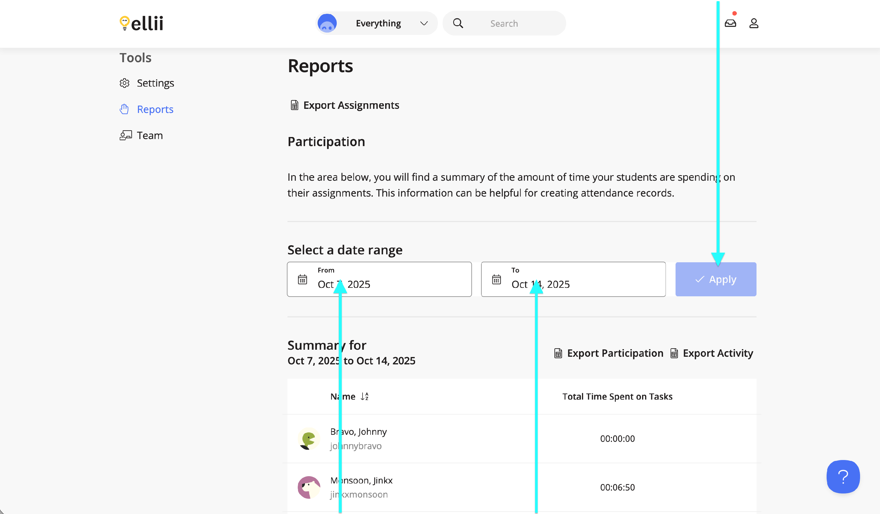 Select a start date by clicking on the From field and choose an end date by clicking on the To field. Once you have chosen your date range, click on Apply. You will then see the total time spent per student under the summary.