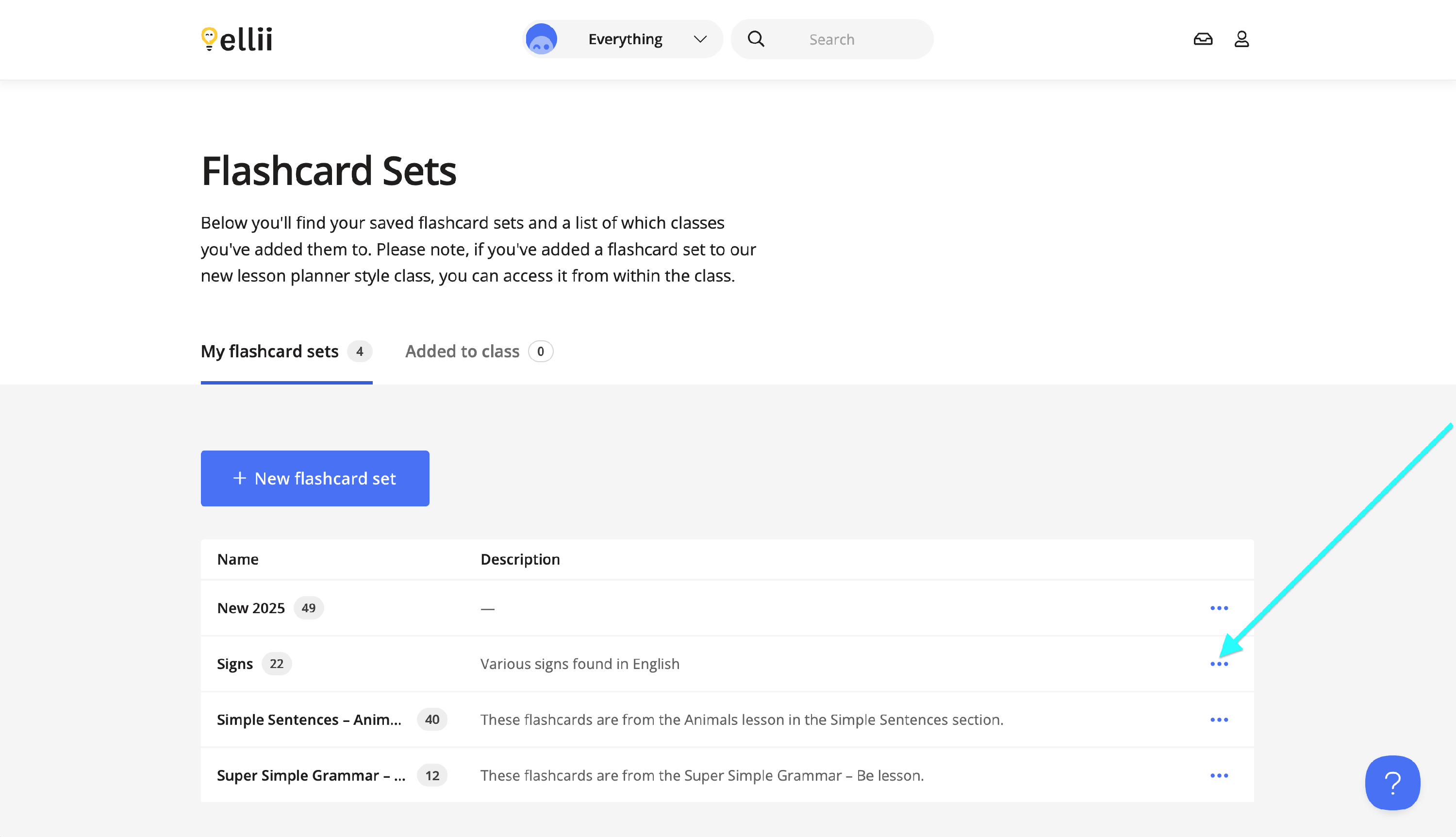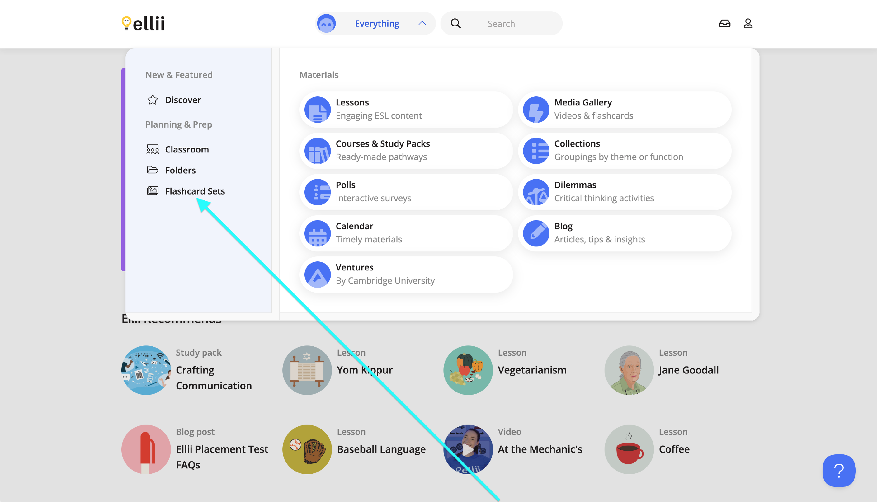 You can also share flashcard sets you have already created with your students by clicking on the Everything menu and selecting Flashcard Sets.