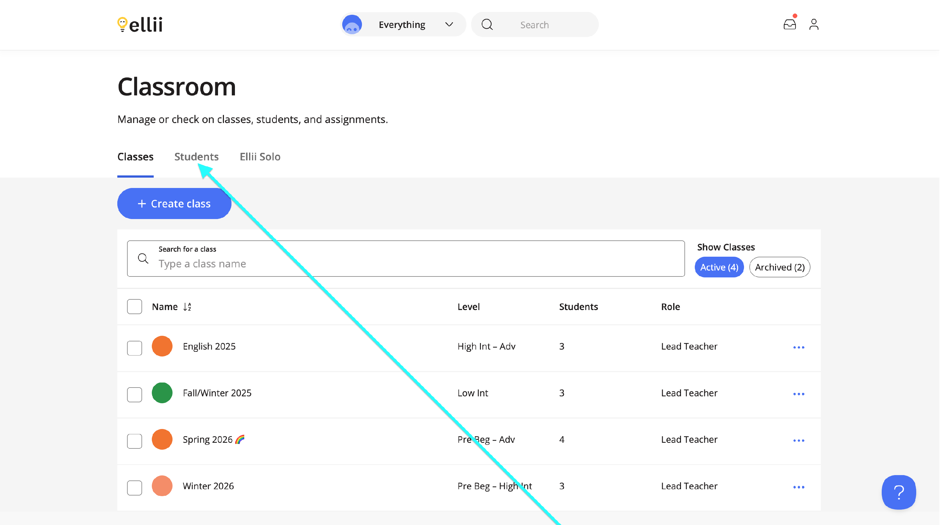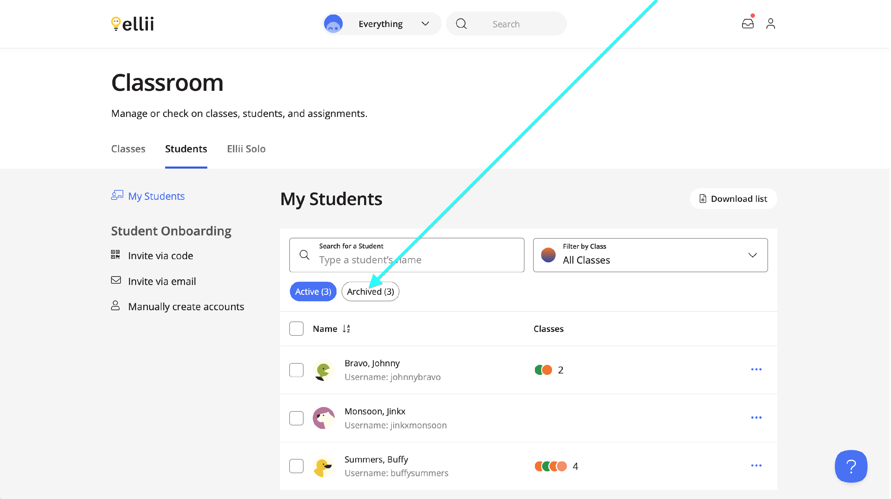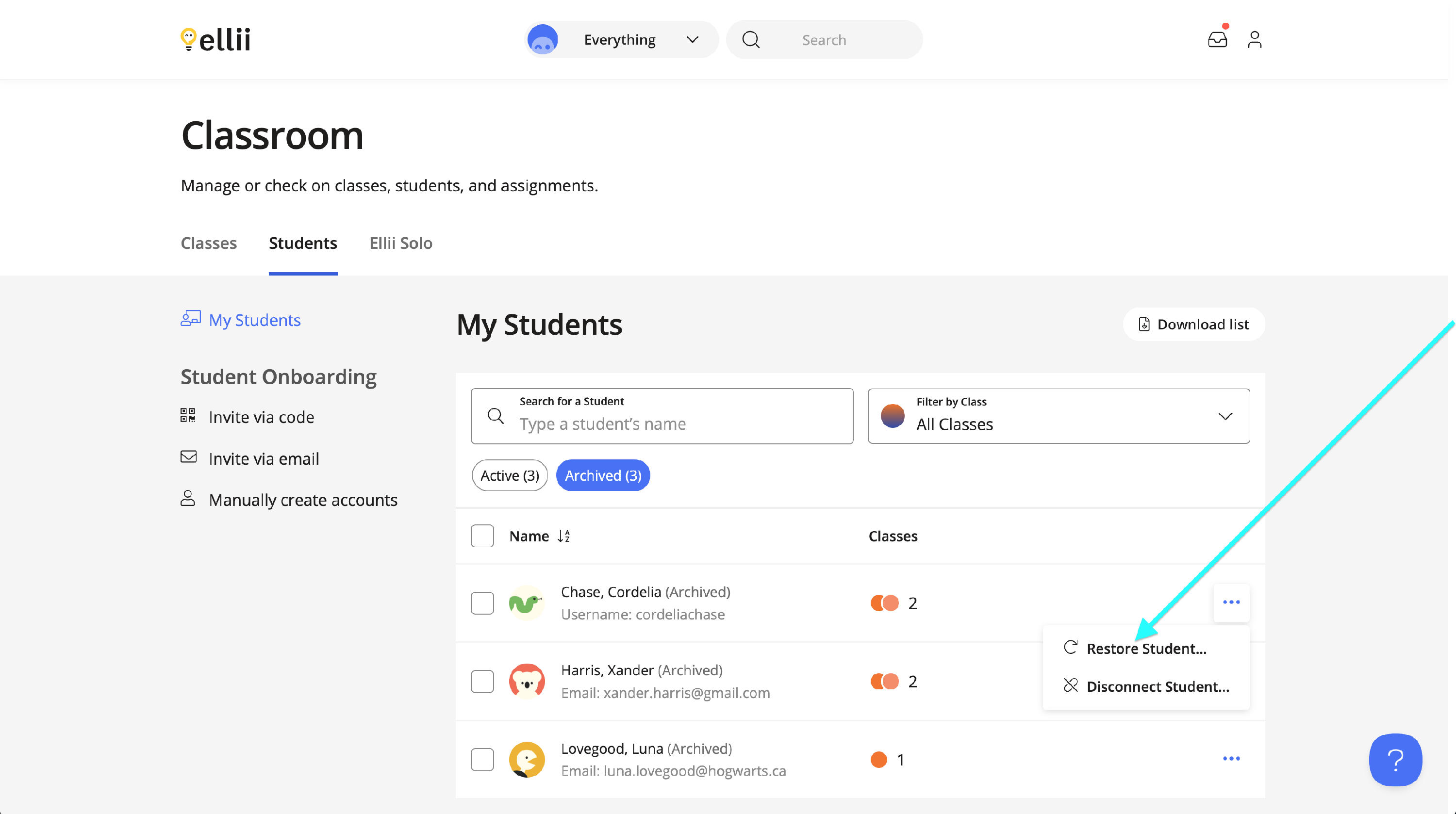 You can view your archived students by clicking on the Everything menu, selecting Classroom, clicking on the Students tab and then clicking on Archived.