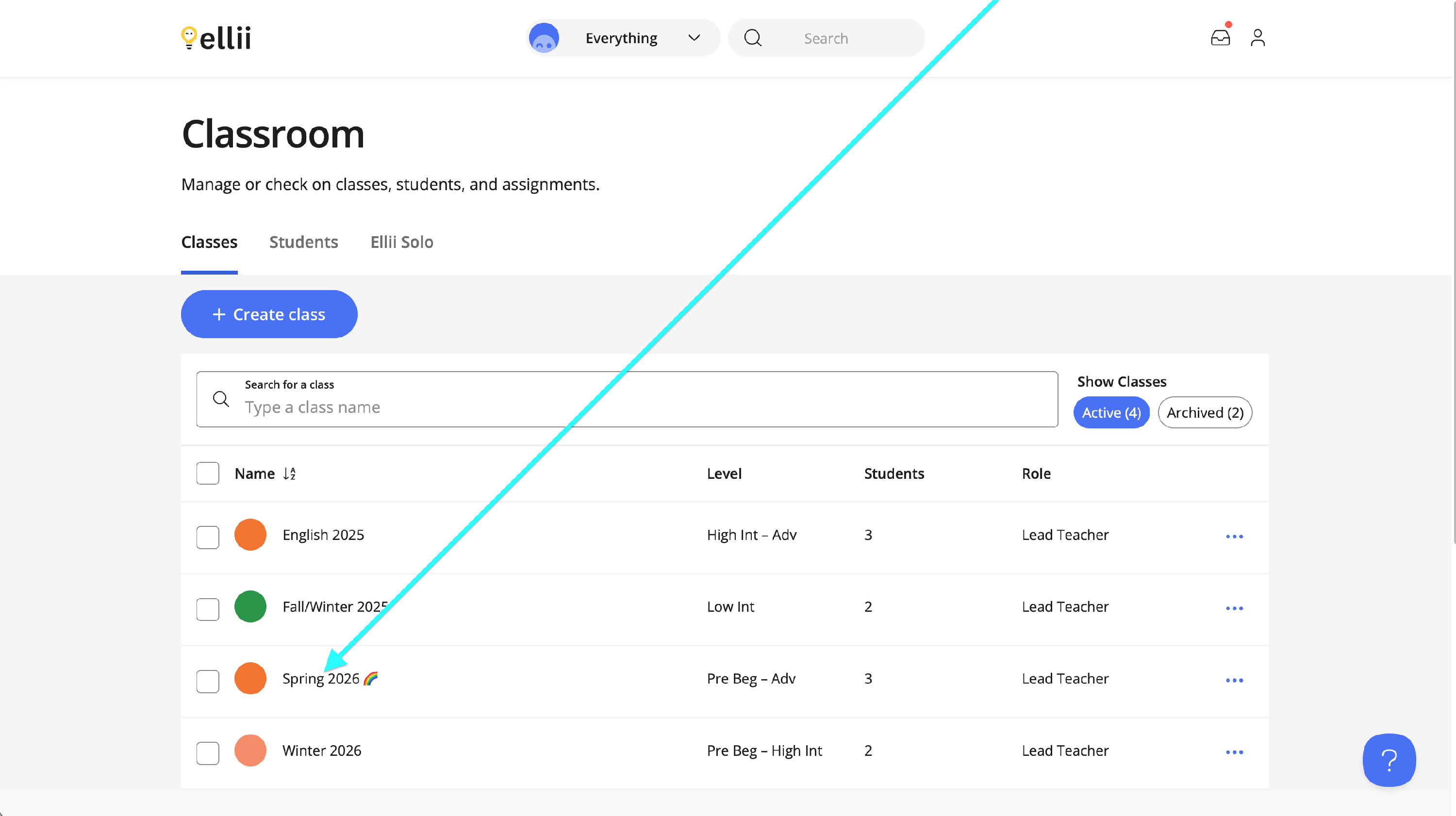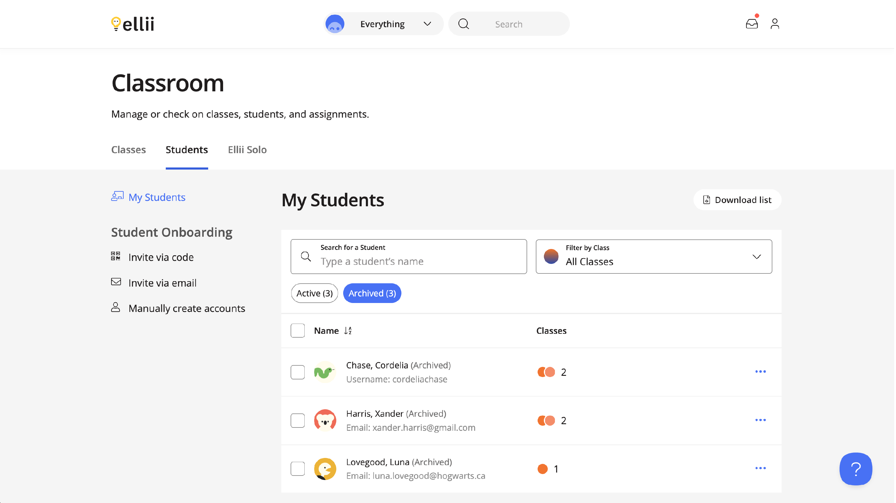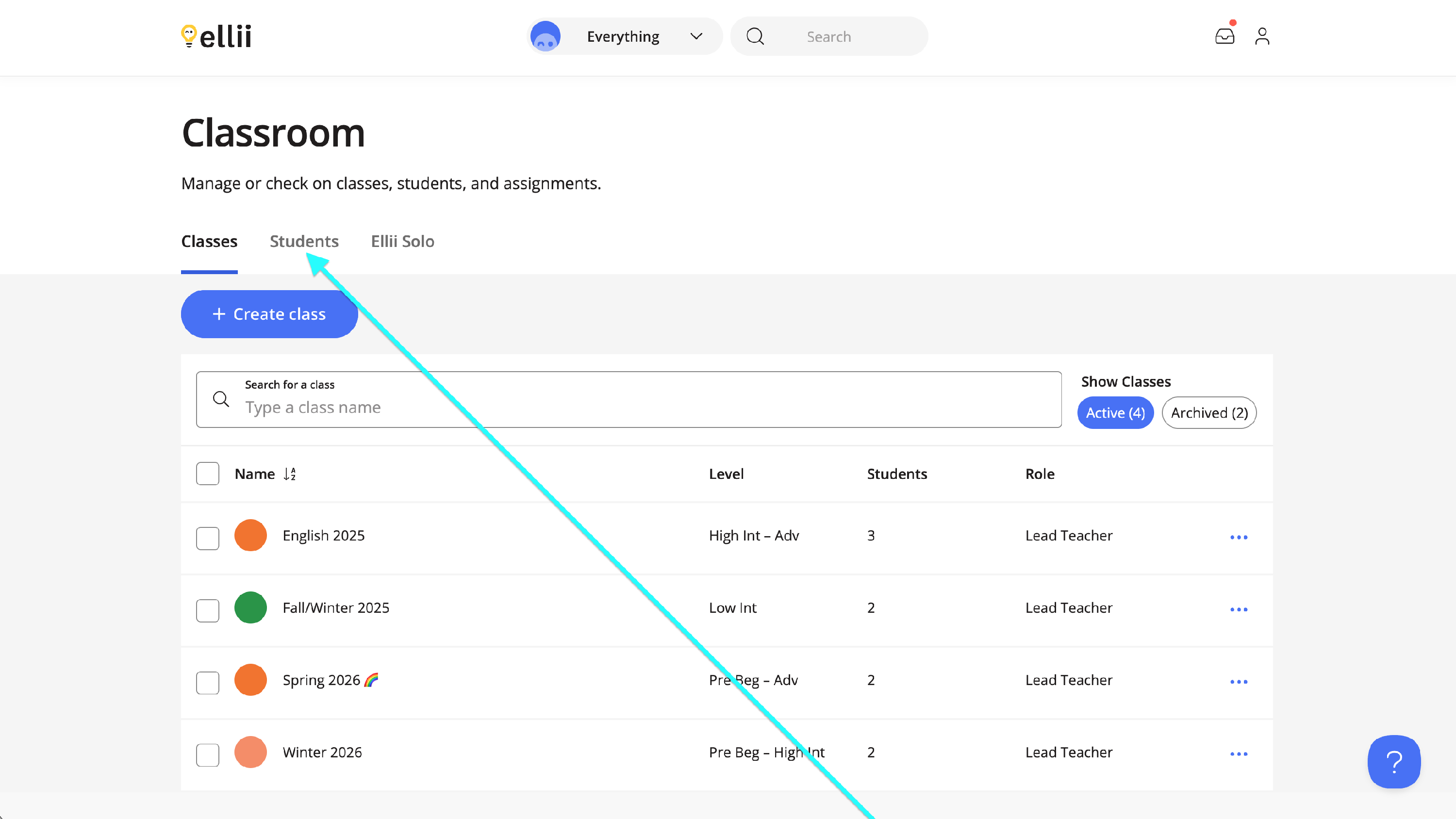 You can view your archived students by clicking on the Everything menu, selecting Classroom, clicking on the Students tab and then clicking on Archived.
