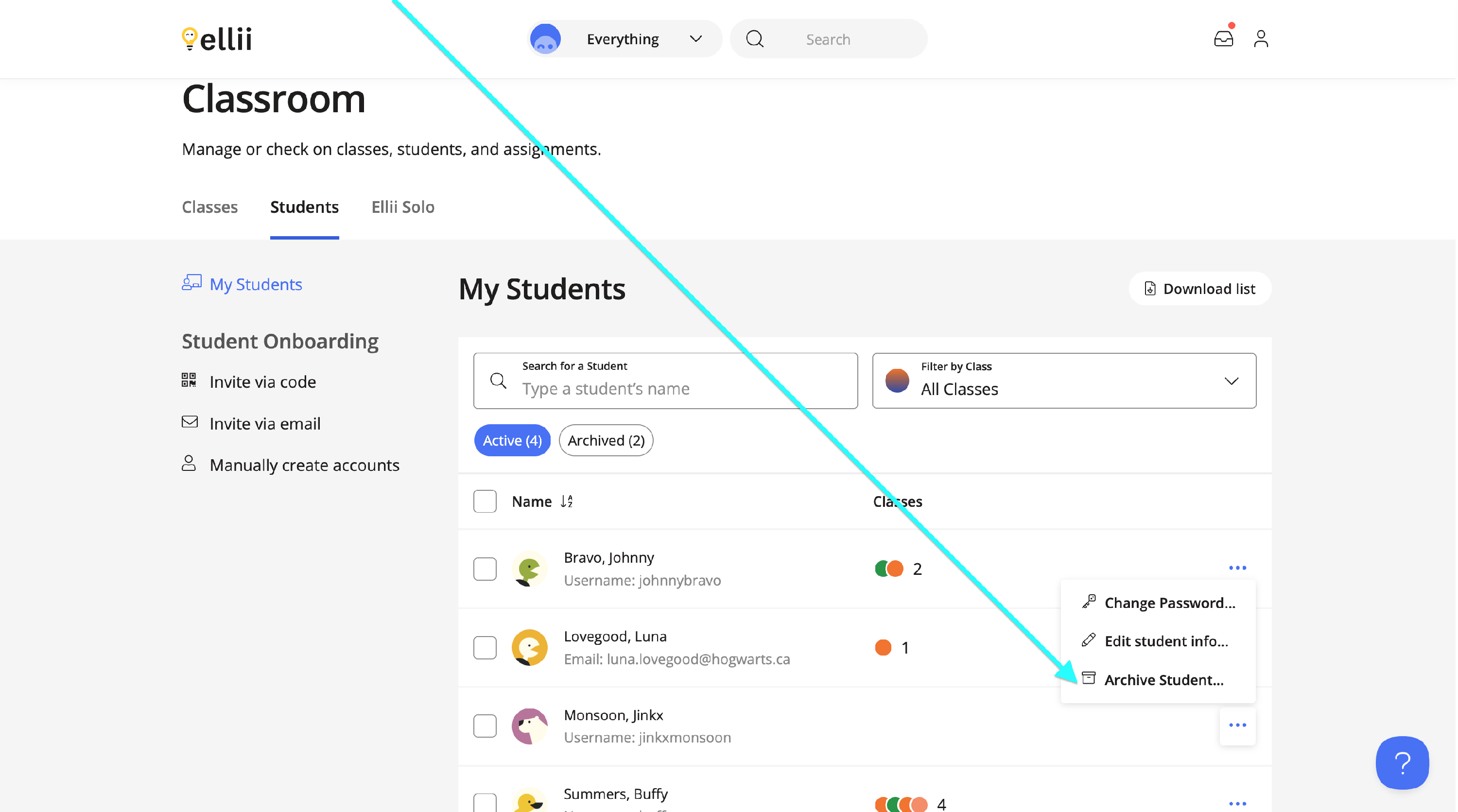 Click on the More Options (...) by the student's account that you would like to archive and select Archive.