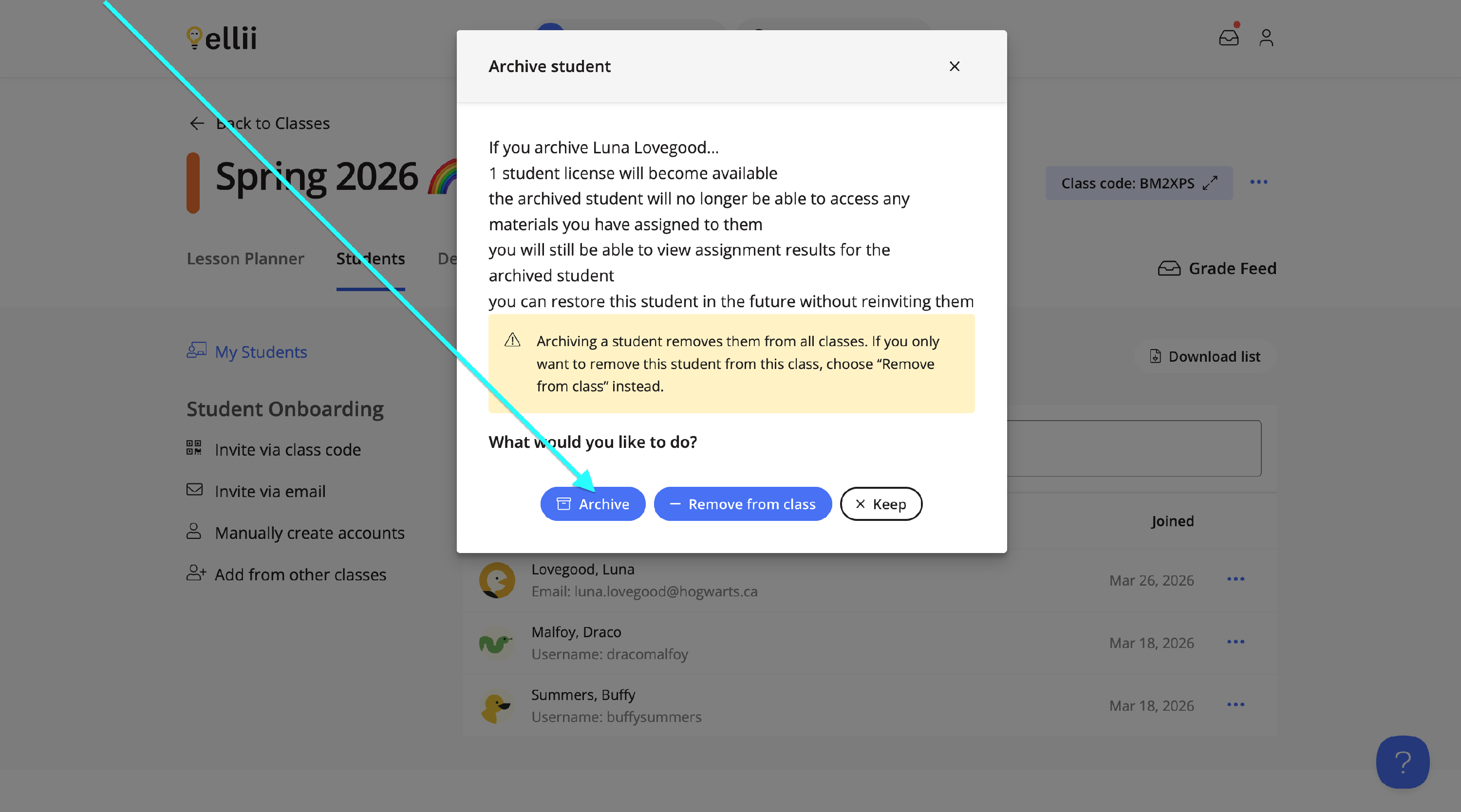 Please note: Removing a student from a class does not release the student license for incoming students.