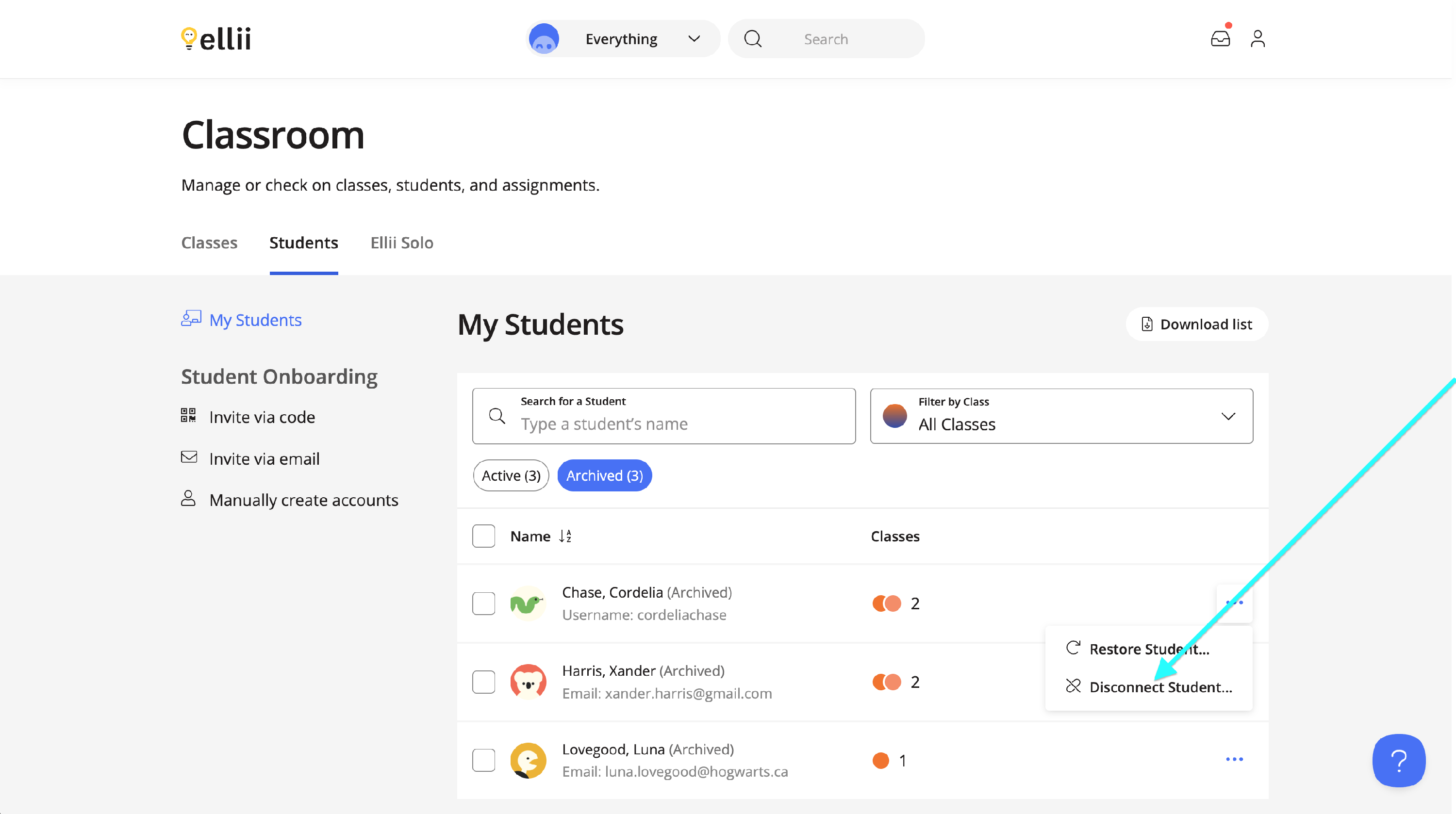 Clicking on the More Options (...) menu by the archived student will allow you to disconnect the student account completely from your teacher account.