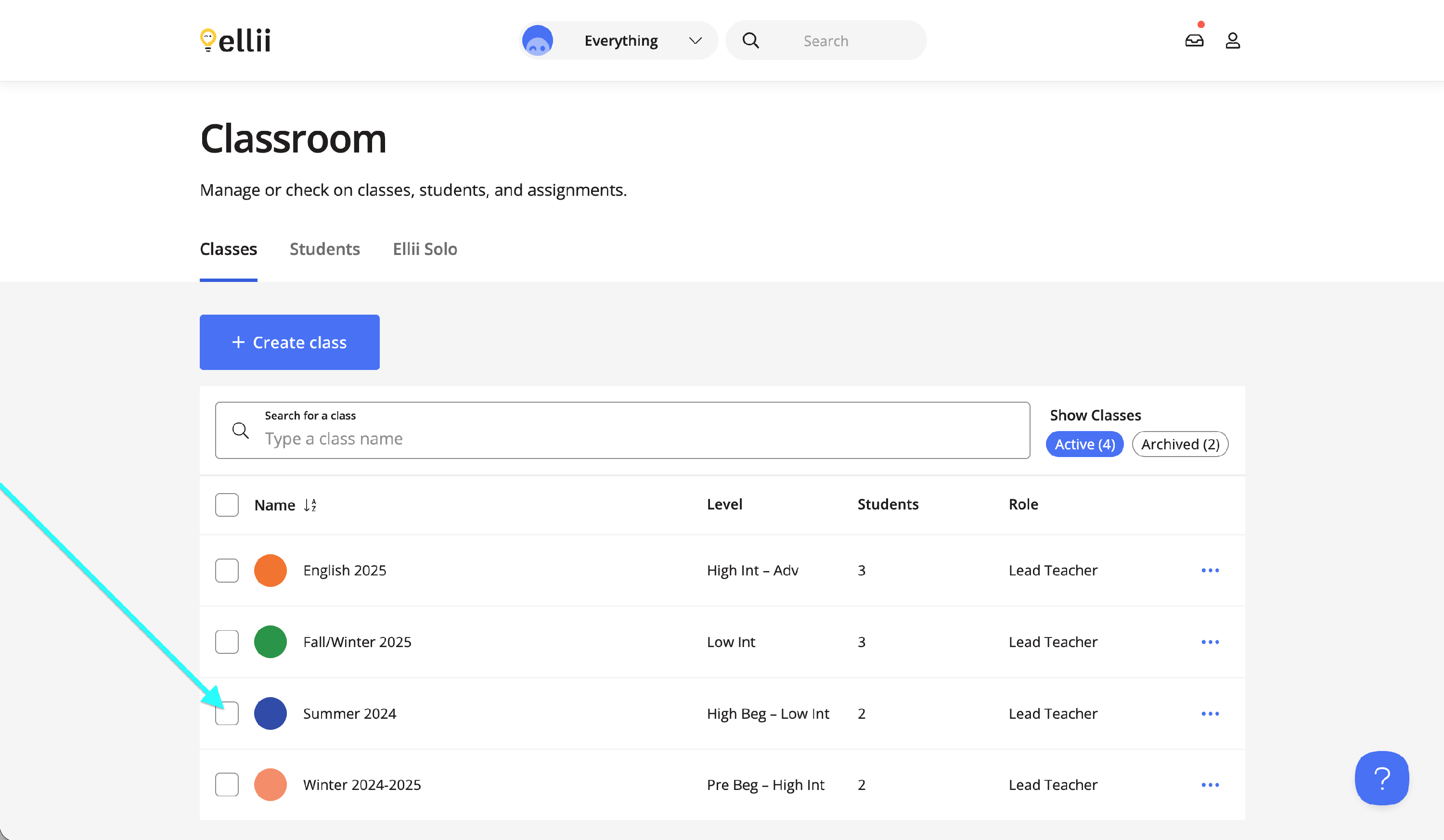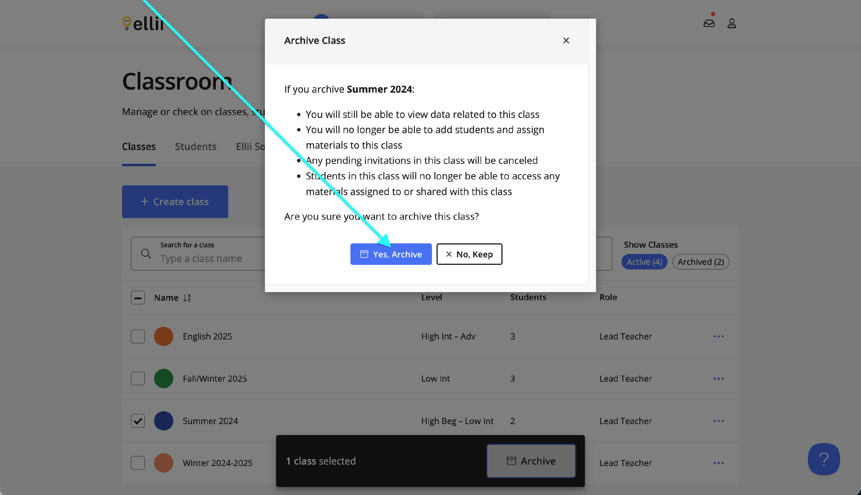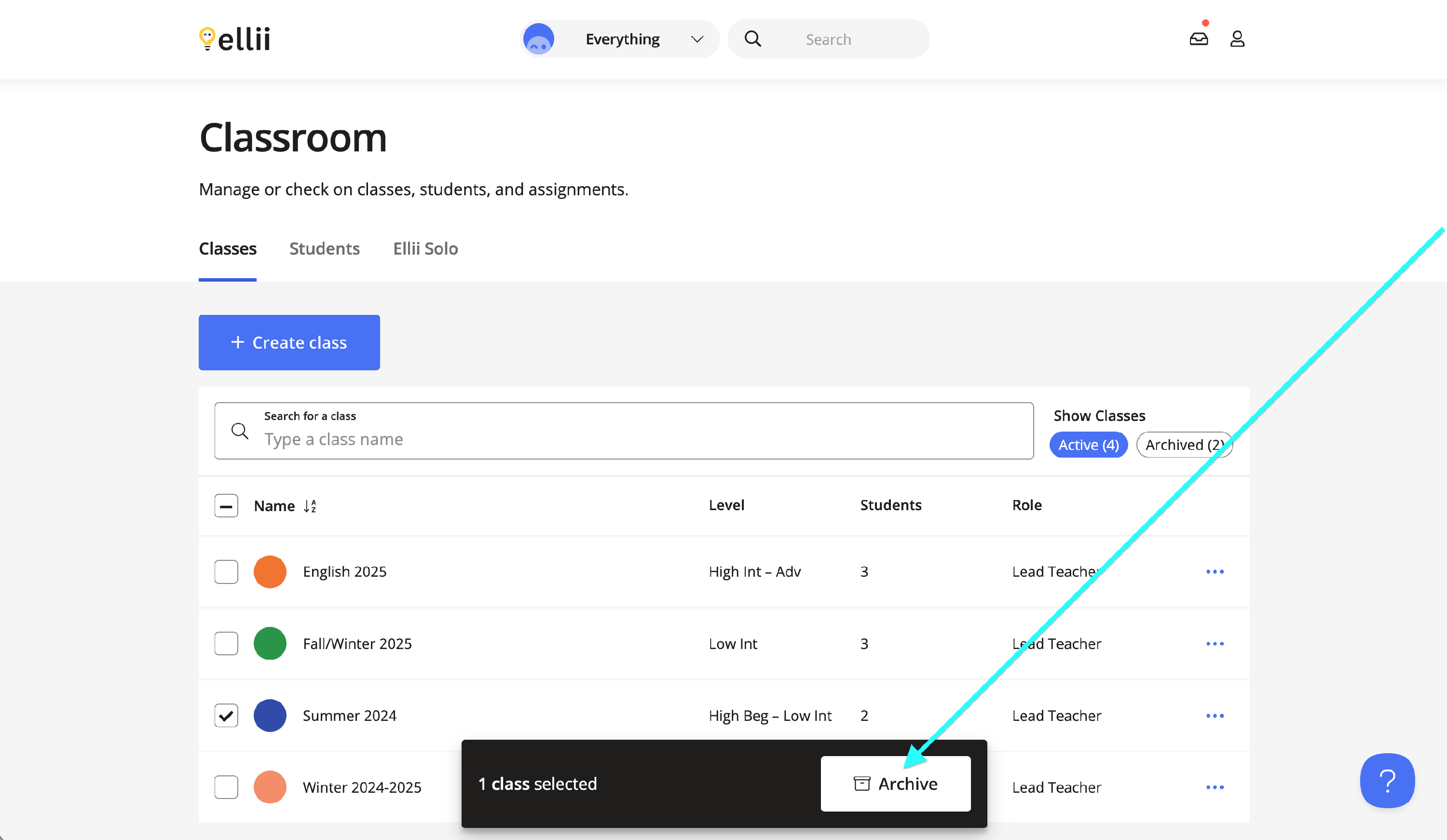 You will land on the Classes page, where you will see a list of all your classes. Check off the class that you'd like to archive and click on Archive at the bottom to remove this class from your list of active classes.