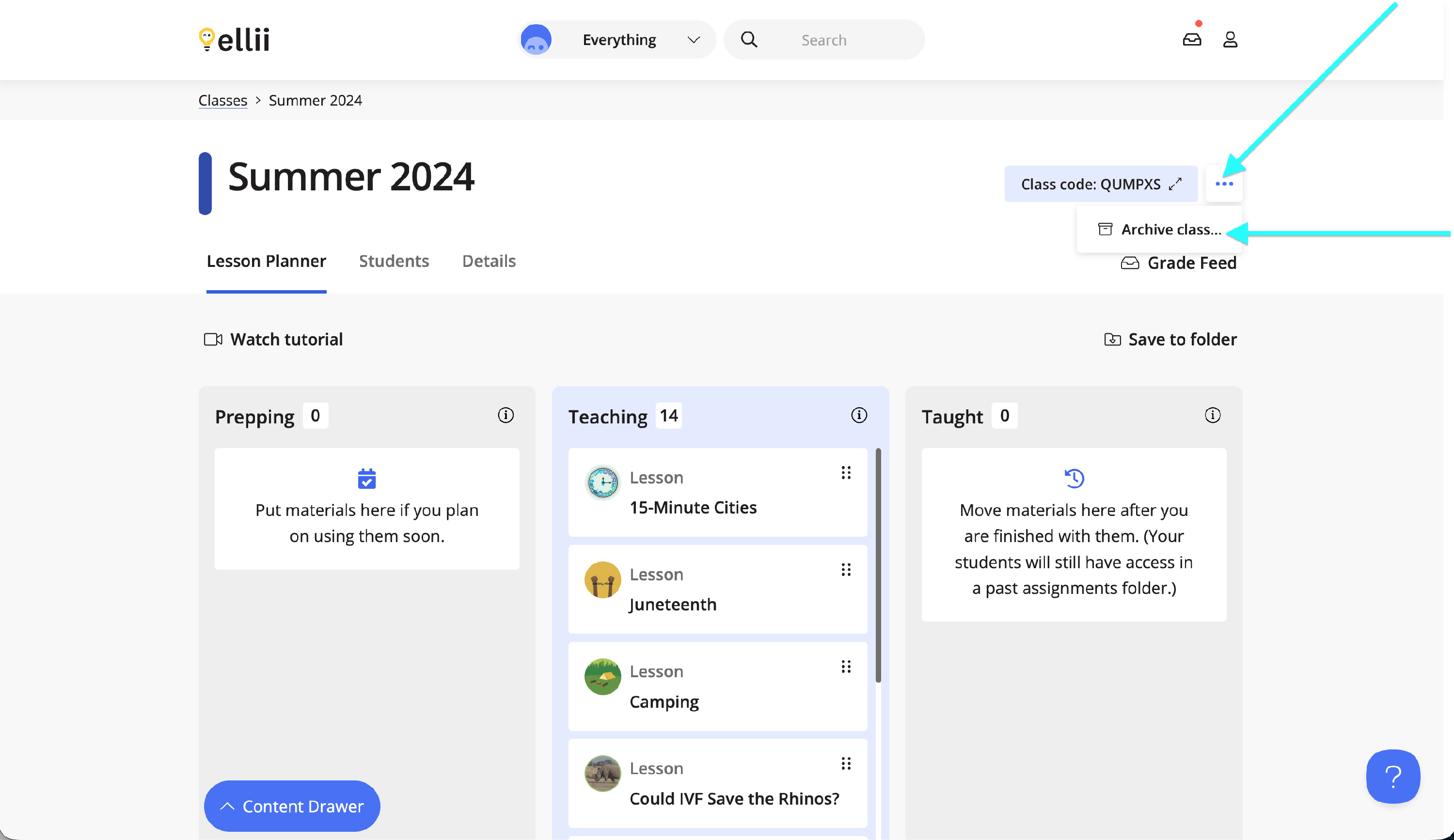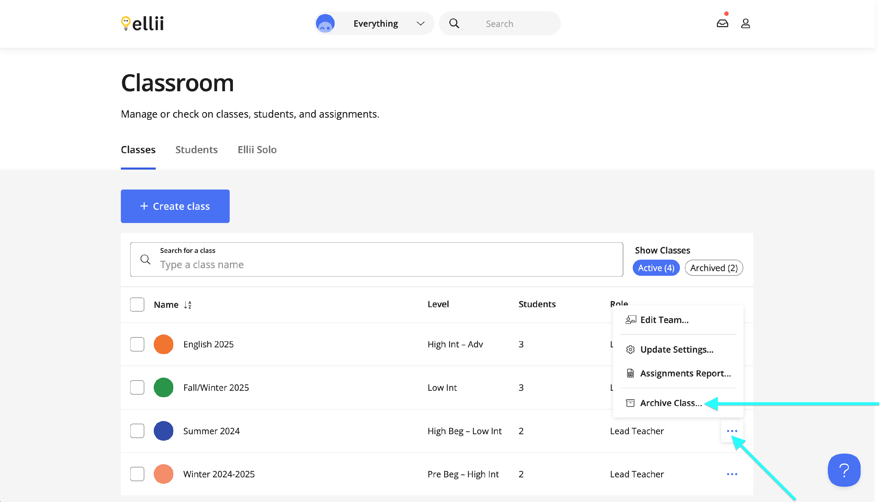 Clicking on the More Options (...) menu by the class name will also bring up the option to archive the class.