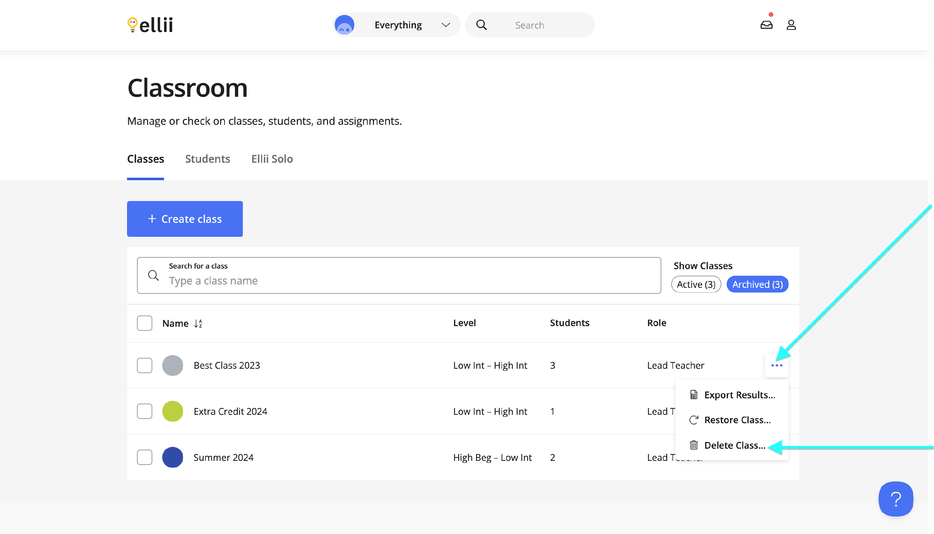 To delete an archived class from your account, you will click on the More Options (...) menu by the class name and select Delete Class.
