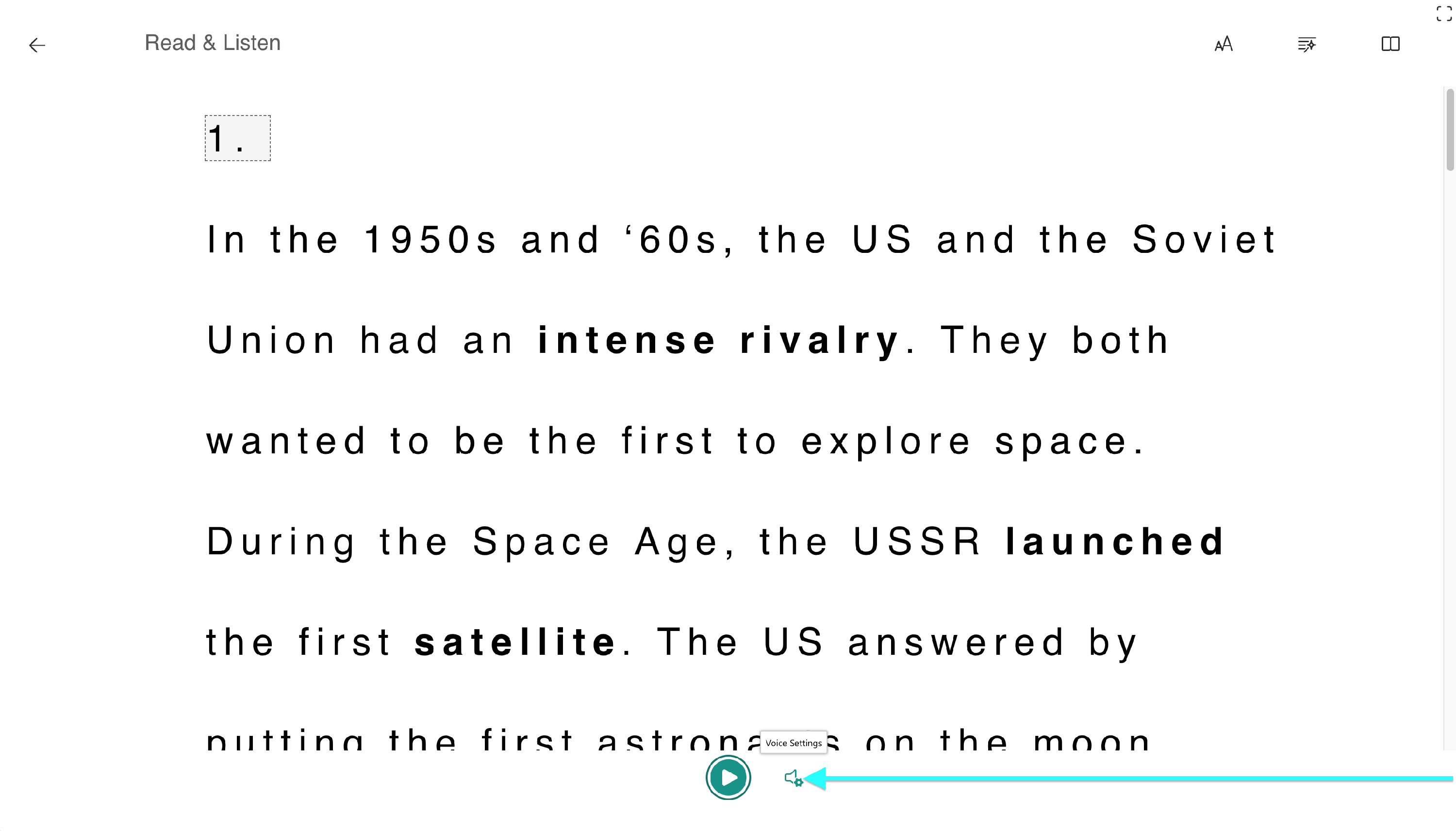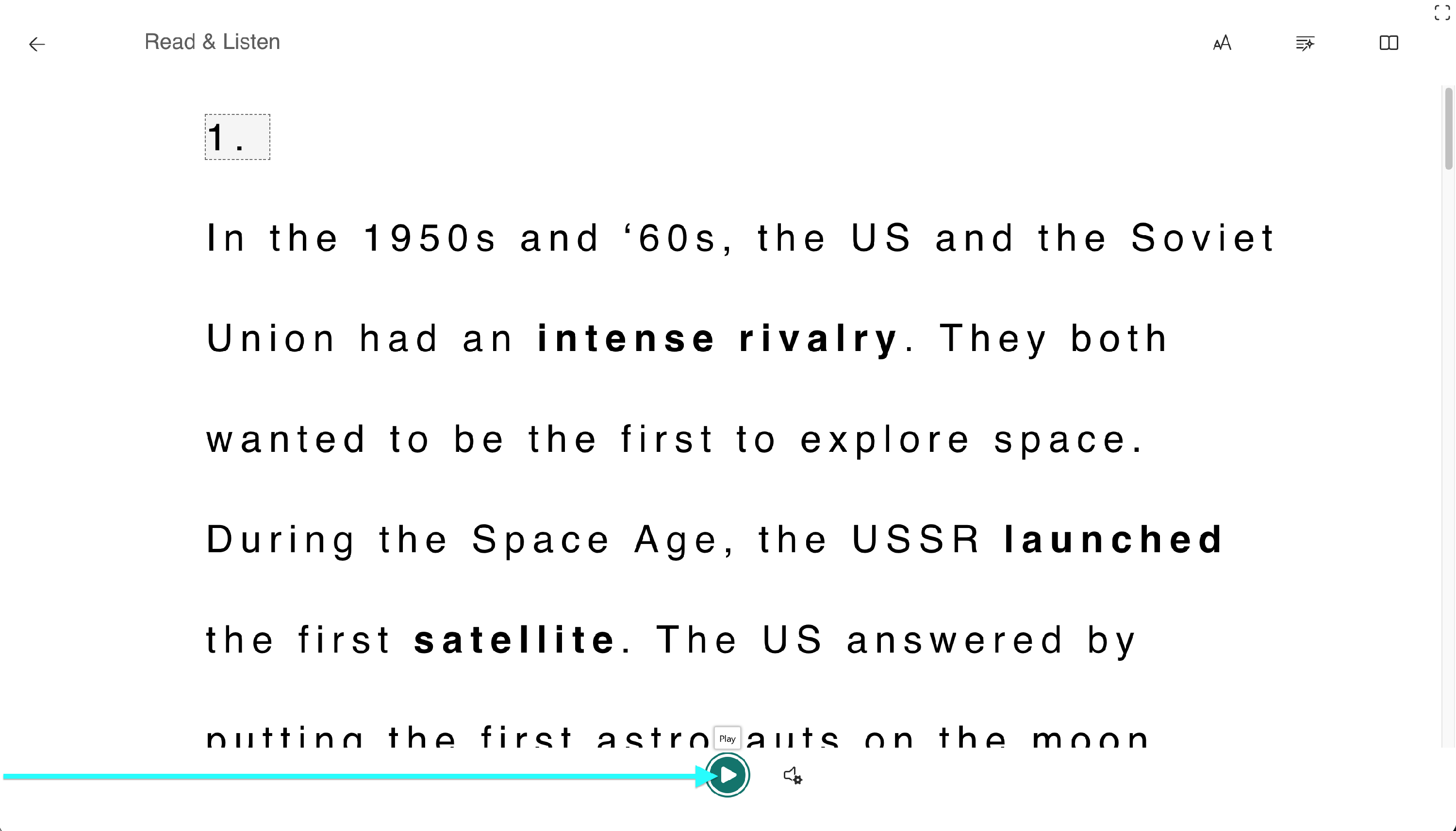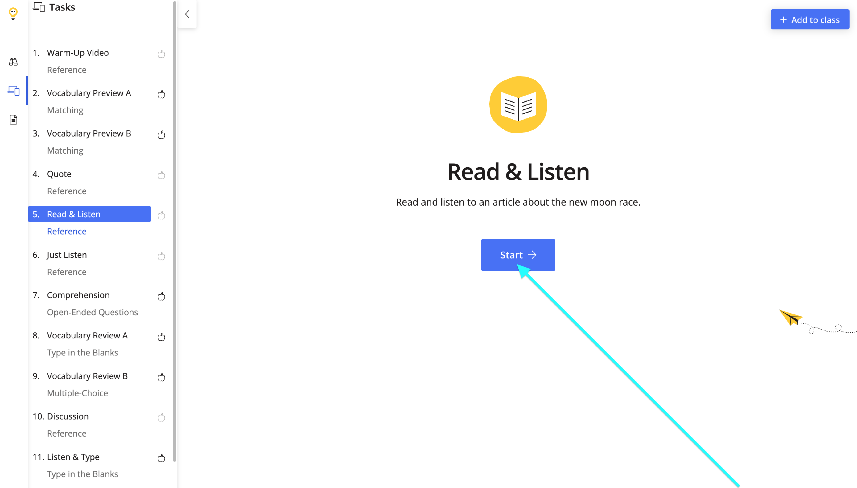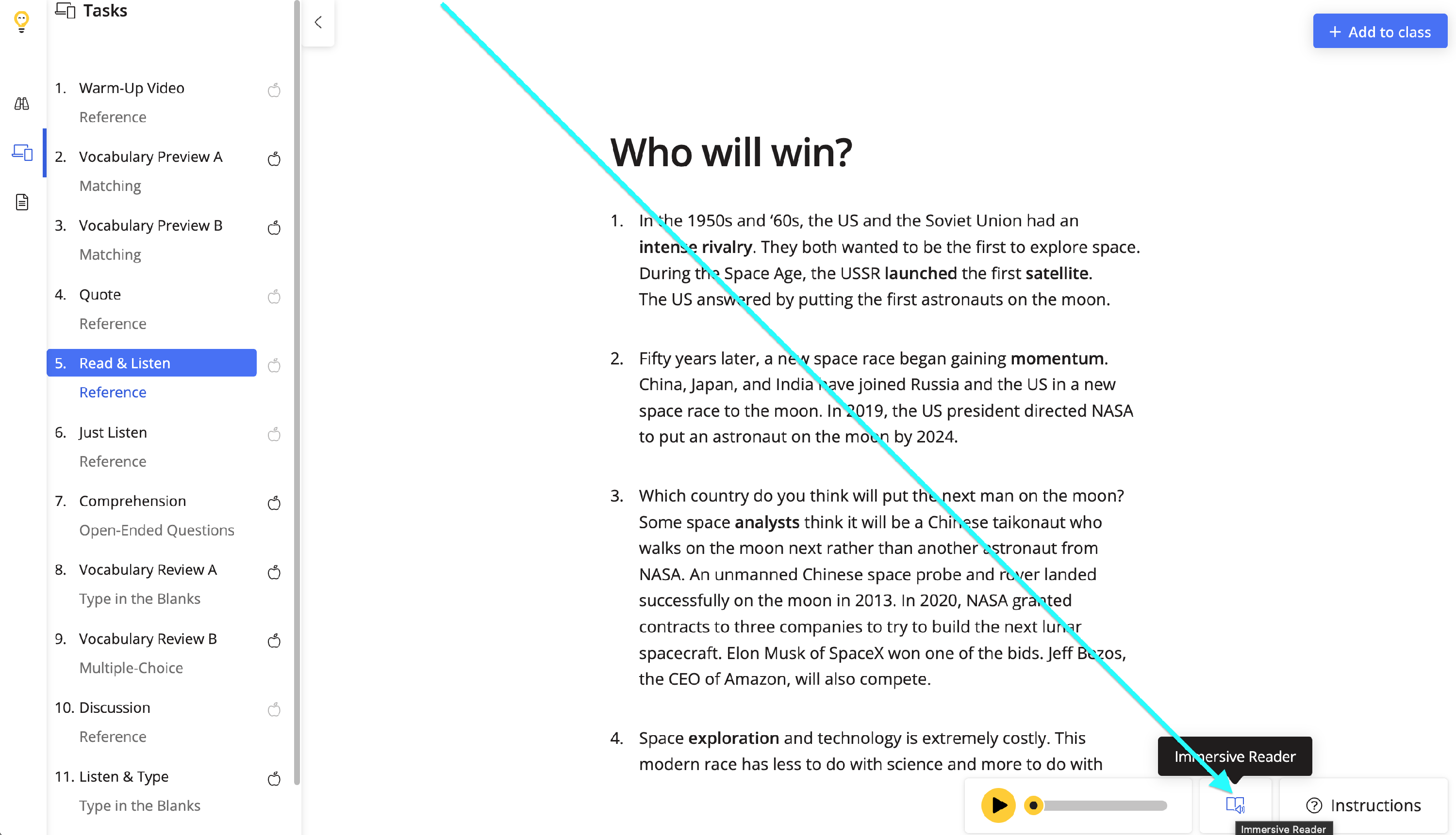 The Immersive Reader is integrated into our reading tasks. Look for a lesson that has a Read & Listen task listed on the Task Player.