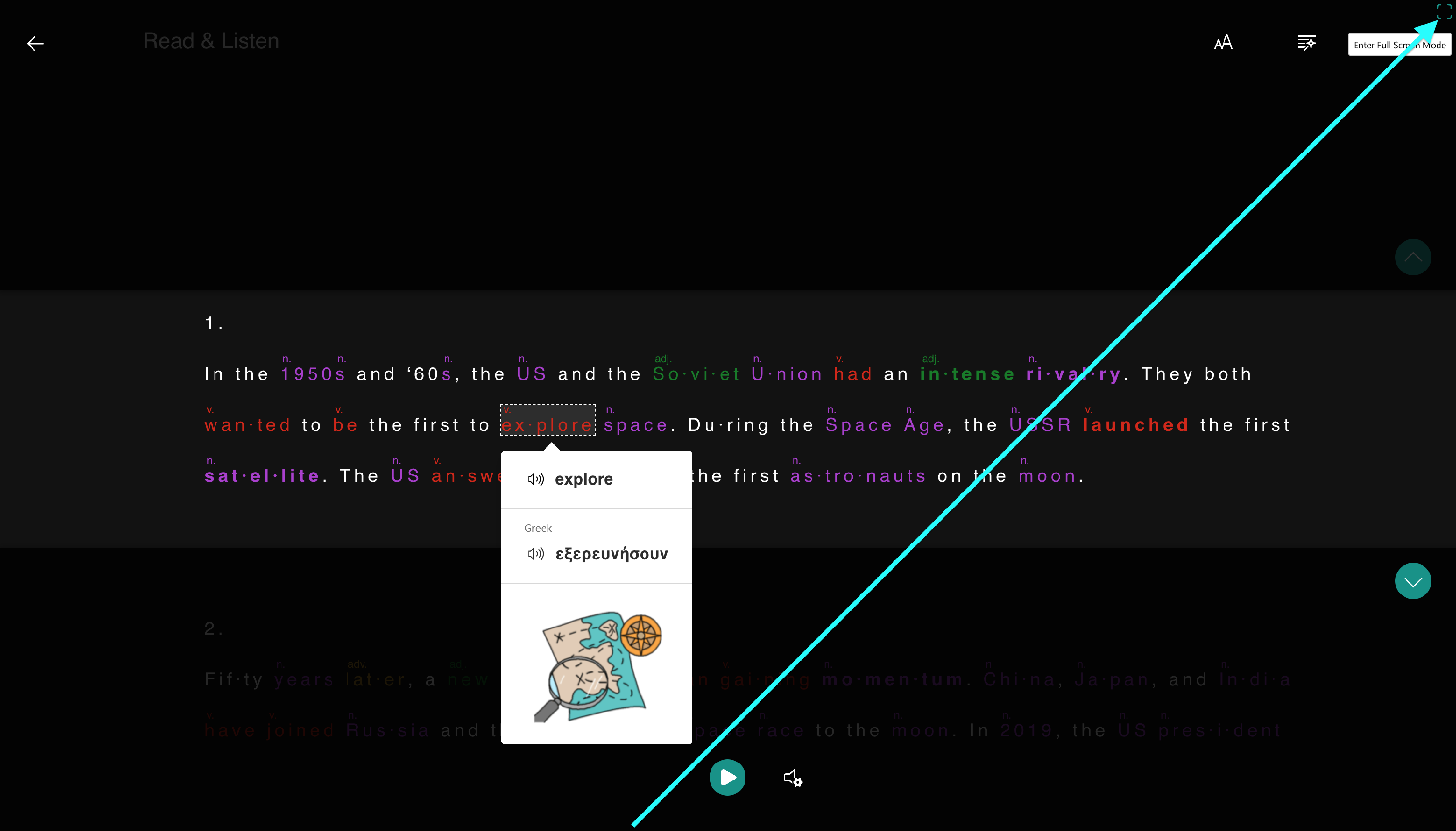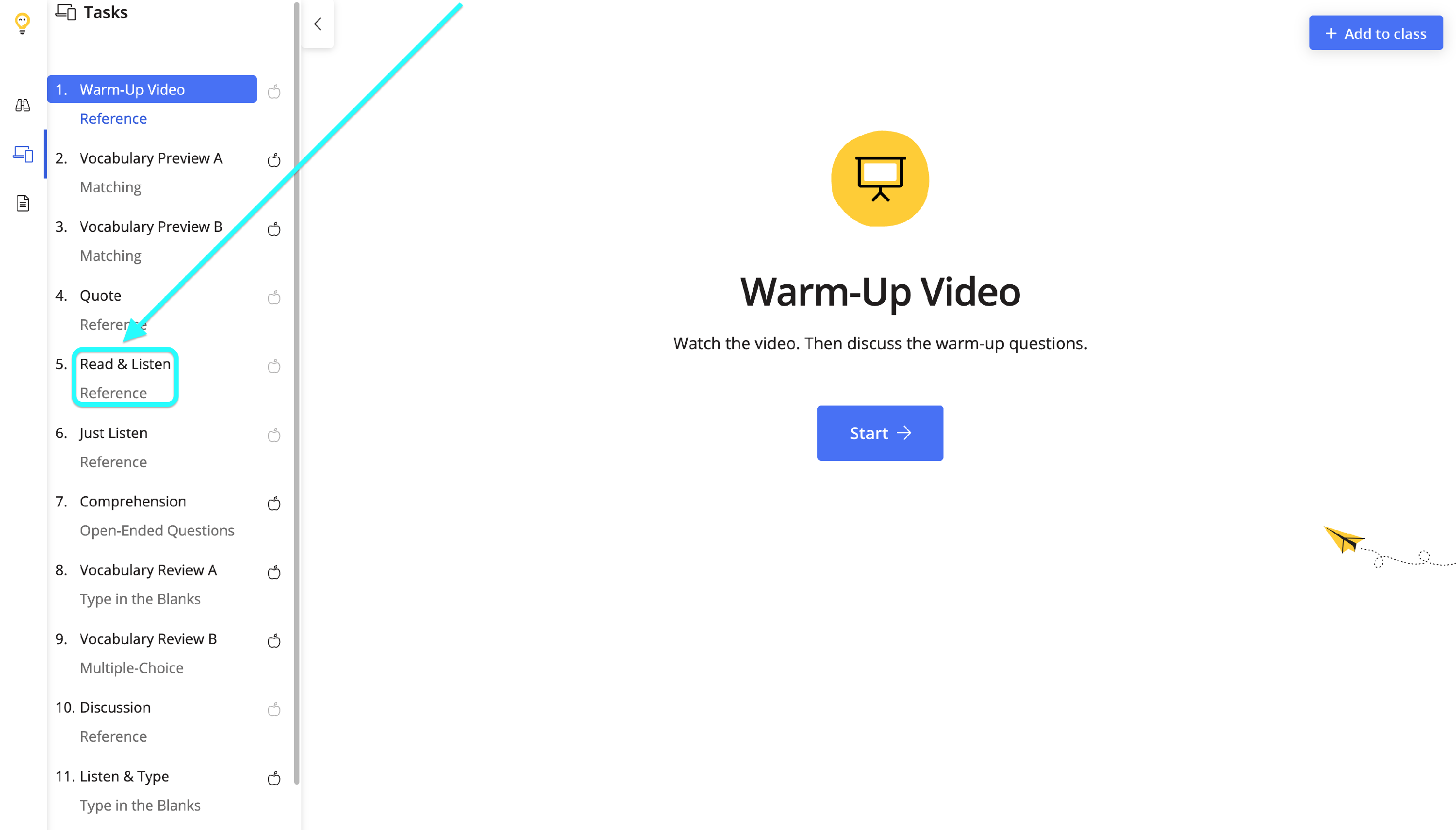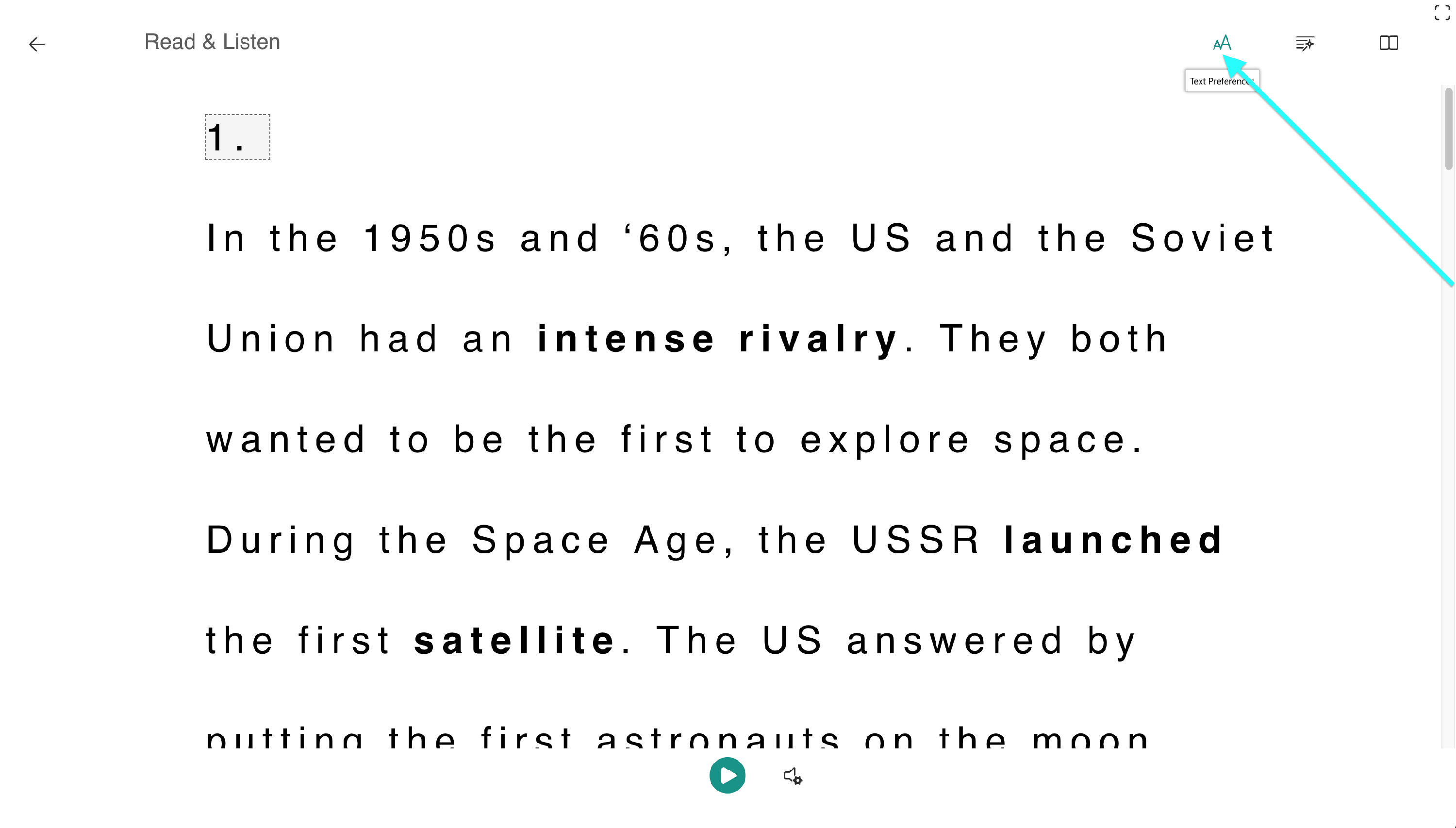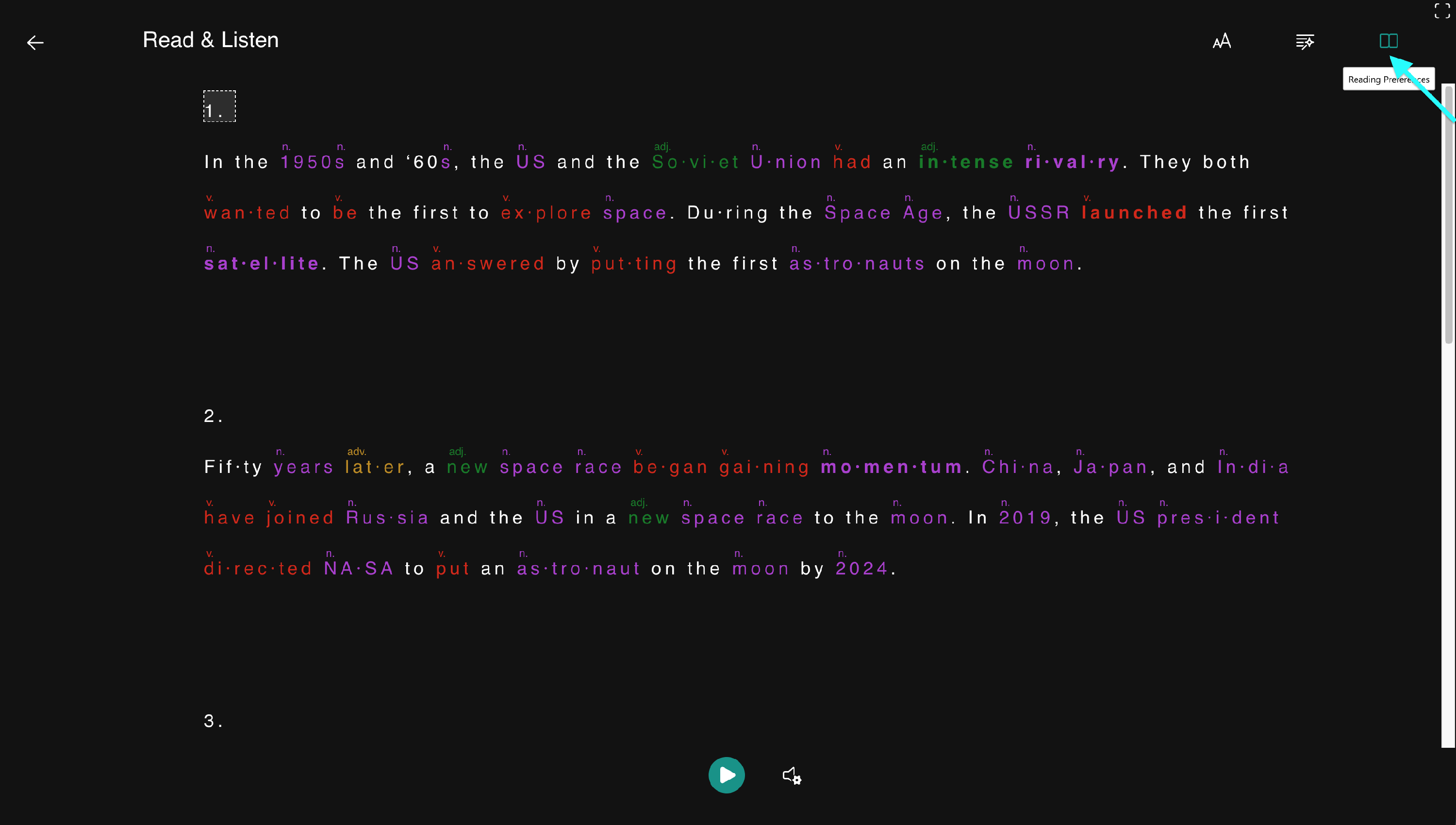 The Immersive Reader is integrated into our reading tasks. Look for a lesson that has a Read & Listen task listed on the Task Player.