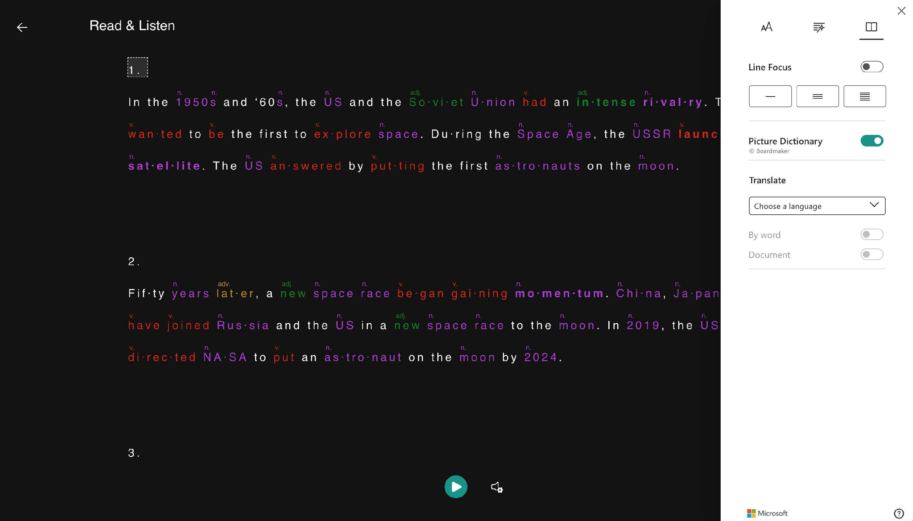 Clicking on the Reading Preferences button will allow you to change the line focus, show a picture dictionary for a specific word clicked or translate the word clicked (or the entire document) to the chosen language.