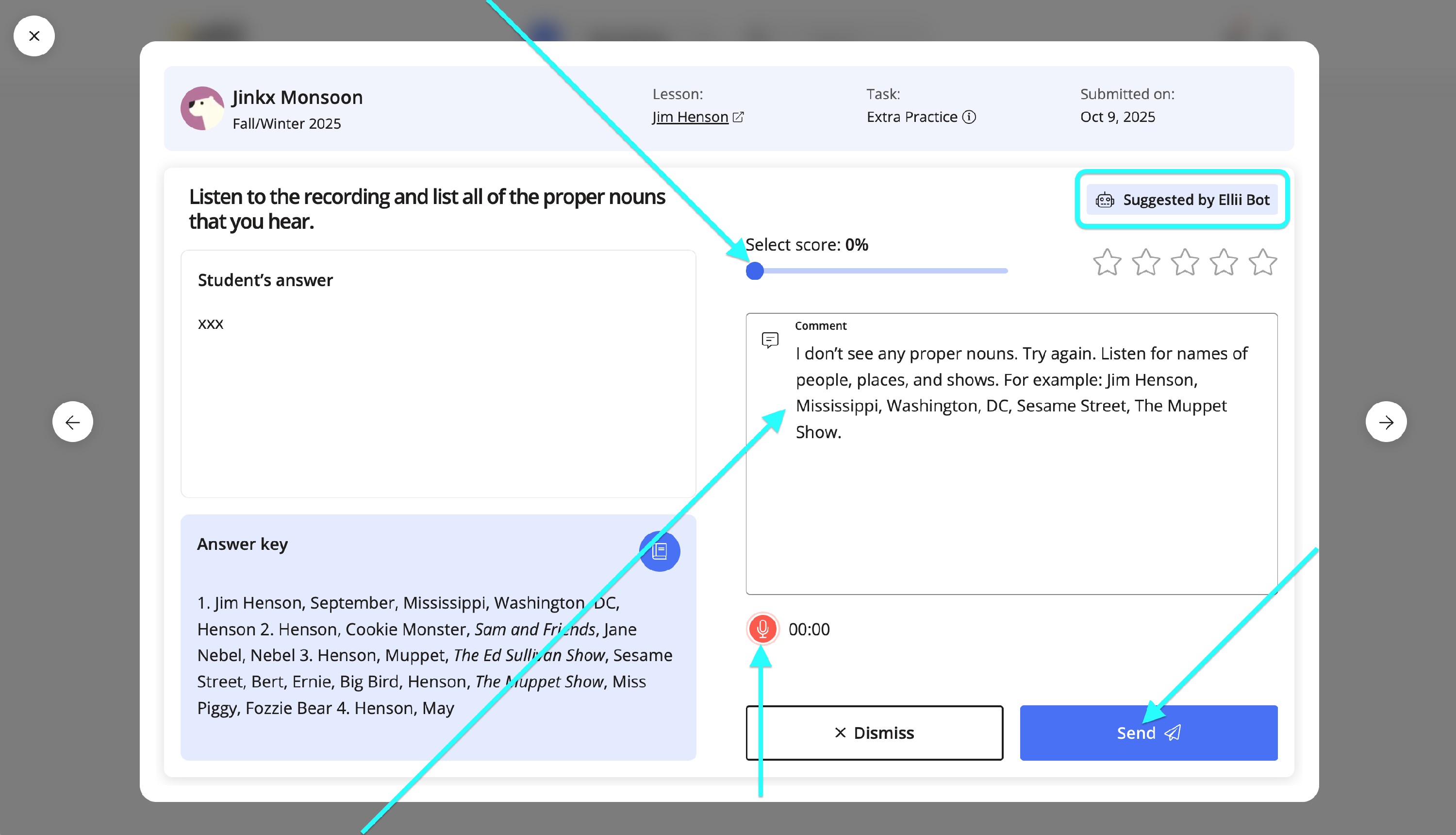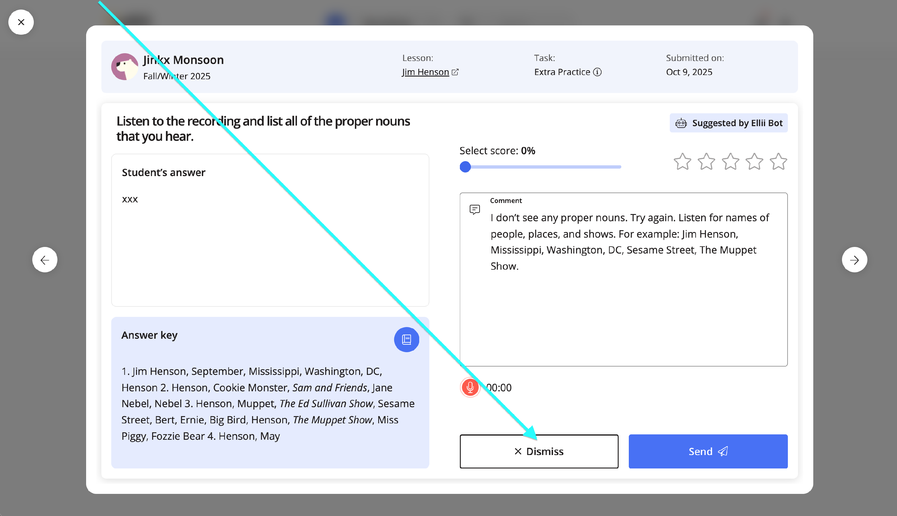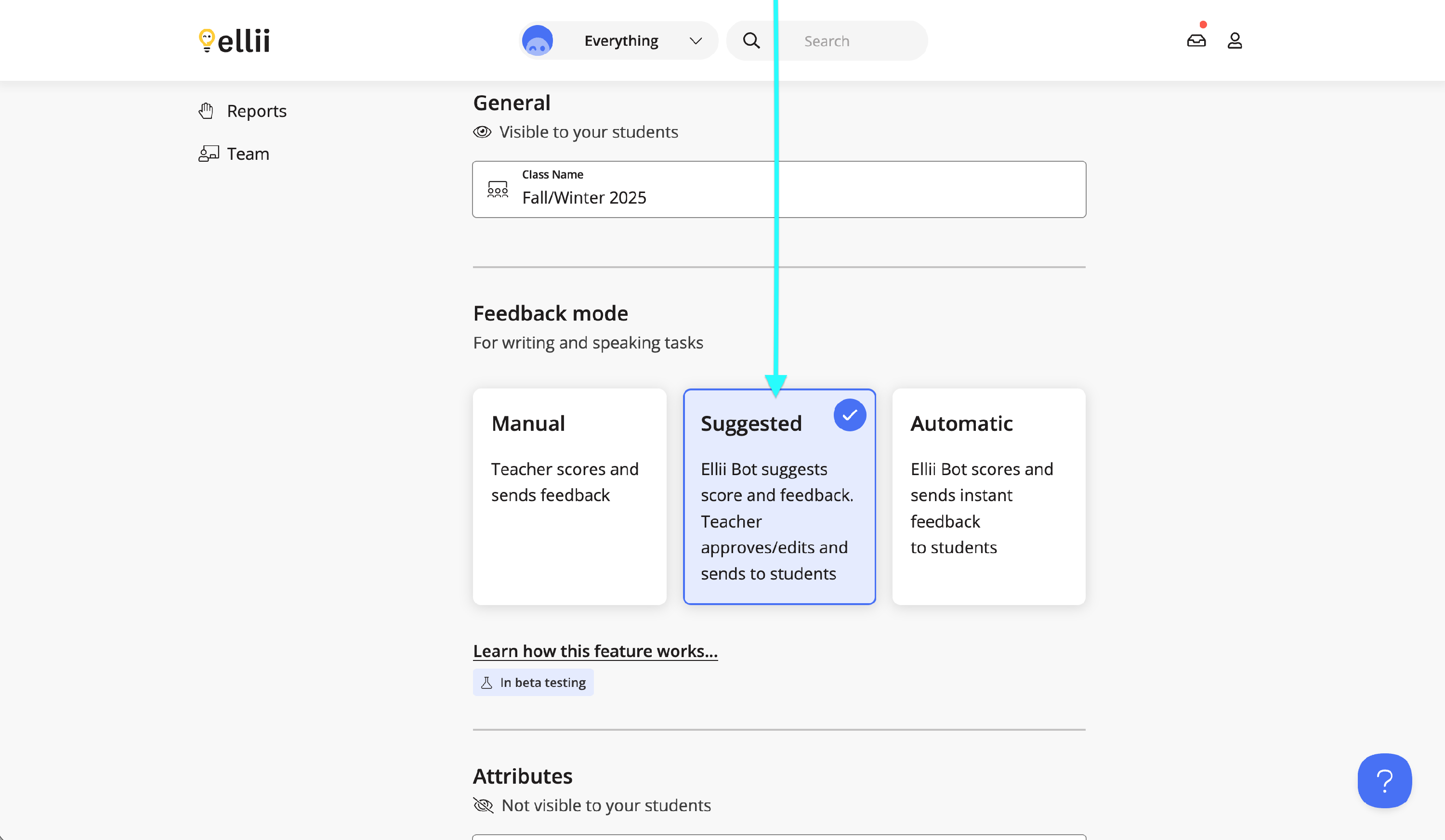 The Suggested Feedback Mode will require the teacher to approve/edit the scores & feedback that Ellii Bot has generated and then send it to their students.