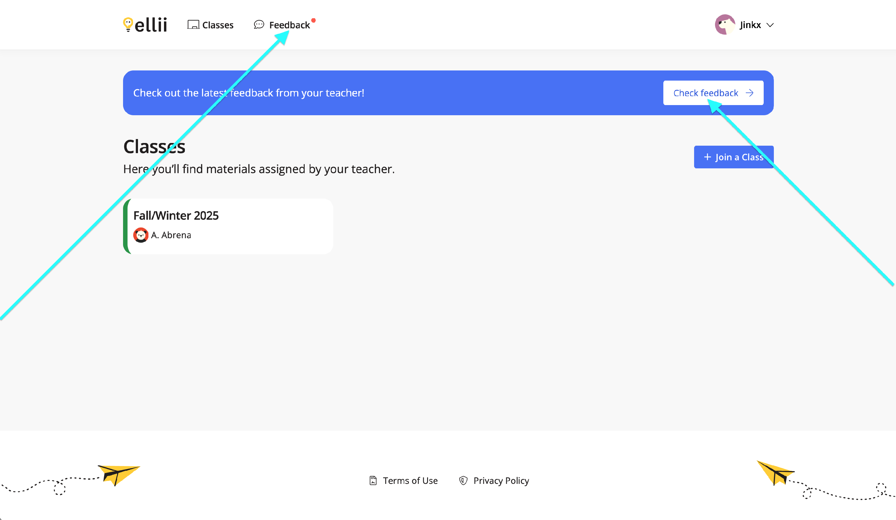 After logging into their Student Dashboard (https://ellii.com/students), students will click on the Feedback or Check Feedback button.
