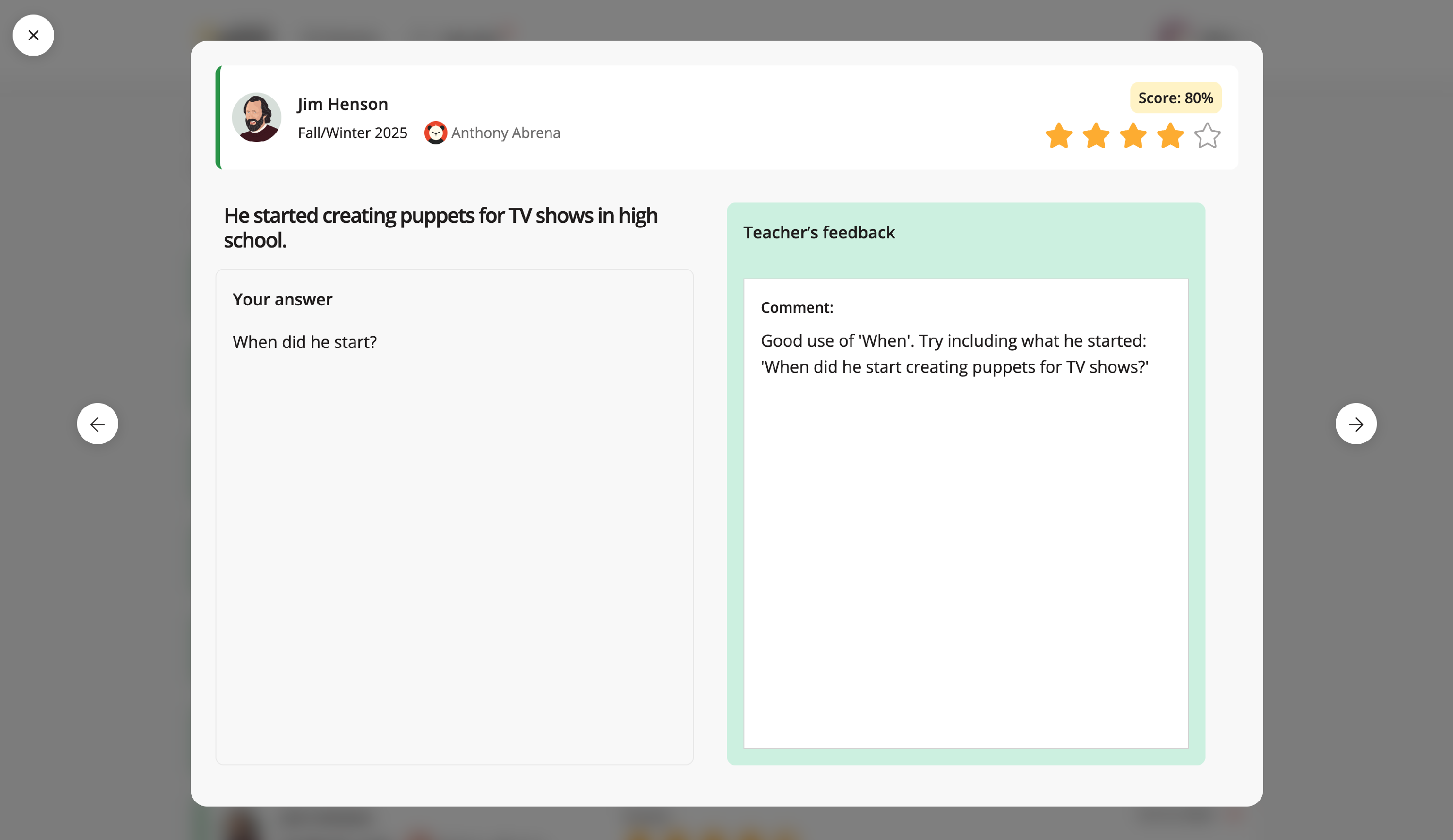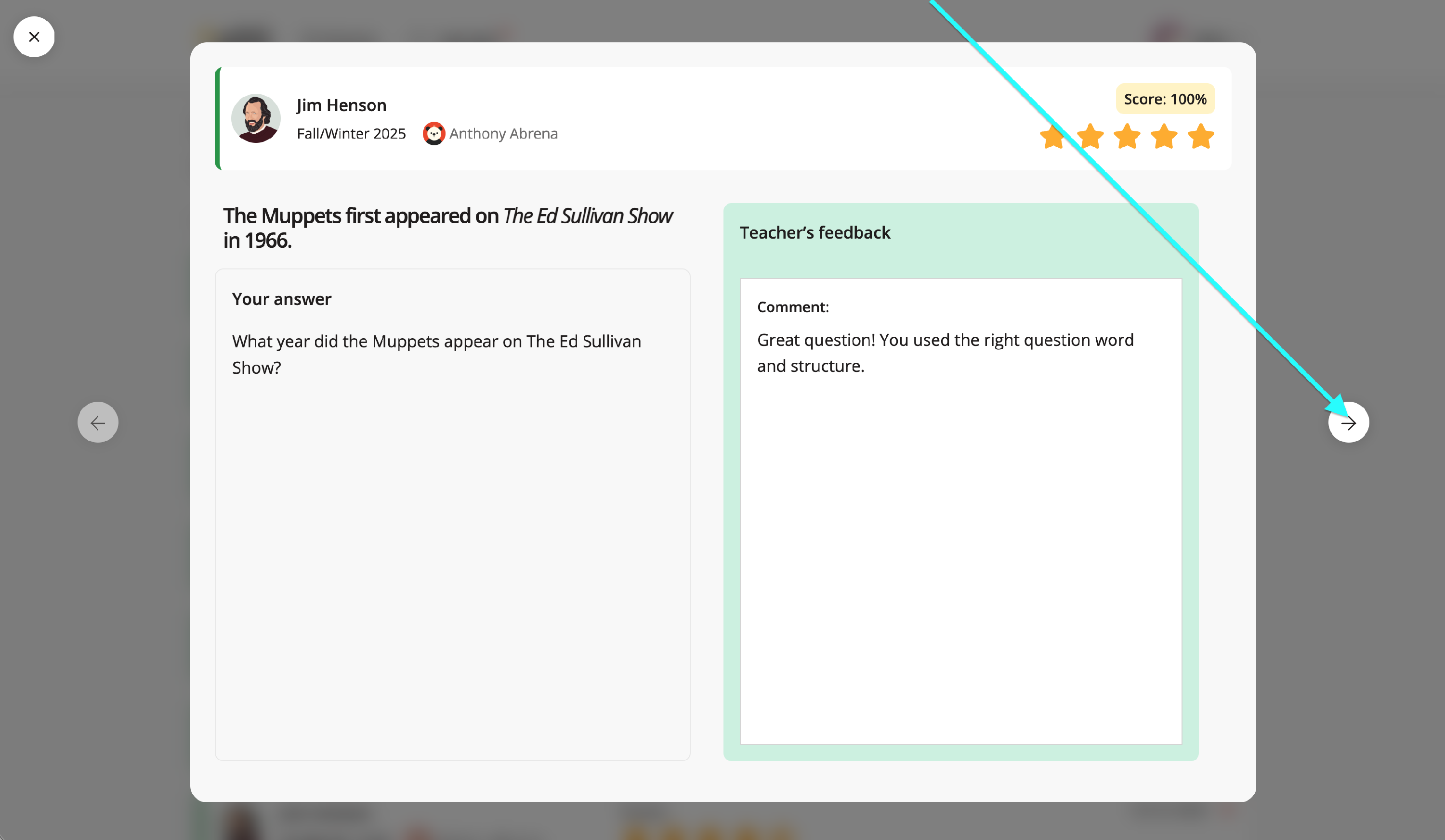Students can click on the forward-facing arrow to go to the next teacher feedback.