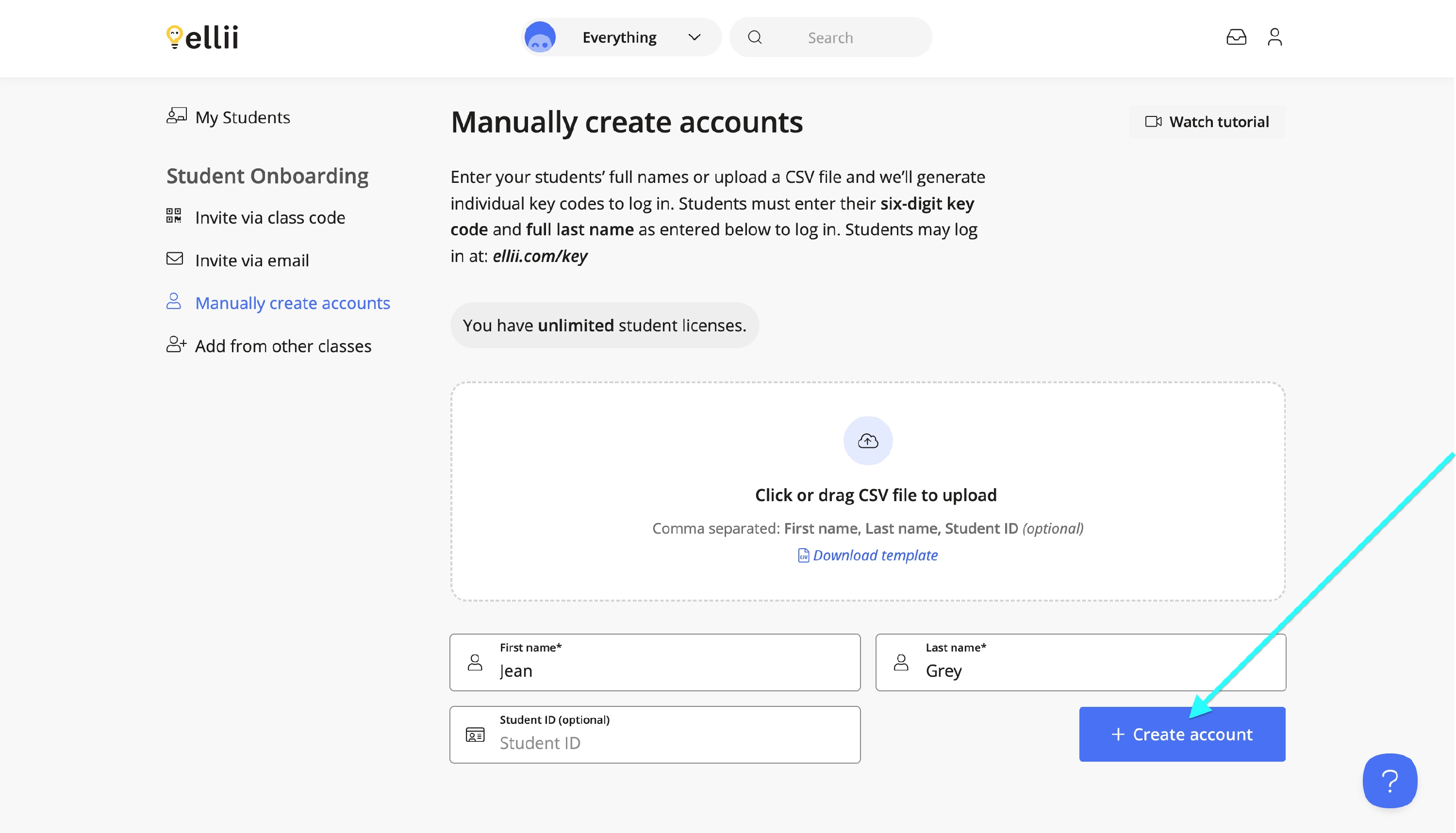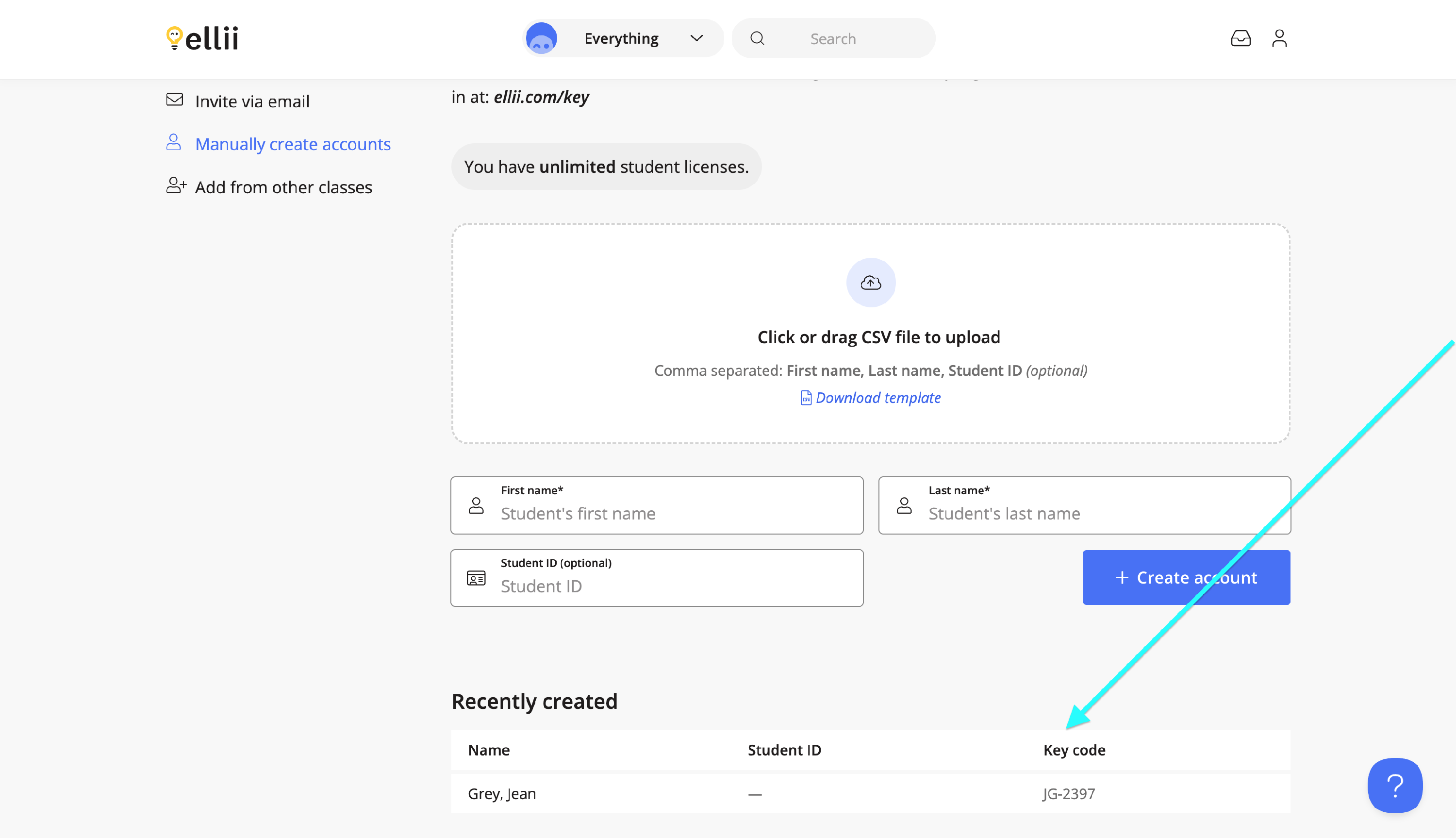 Instead of creating a username and password for each student, you will now simply need to enter their First and Last Name. Ellii will then generate a Key Code made up of two letters and four numbers.