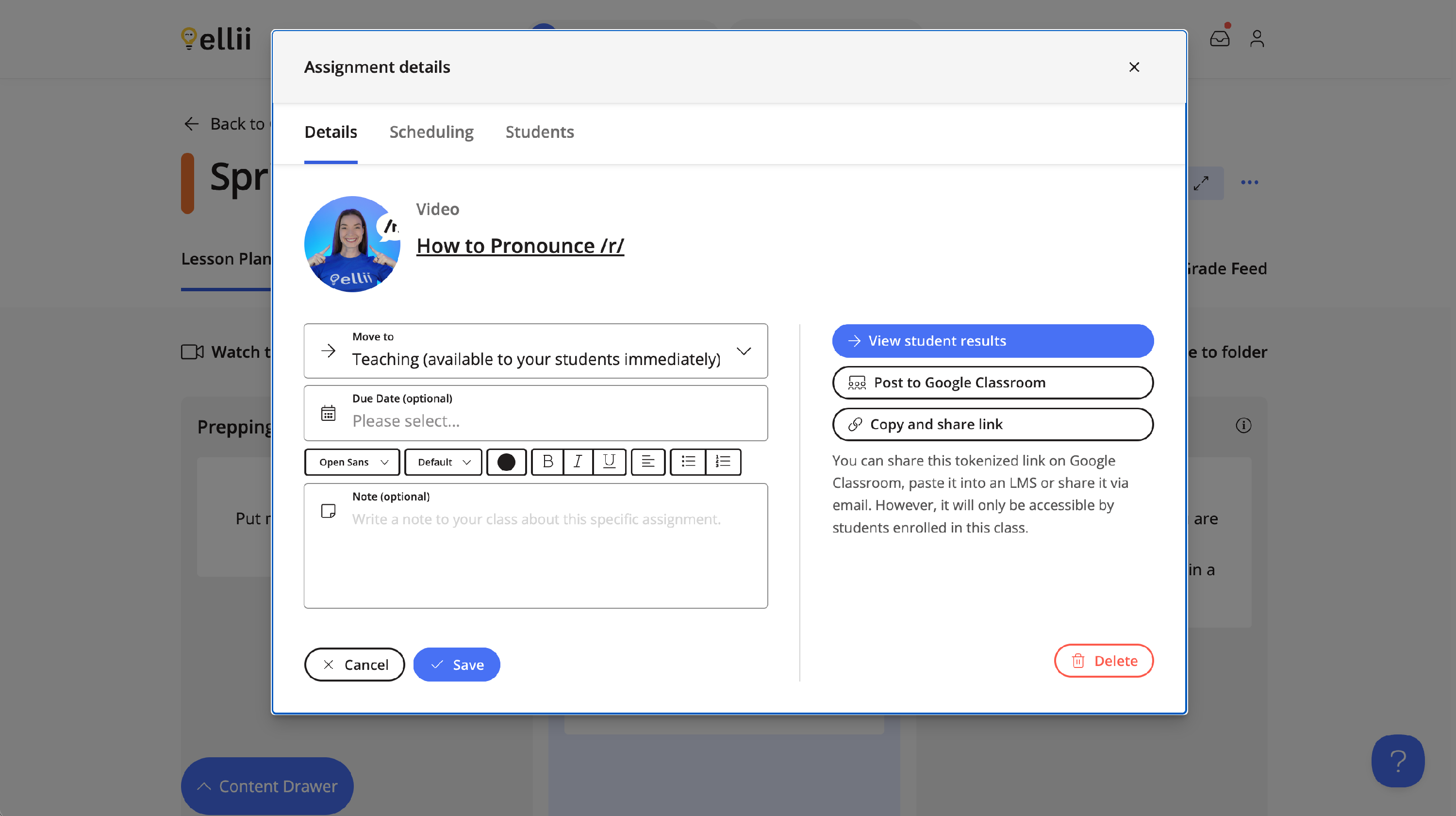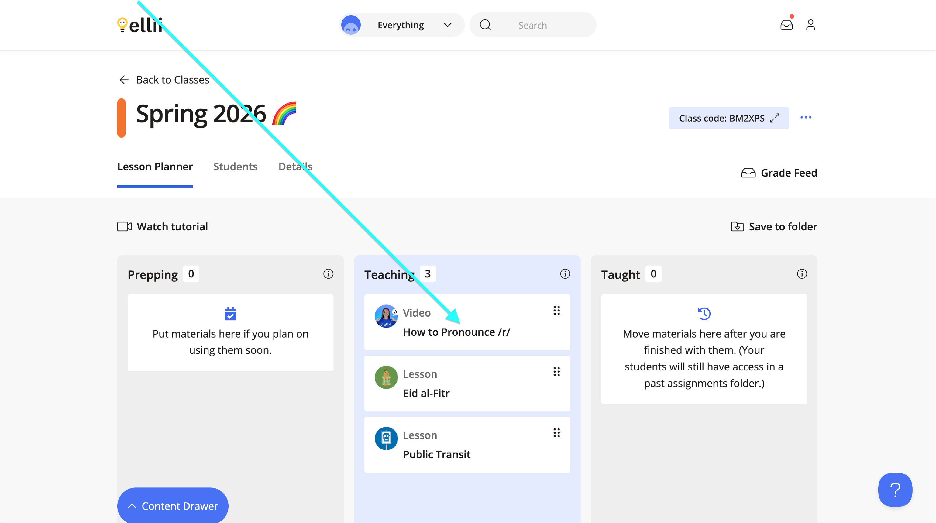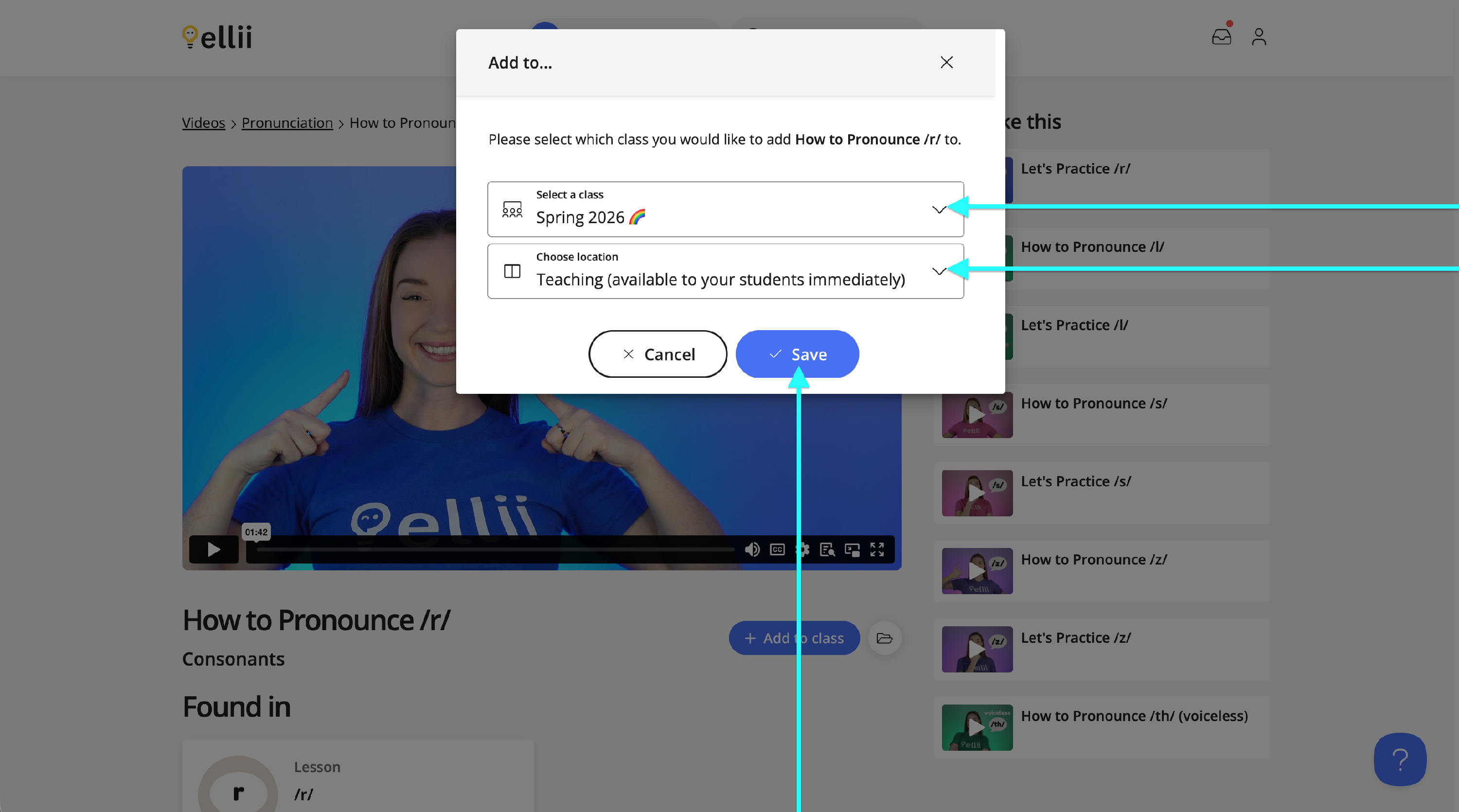 Select a class and location from the dropdown menu (selecting Teaching will make it available to your students right away). Click Save once finished.