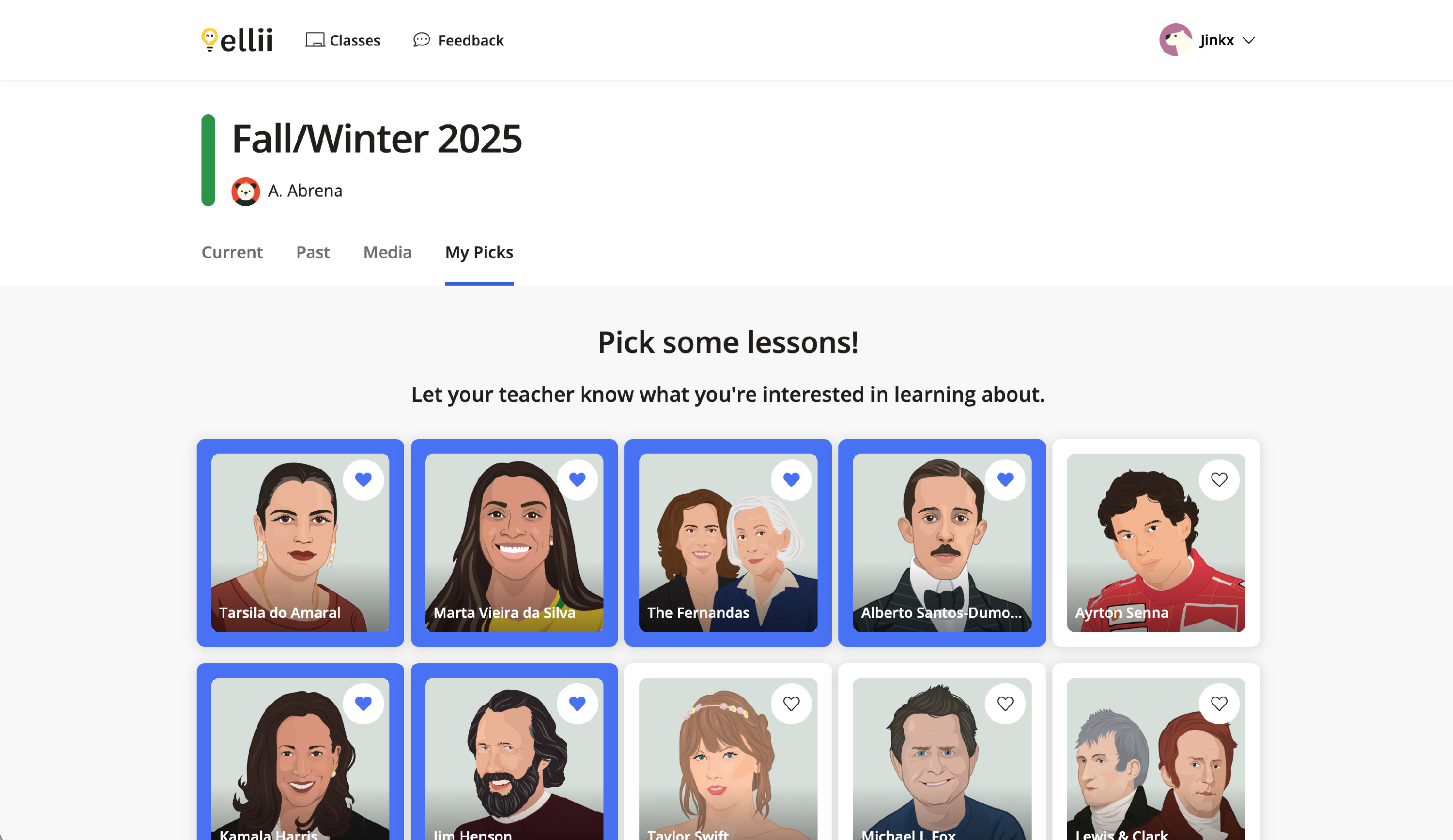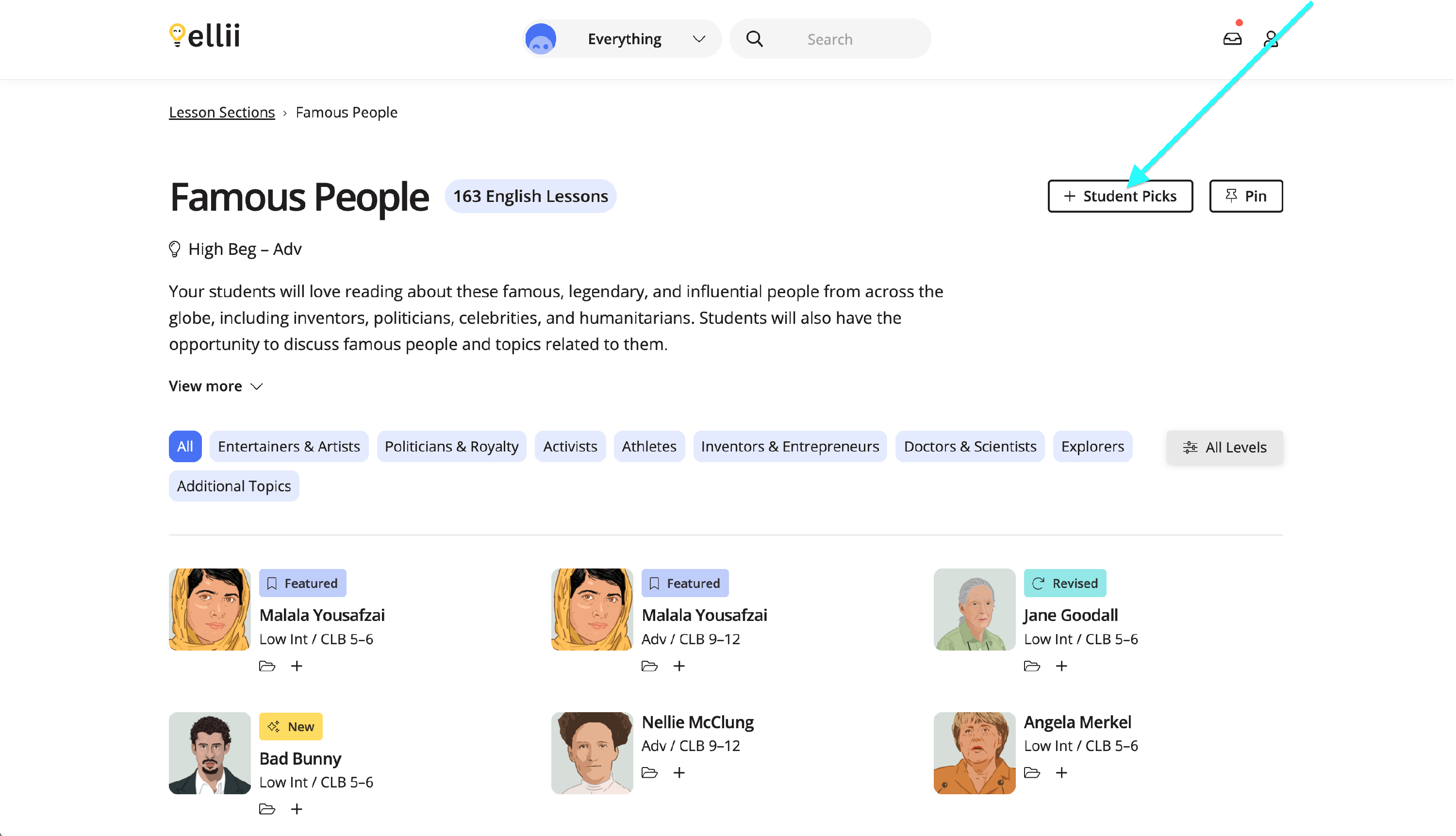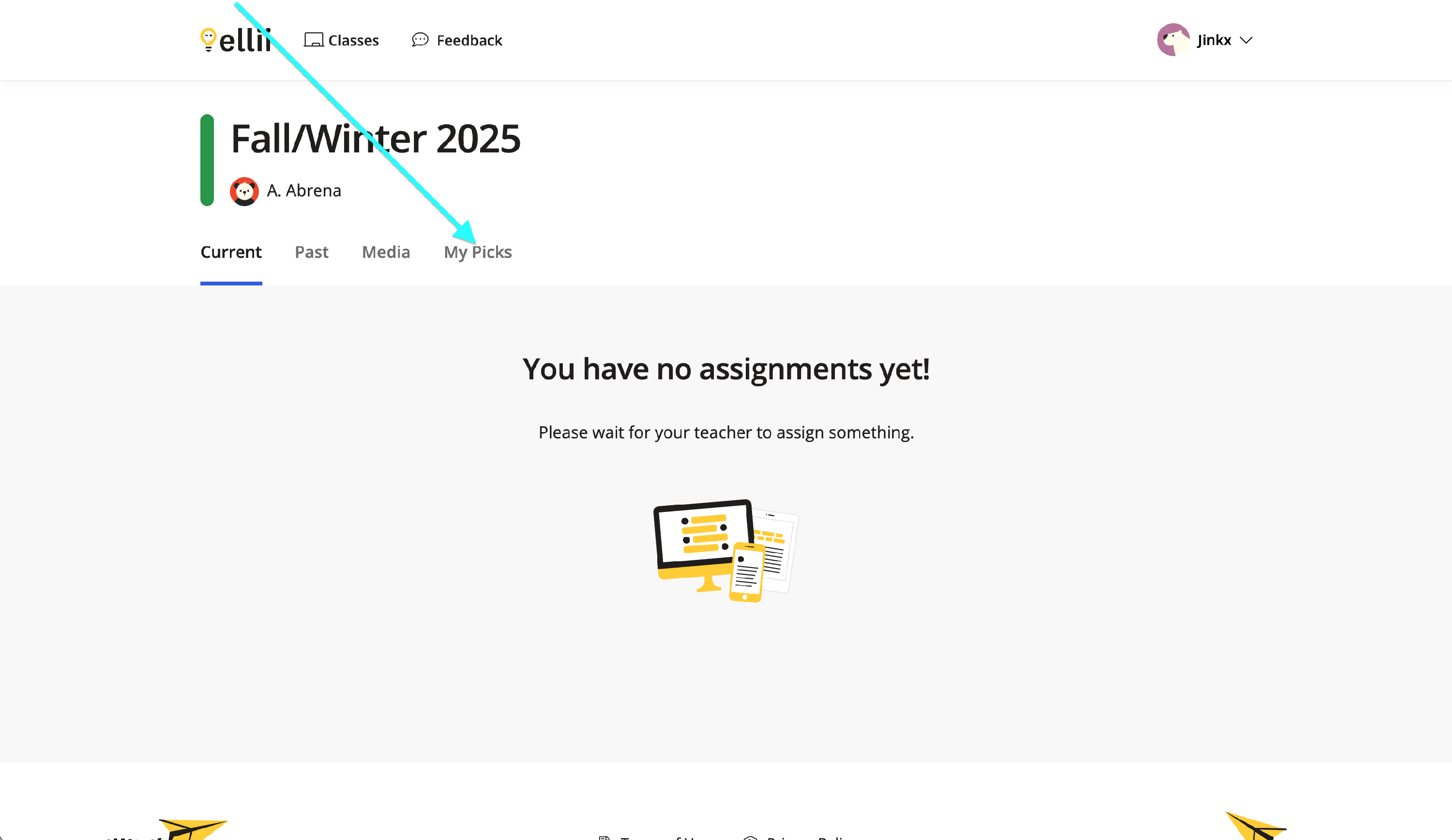 Students will log in on their end via https://ellii.com/students/login, click on your class and navigate over to My Picks.