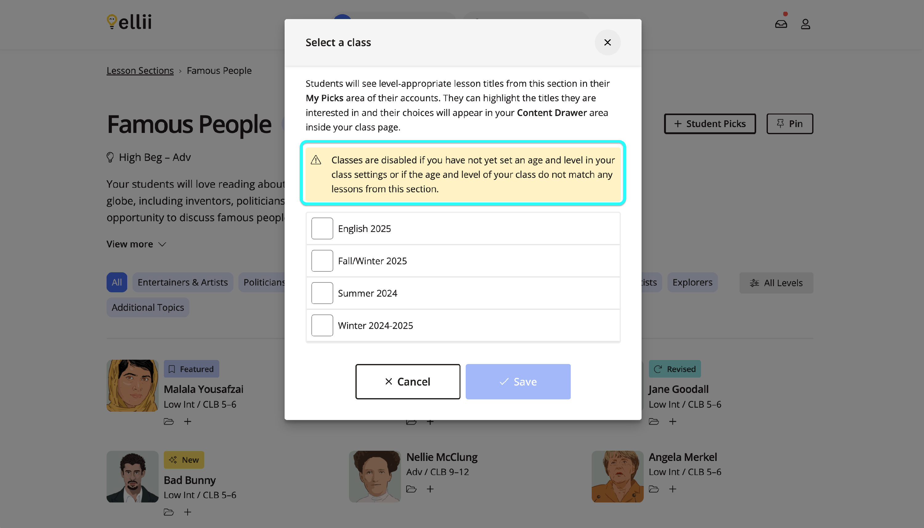 Classes are disabled if you have not yet set an age and level in your class settings or if the age and level of your class do not match any lessons from the category you have chosen.