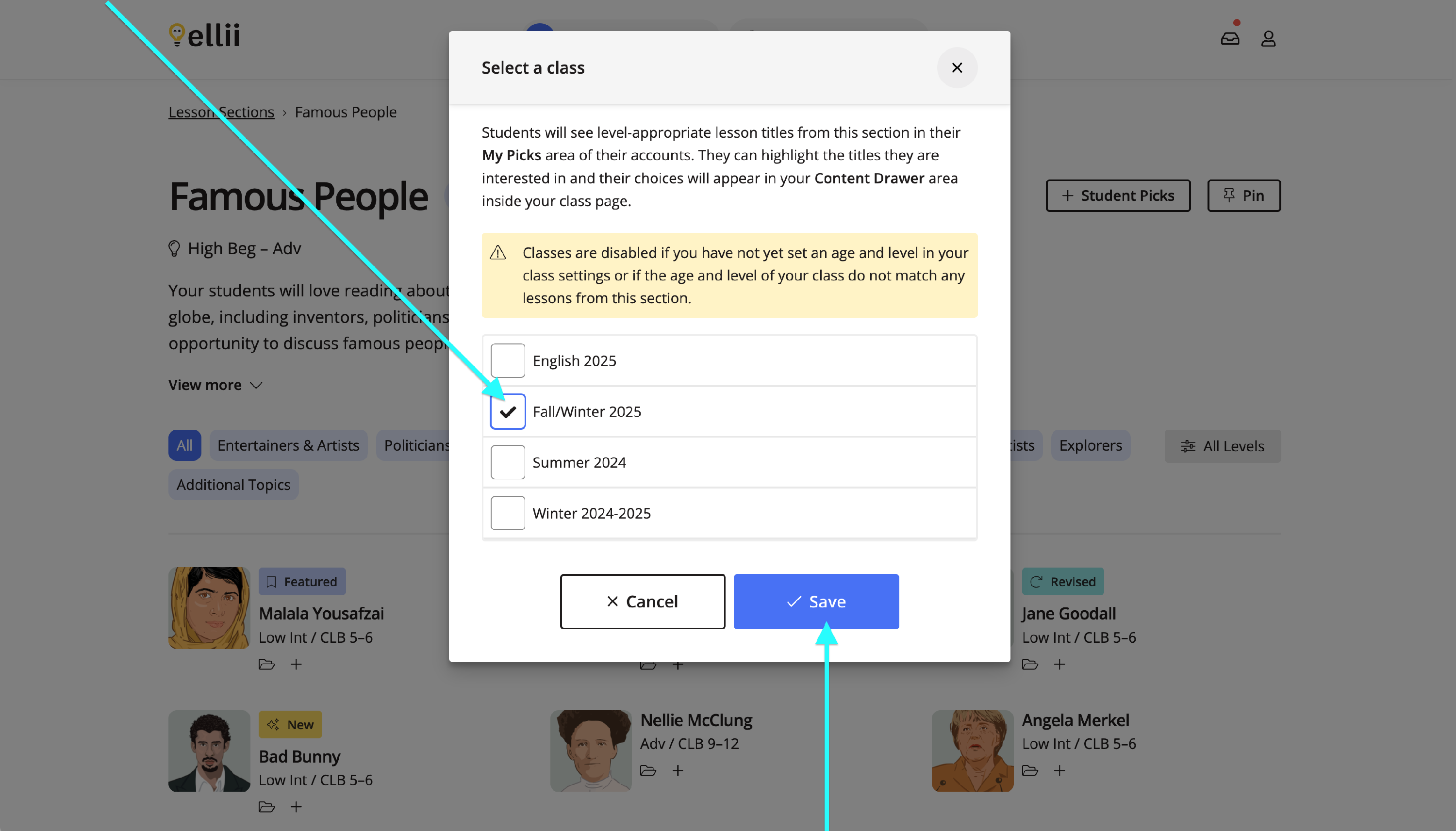 After the age and level has been set for your class, you can then select the class to include in Student Picks.