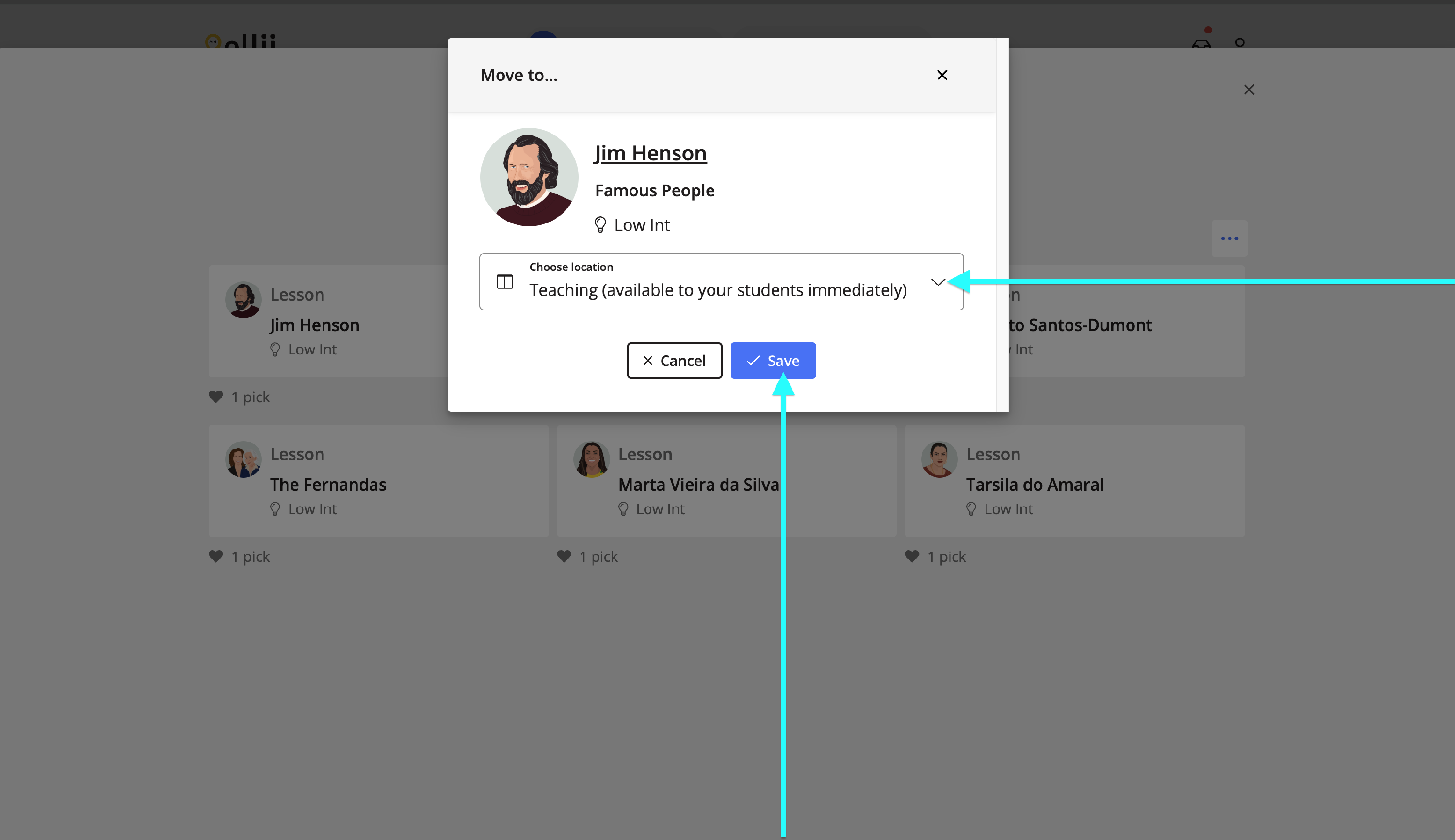The student(s) will see the lesson(s) in their Student Dashboard the next time they log in (if the teacher chose Teaching as the location).