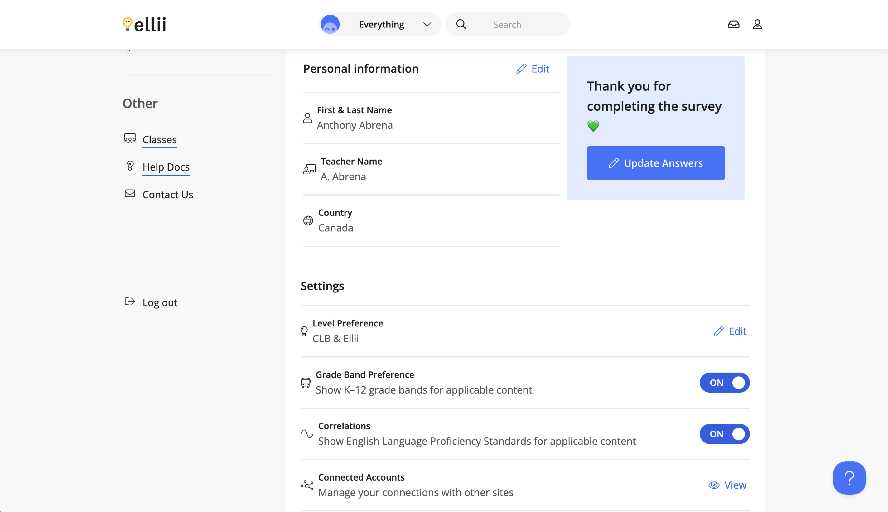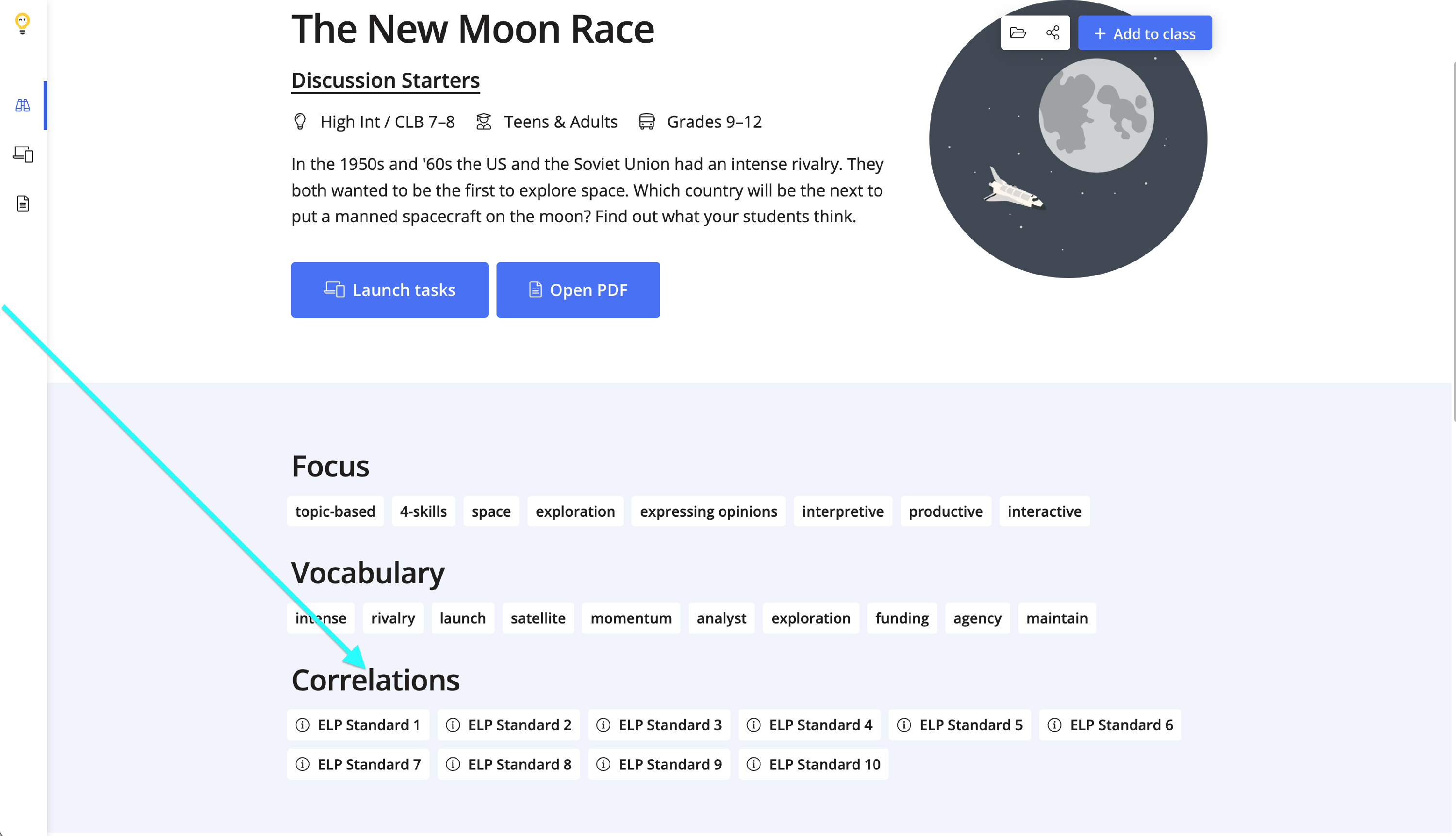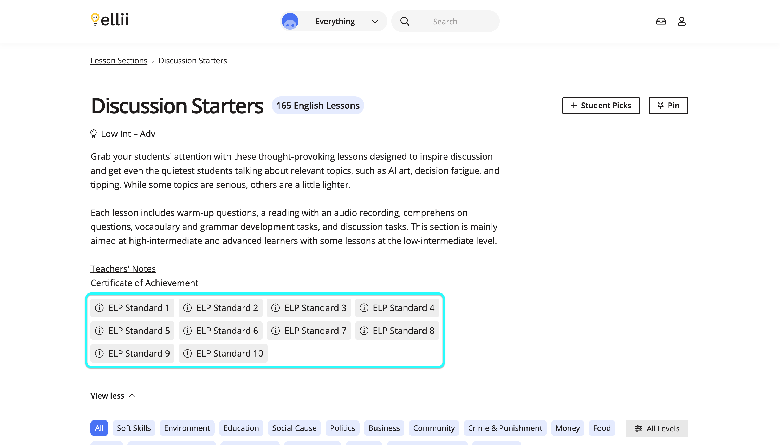 You will now see the correlations for the ELPS (English Language Proficiency Standards) for applicable content on Ellii.