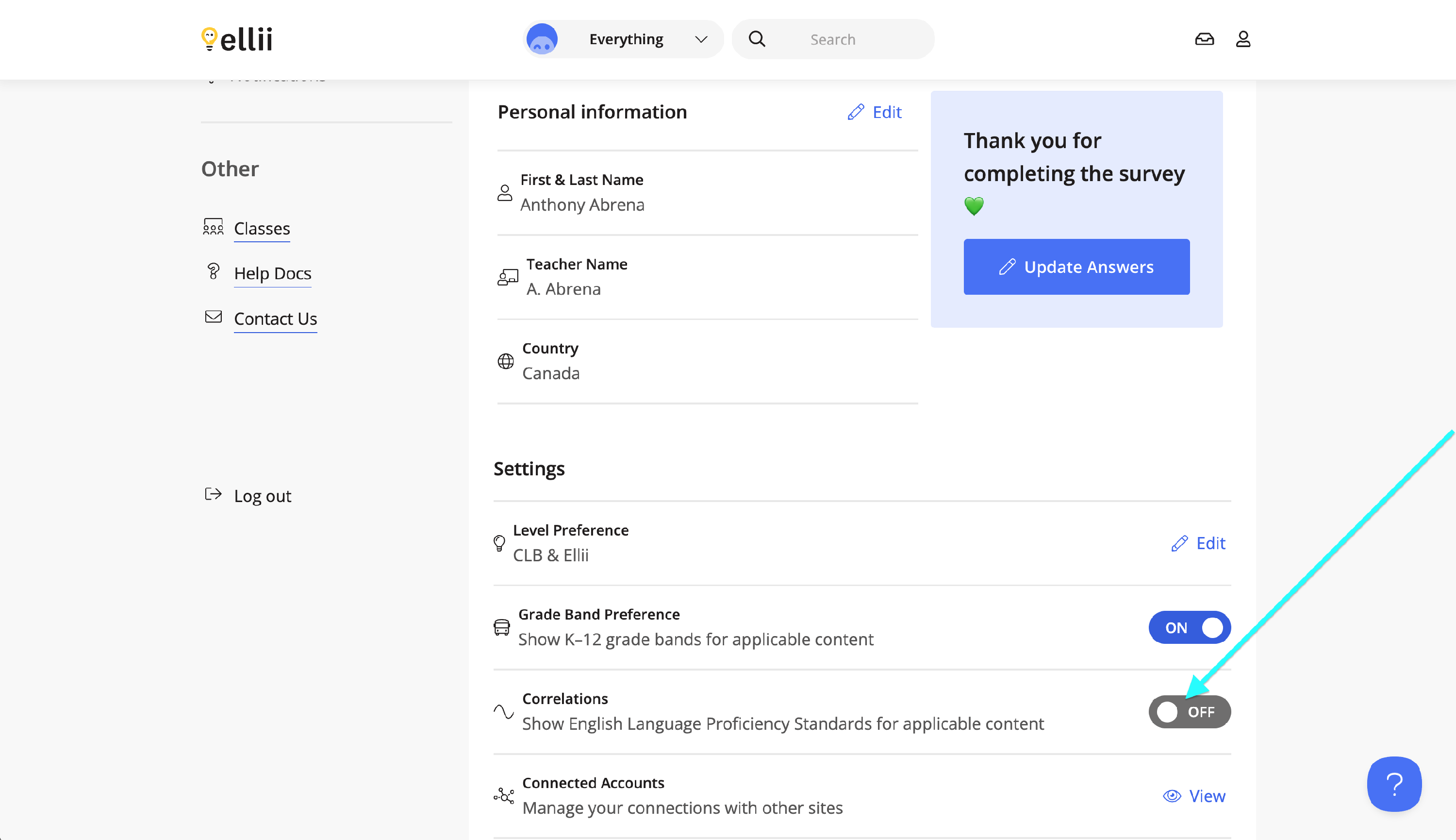 How to Turn On Correlations to the ELPS (English Language Proficiency Standards)