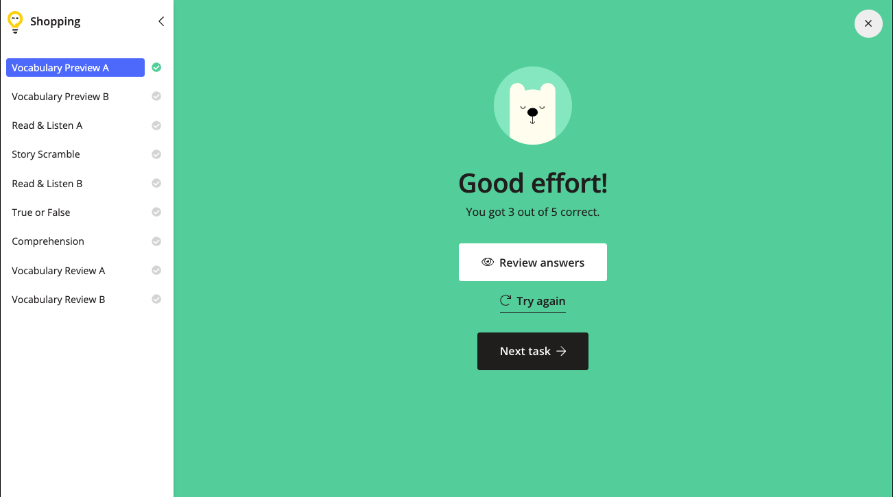 If they minimize the window or open a new tab, we pause, and resume when they come back. We save time spent on all tasks, and add it all up to calculate the overall lesson total time. For example: