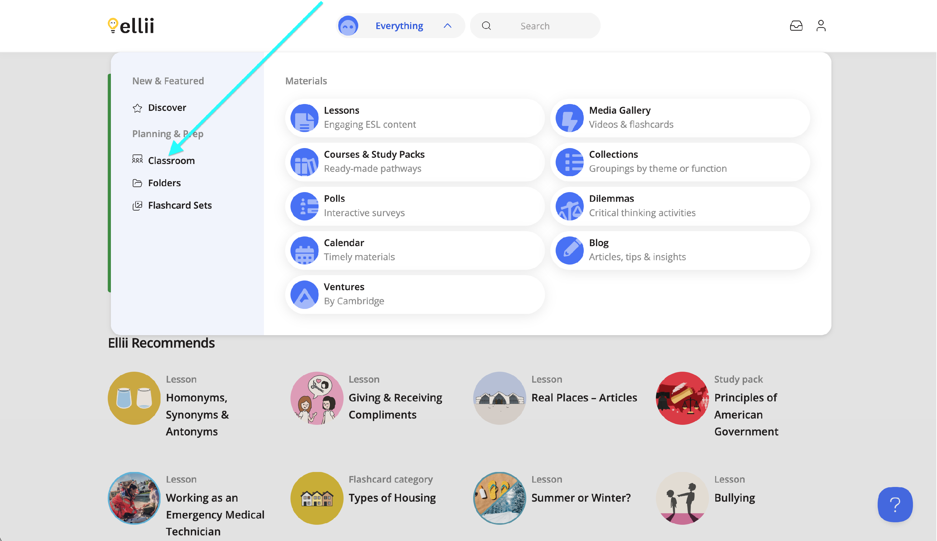 Once logged in to your account, click on the Everything menu and select Classroom.