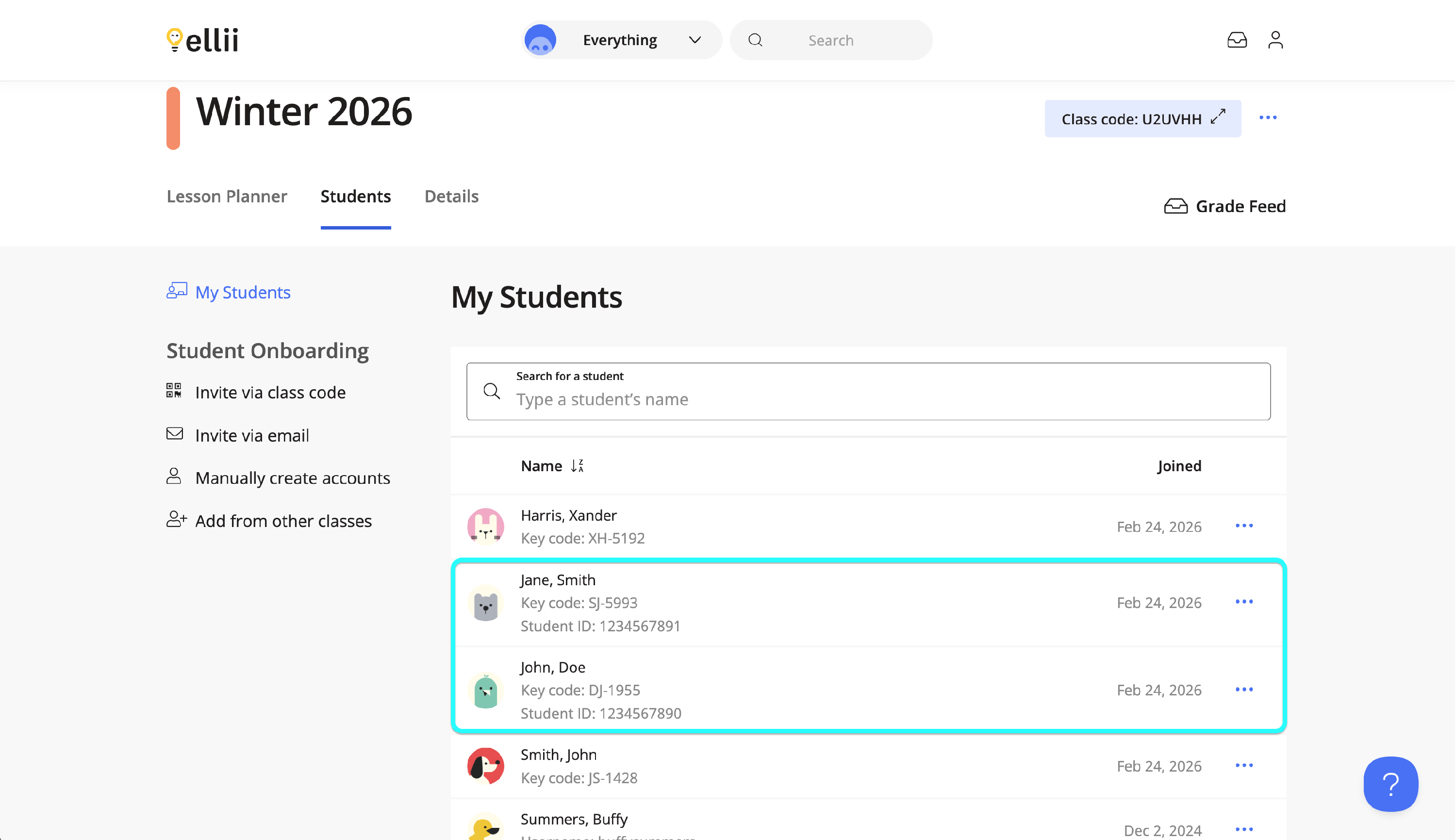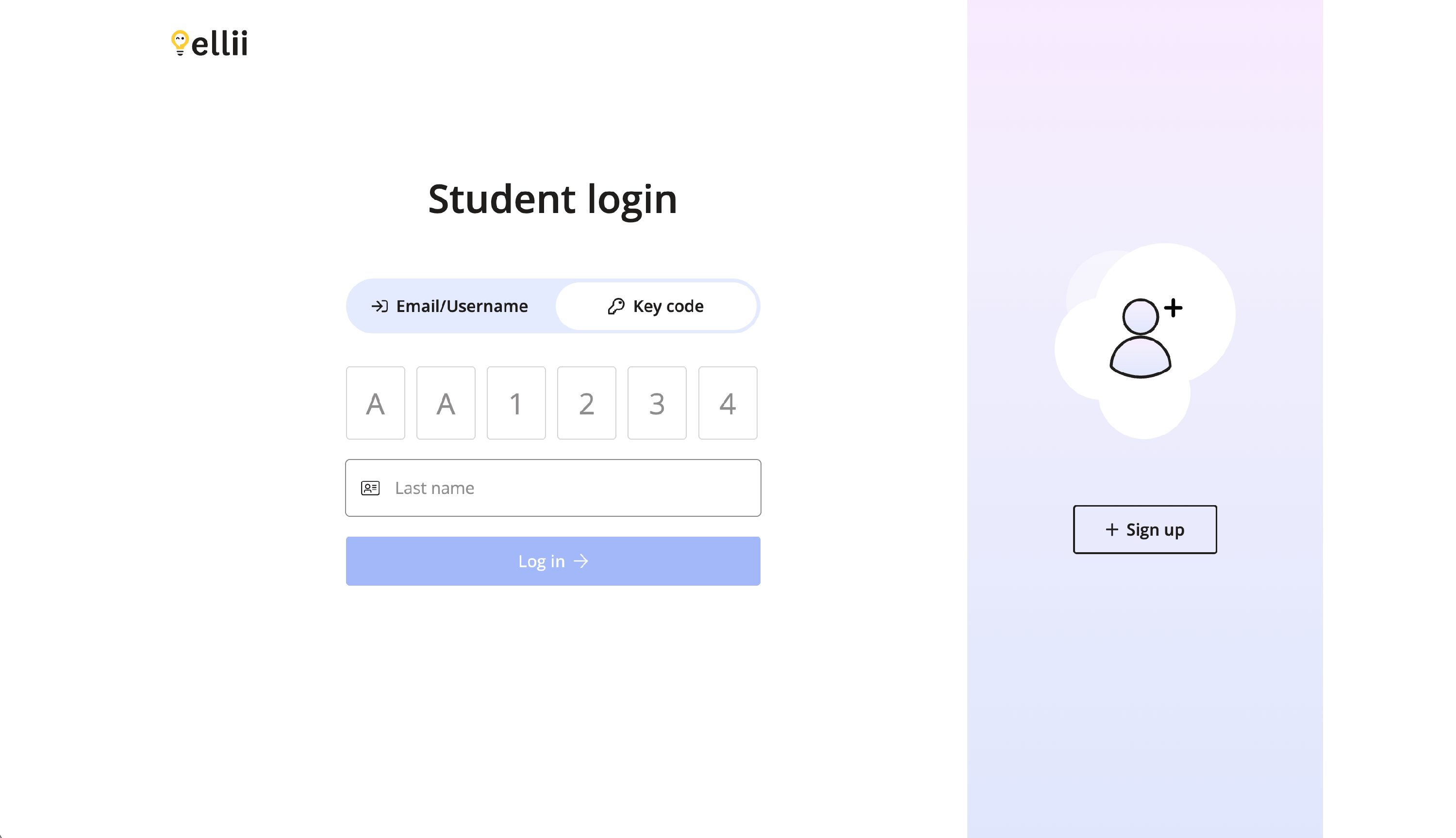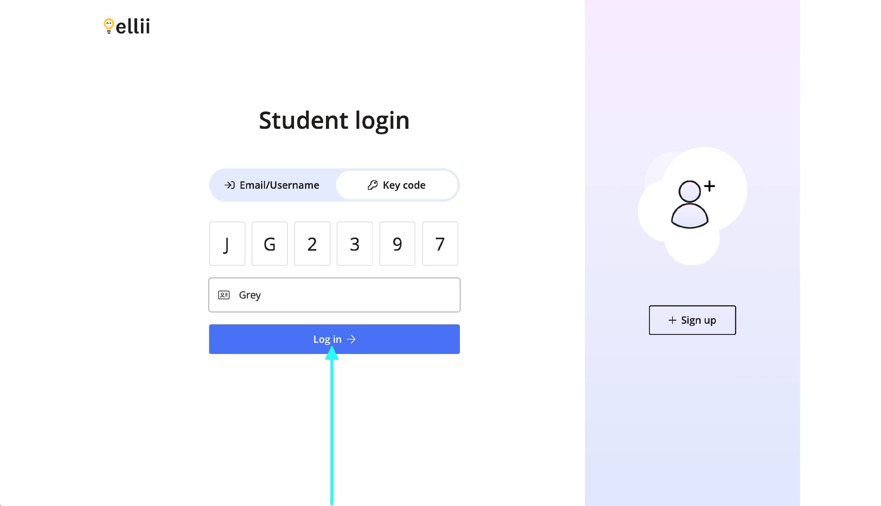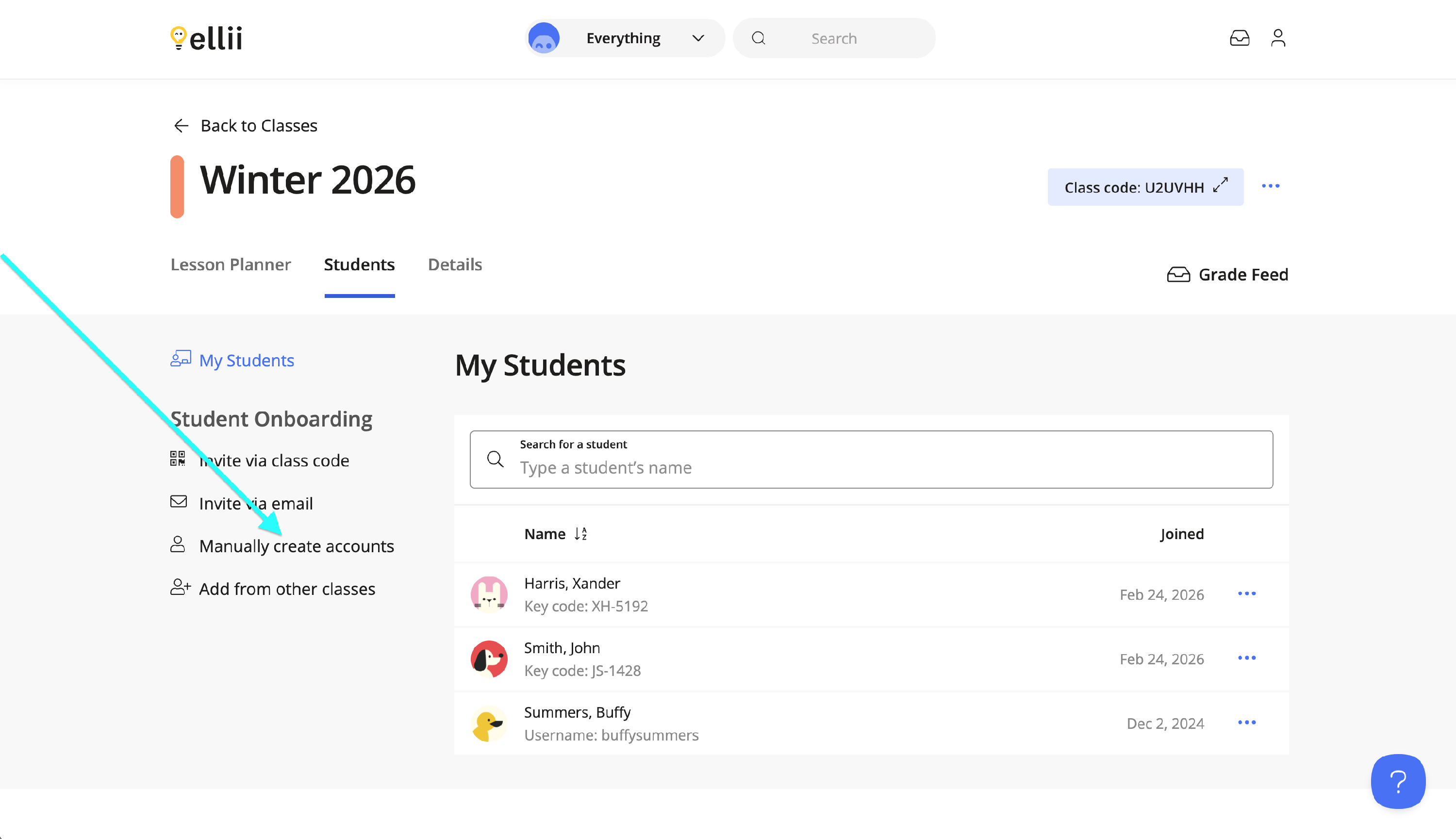 Instead of creating a username and password for each student, you will now simply need to enter their First and Last Name. Ellii will then generate a Key Code made up of two letters and four numbers.