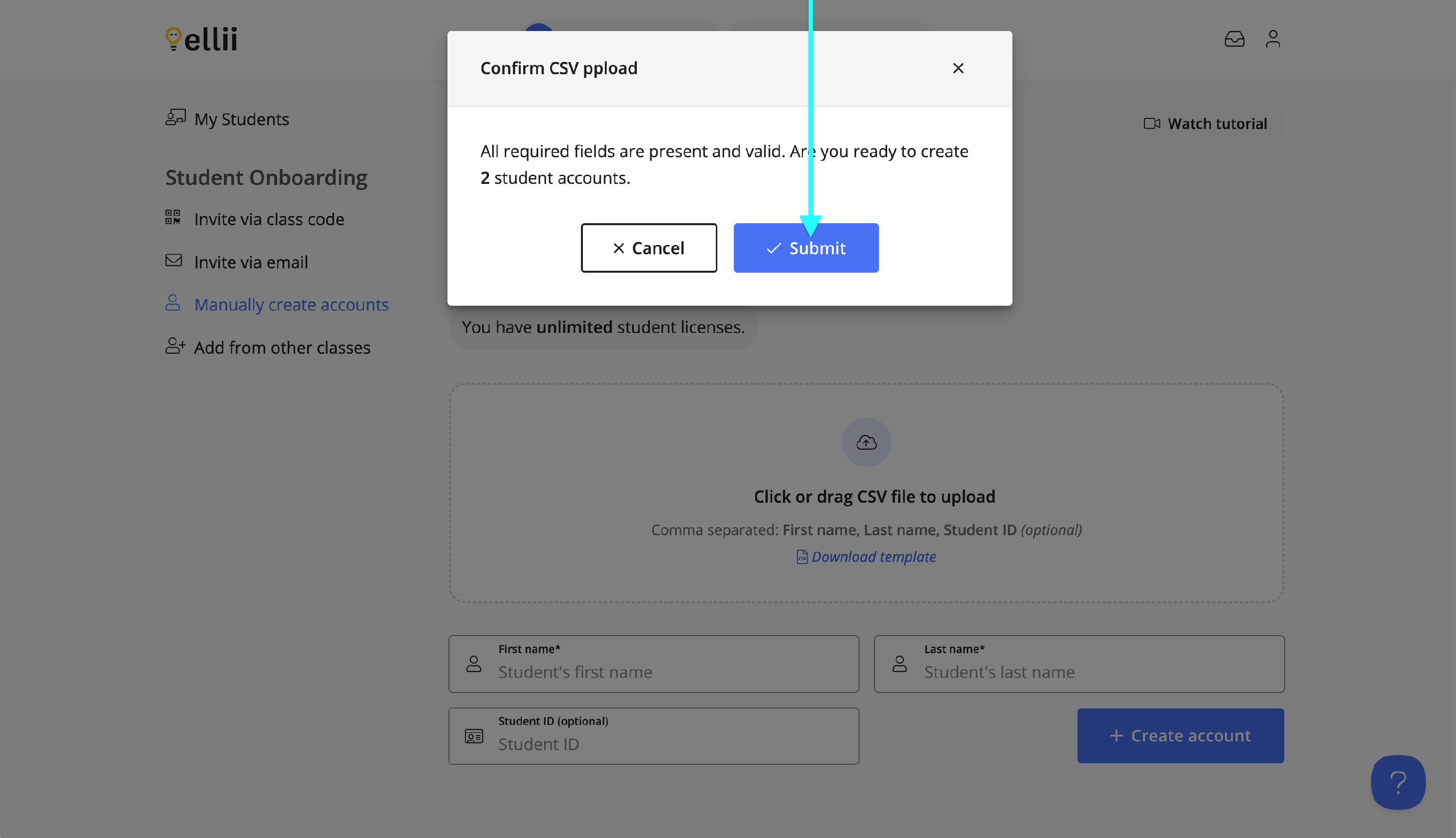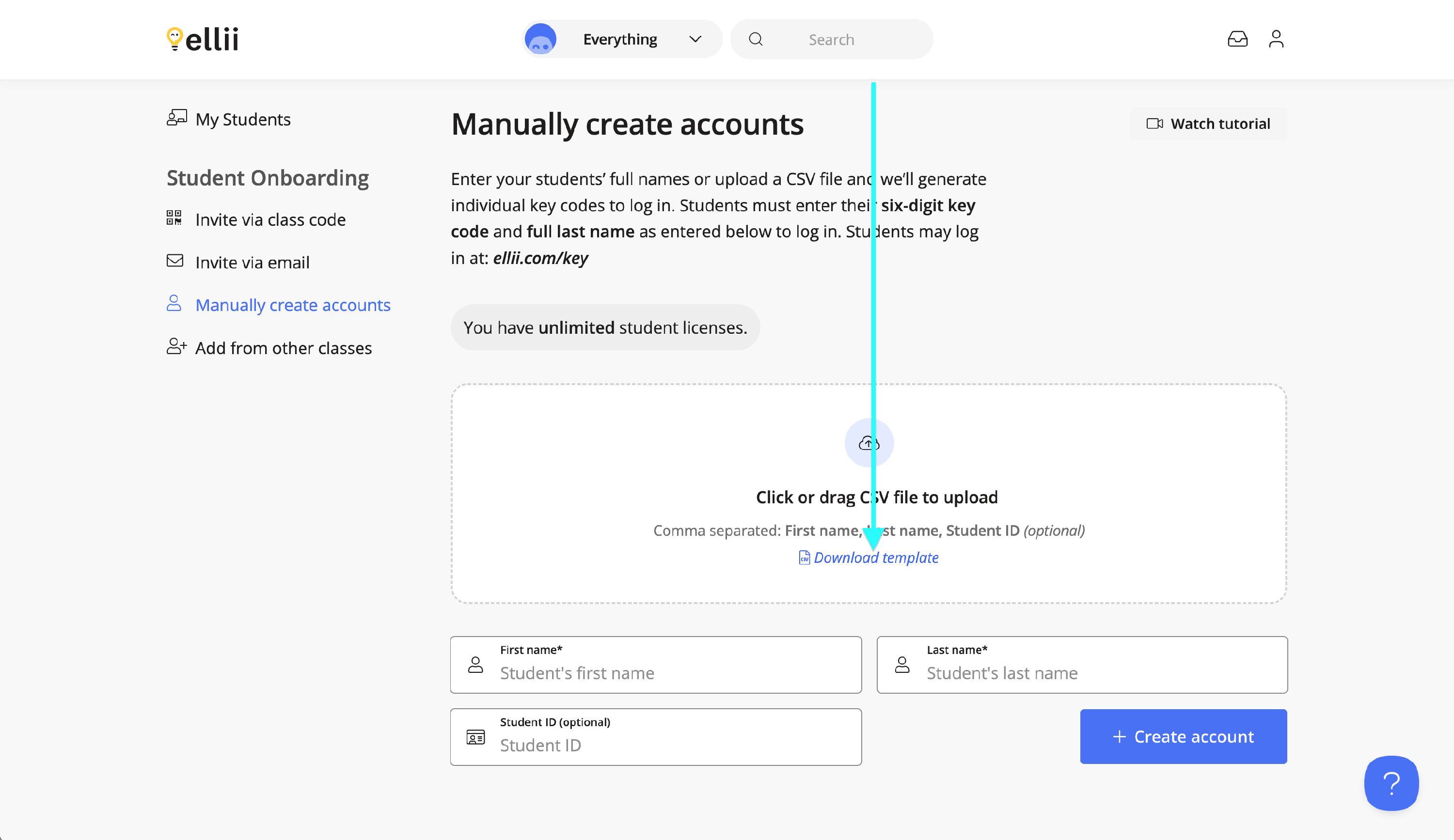 You can create multiple student accounts at once by downloading the CSV file template.
