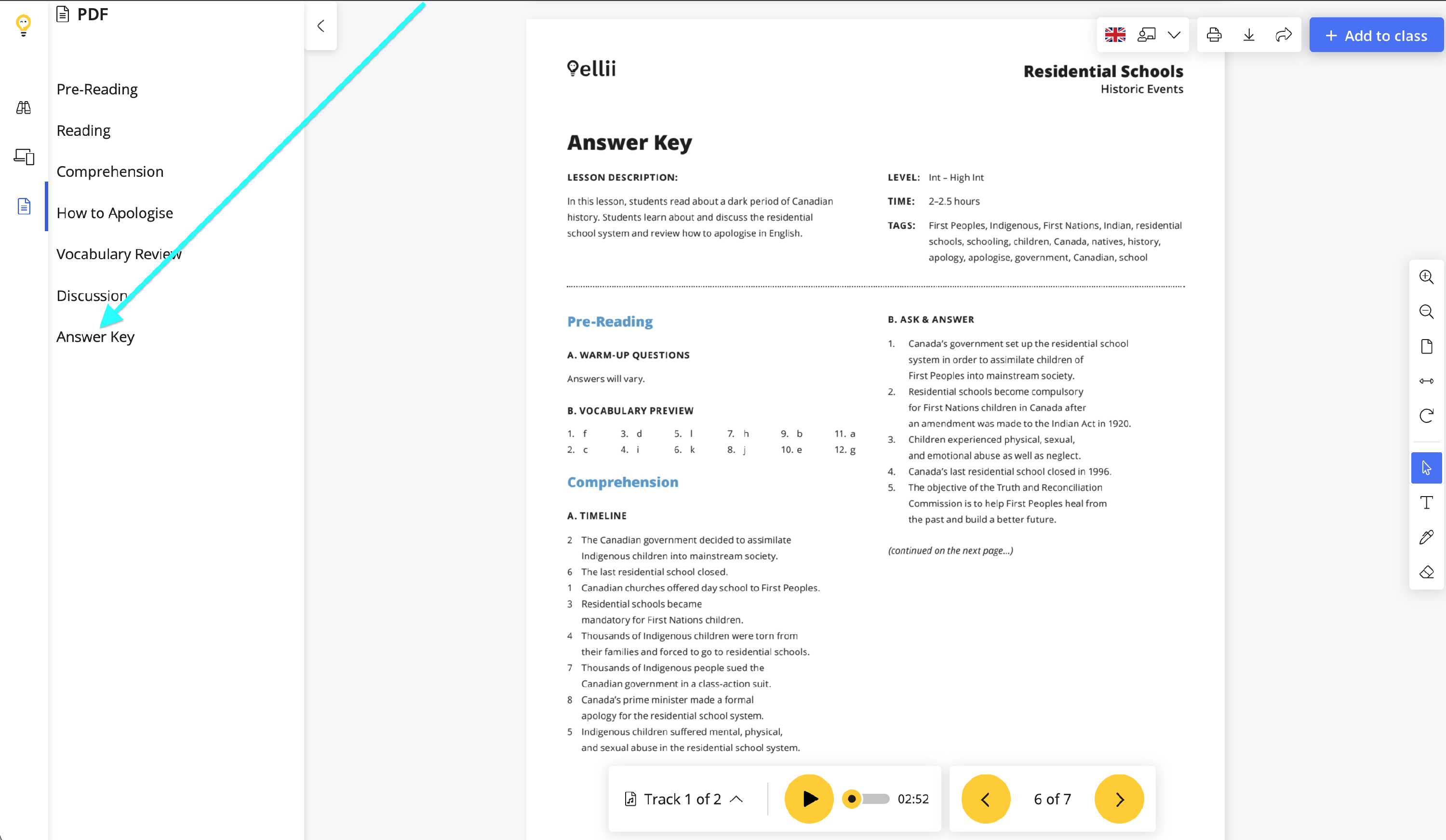 Once you scroll through the lesson, you will notice the final few pages are dedicated to the answer key, teachers' notes, and any other supplementary materials a lesson may contain.