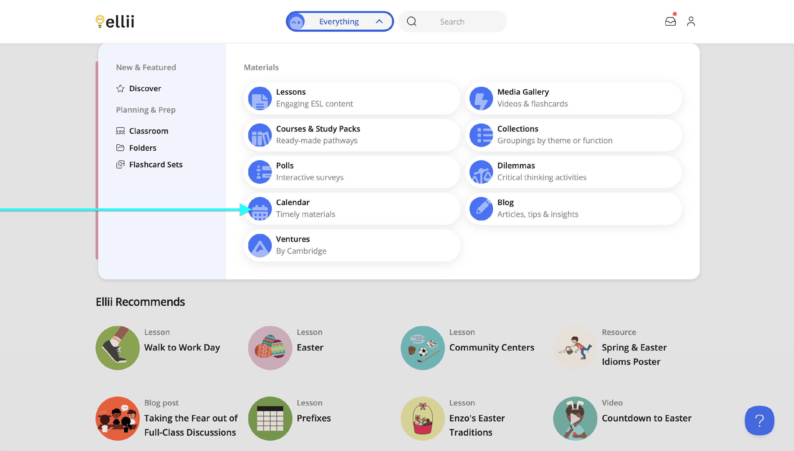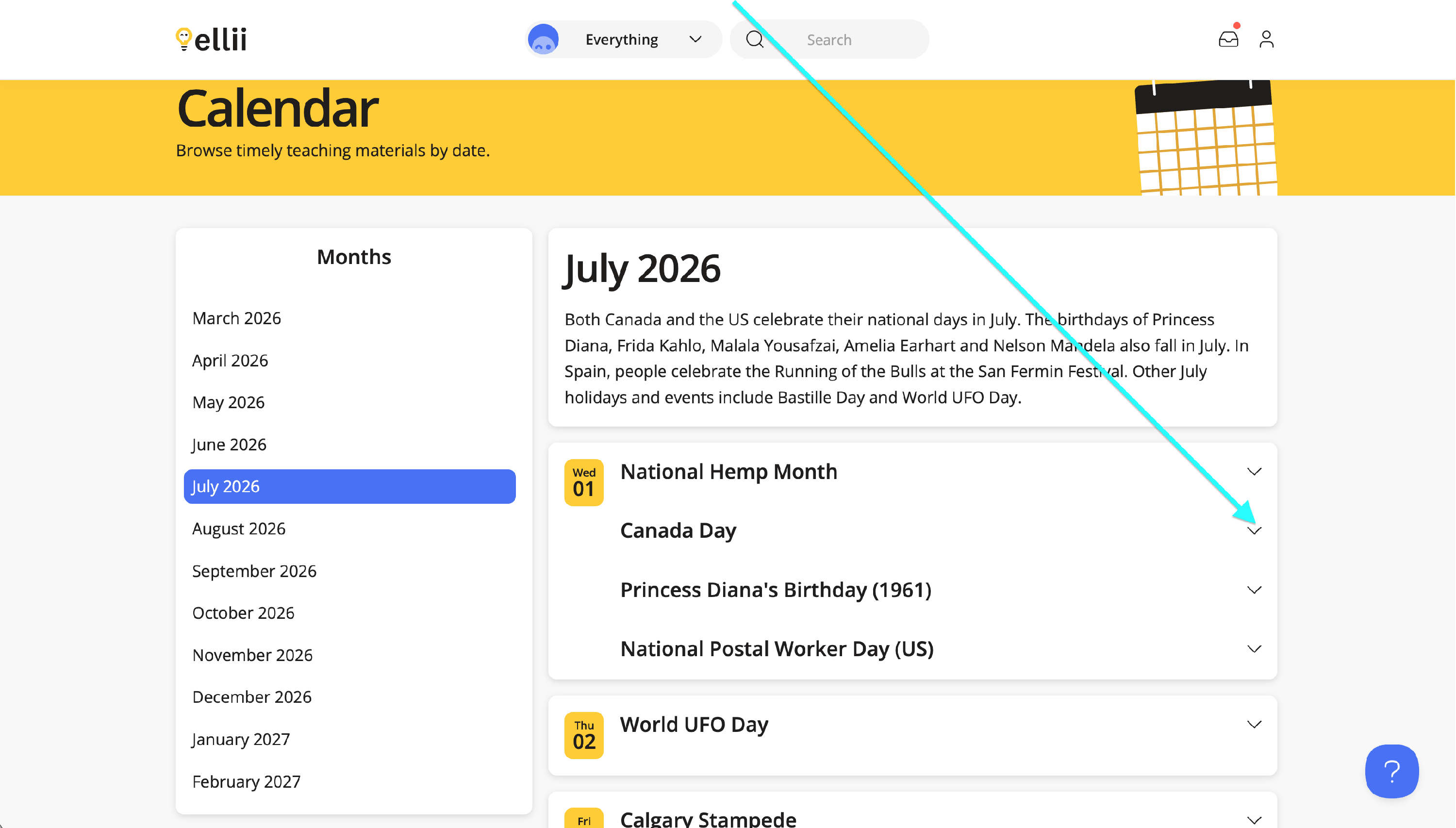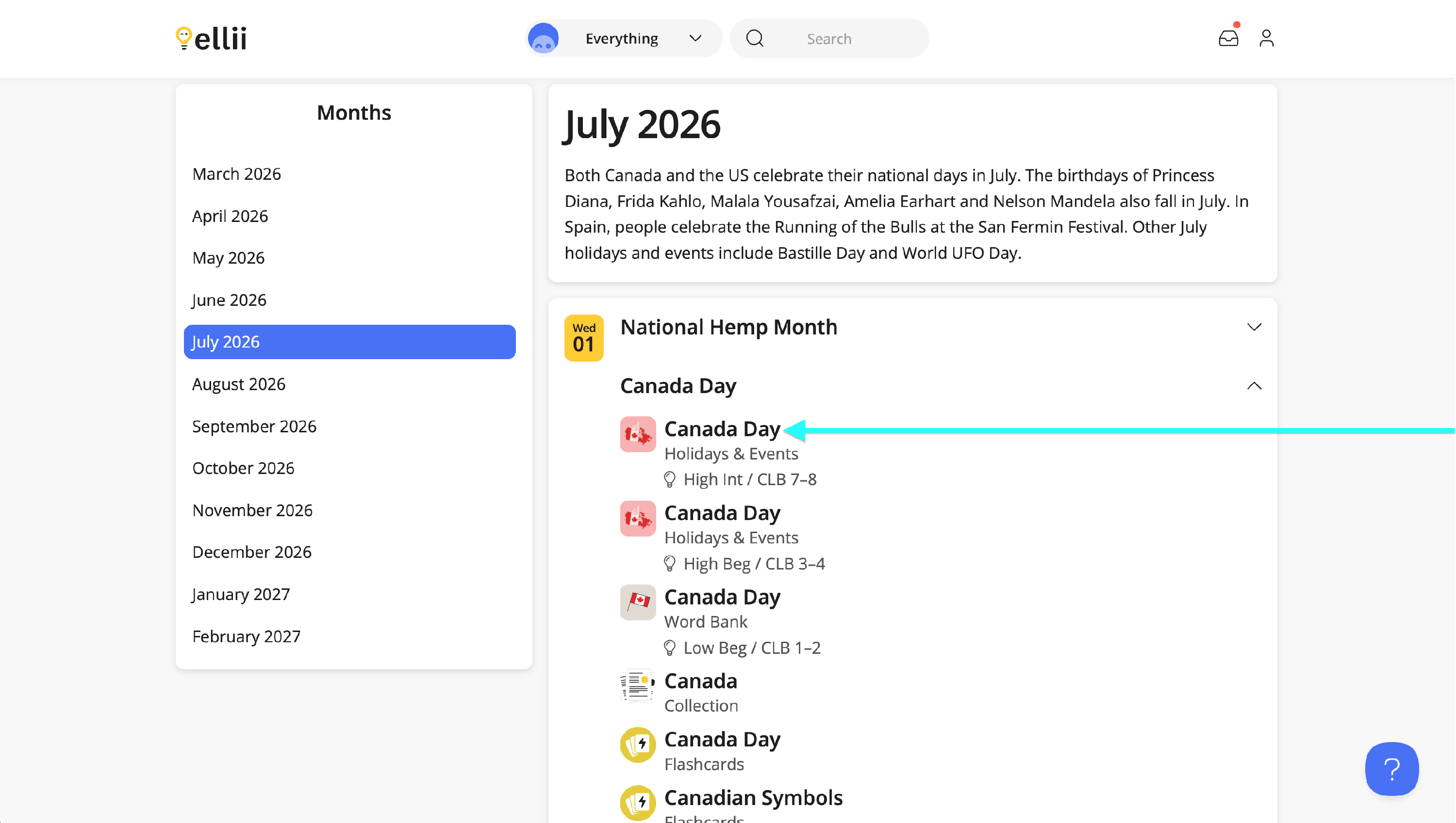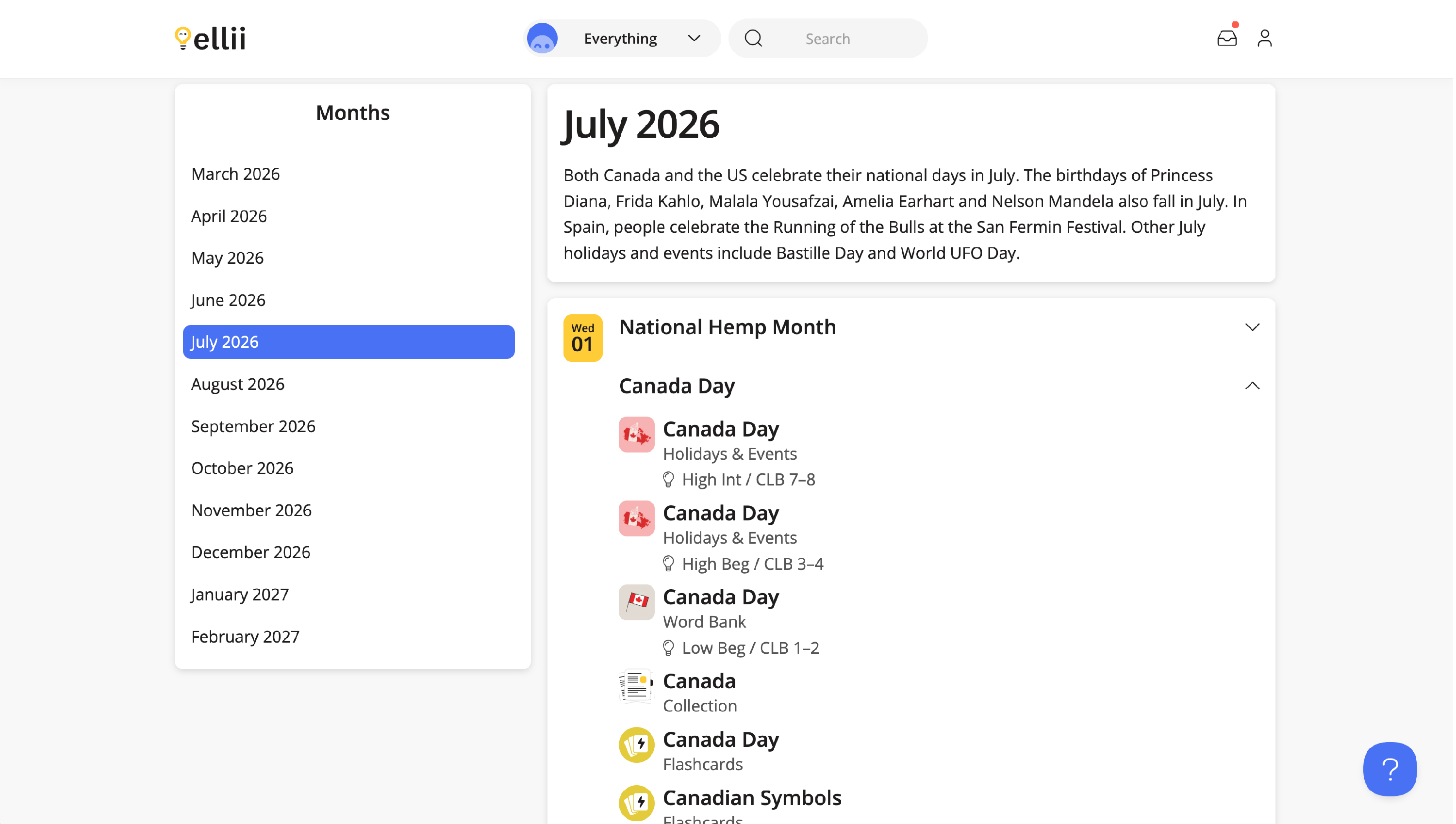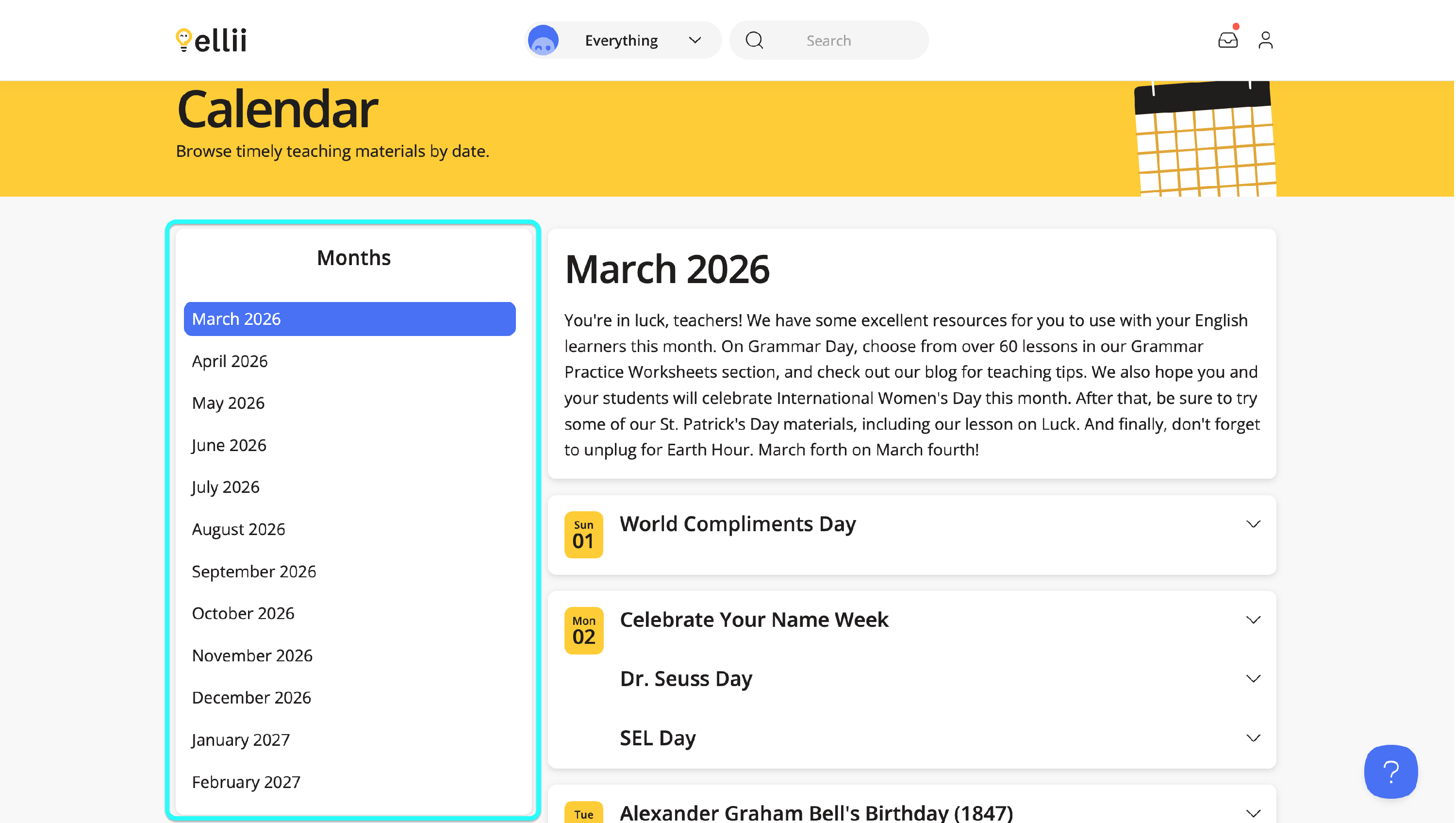 Ellii's Lesson Plan Calendar is a huge time-saver. You can use our calendar to find links to ready-made materials related to upcoming dates.